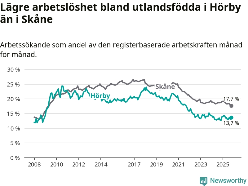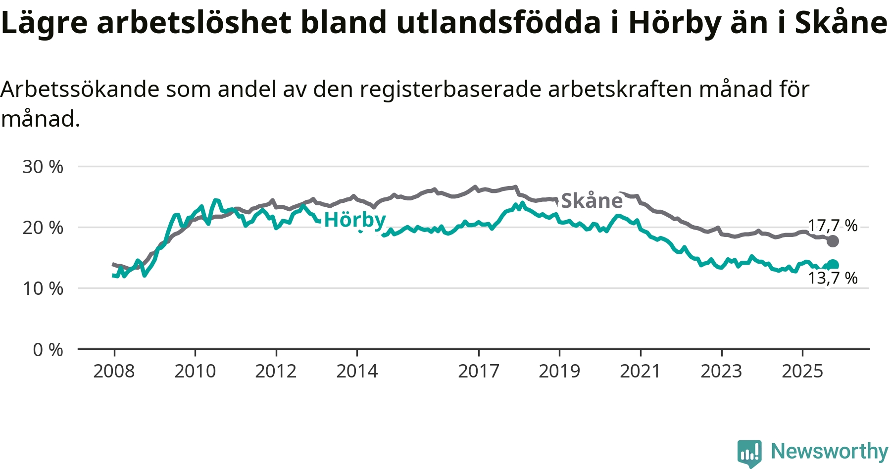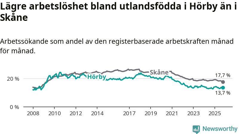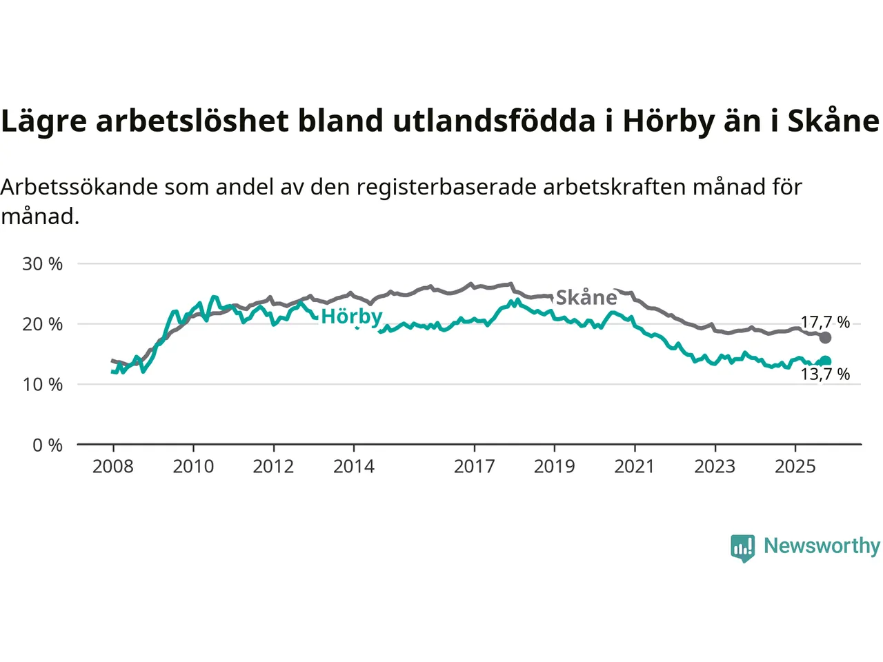 Medan arbetslösheten bland utlandsfödda alltså ökar i Hörby så minskar den i Skåne. Jämfört med oktober förra året har andelen arbetslösa utlandsfödda i länet minskat med 1,0 procentenheter (till 17,7 procent). Trots den senaste uppgången har Hörby med andra ord fortfarande lägre arbetslöshet bland utlandsfödda än Skåne.