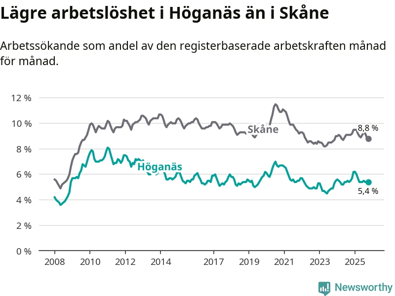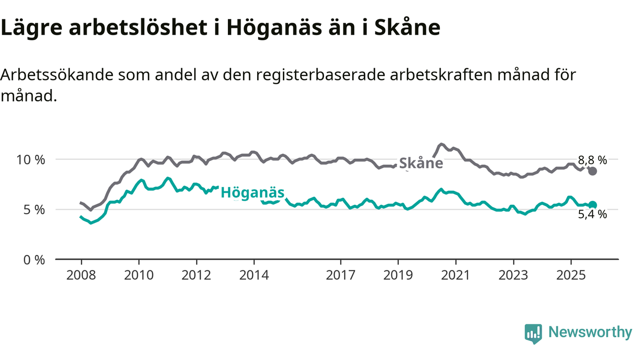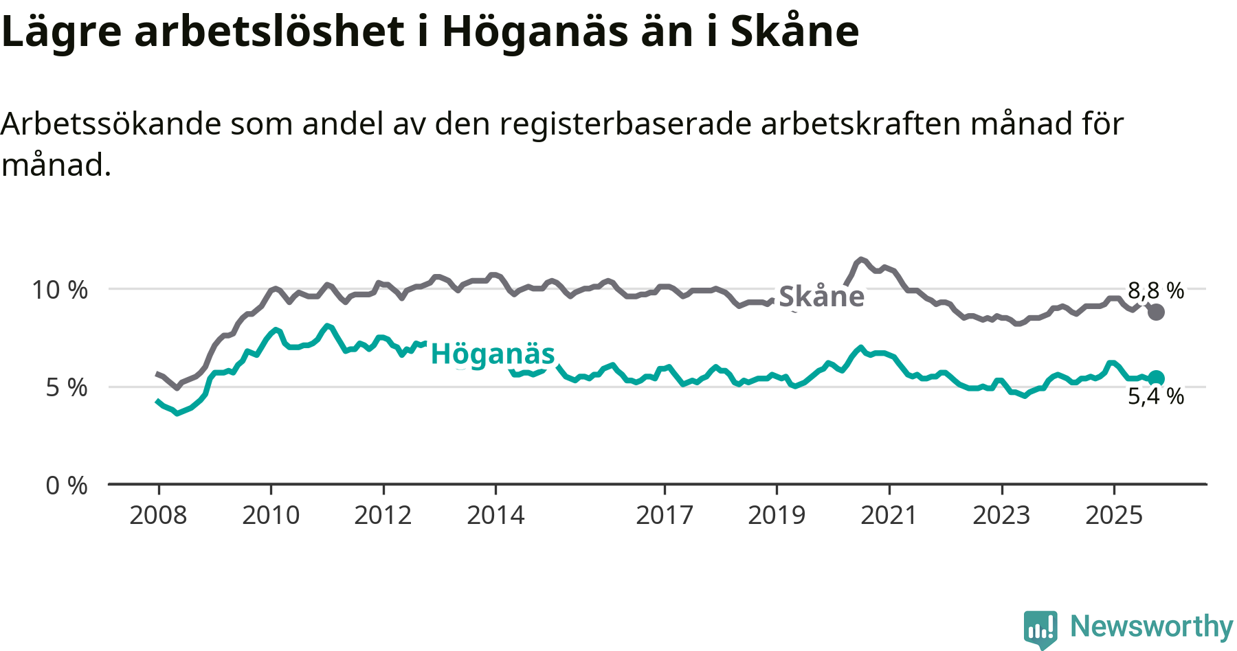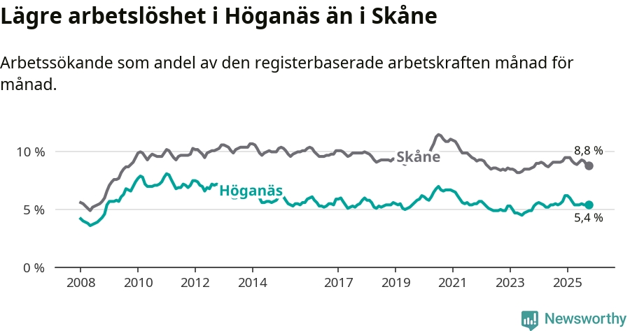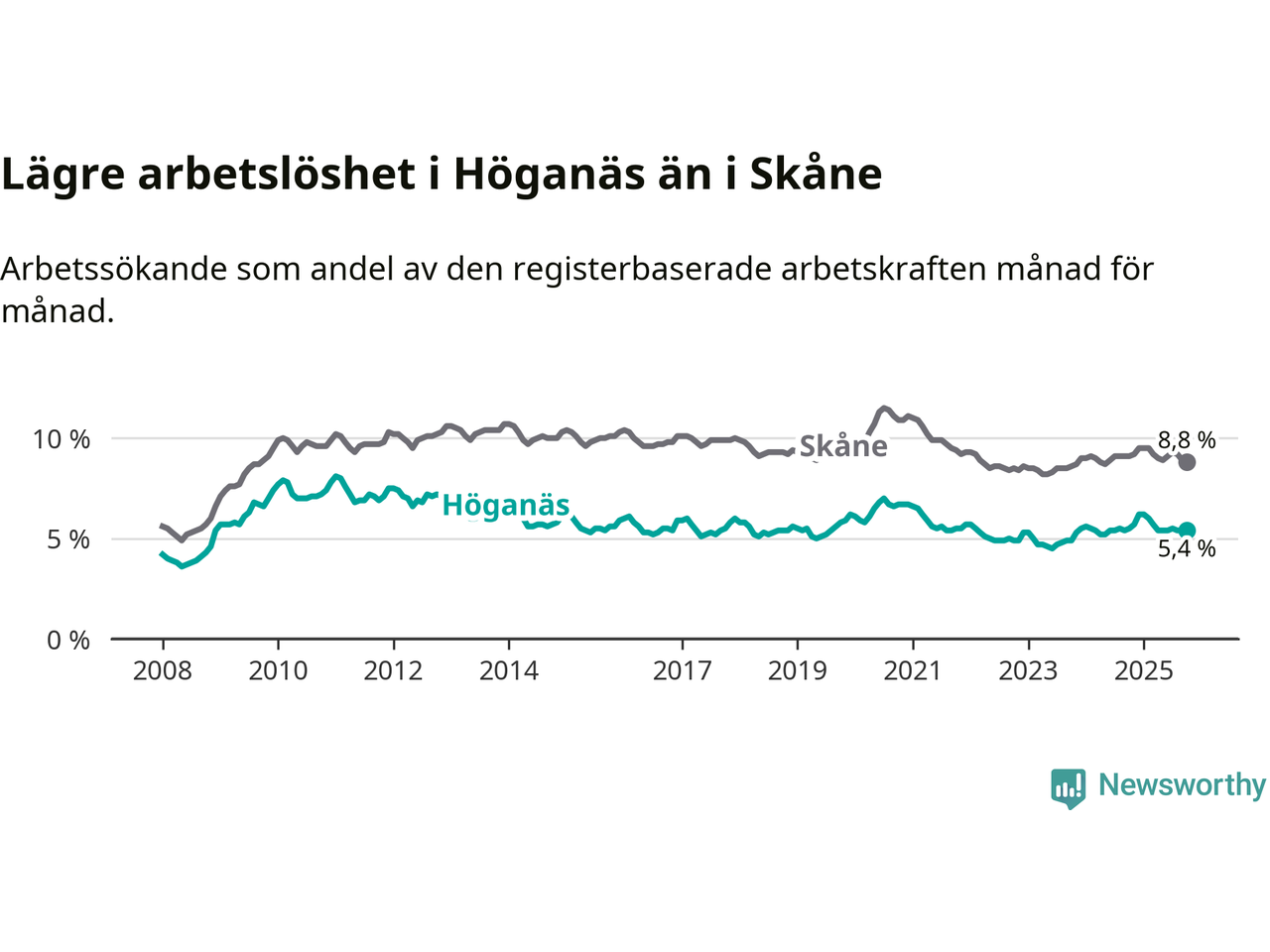 Höganäs hade redan tidigare lägre arbetslöshet än snittet i hela Skåne län och nu växer klyftan (5,4 procent i kommunen, jämfört med 8,8 procent i hela länet). Lomma har den lägsta arbetslösheten i länet (4,1 procent), medan Perstorp har den högsta (13,6 procent). För att Höganäs skulle komma ner i samma arbetslöshetsnivå som Lomma skulle 167 personer behöva sysselsättas.