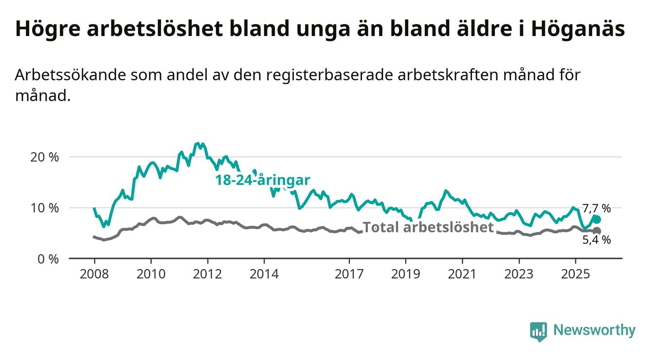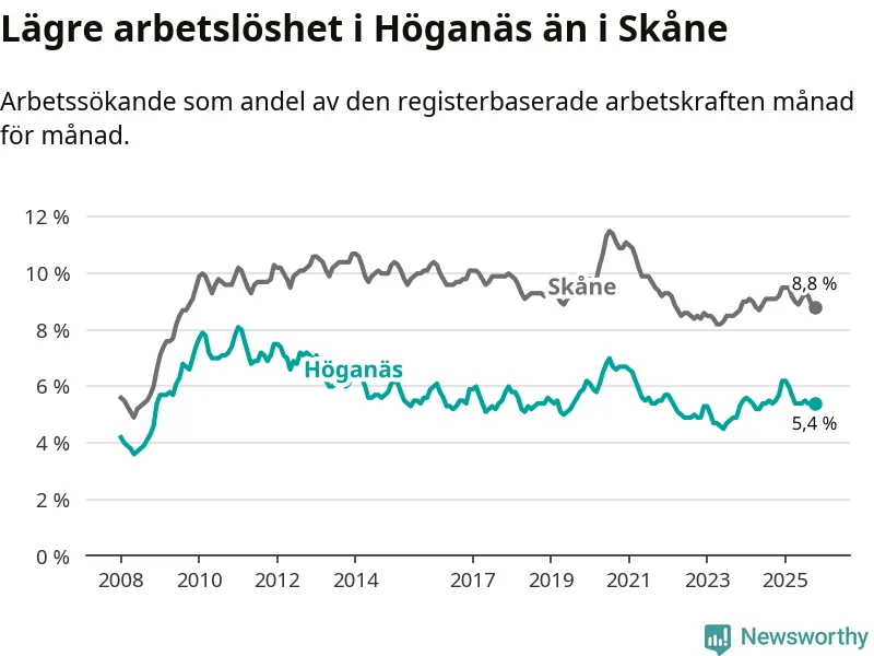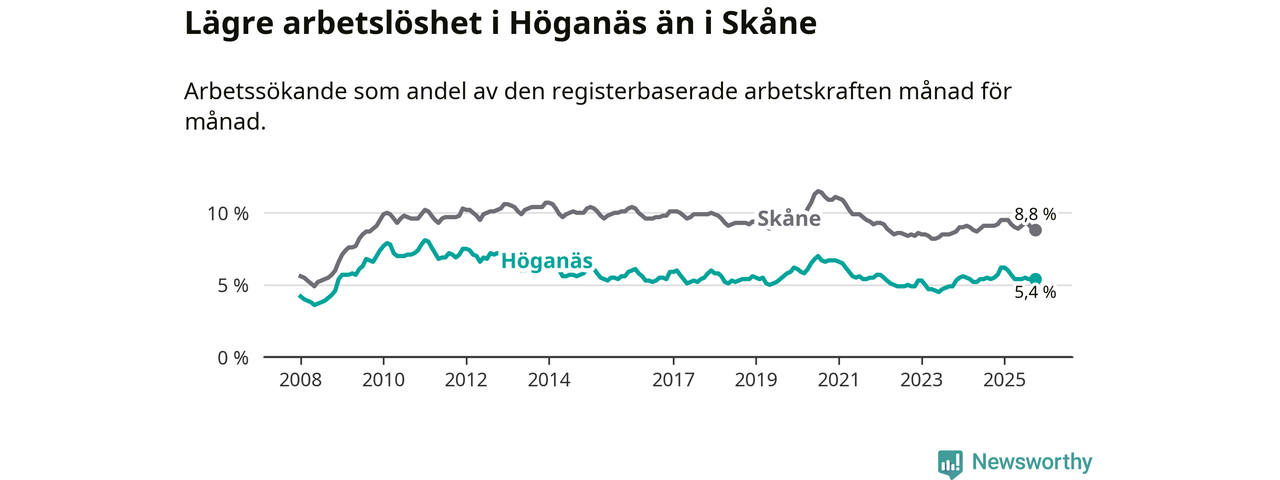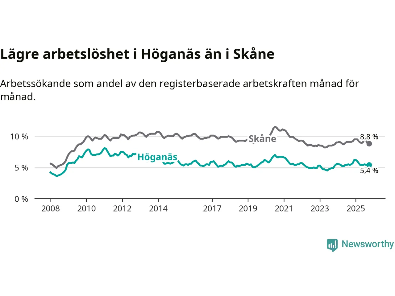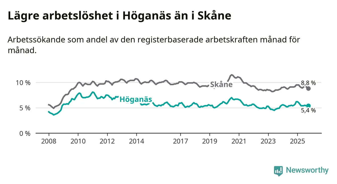 Under oktober månad rapporterade Höganäs kommun en total arbetslöshet på 5,4 procent. Det är en minskning jämfört med samma tidpunkt i fjol (−0,1 procentenheter). Även i Skåne län sjunker arbetslösheten .