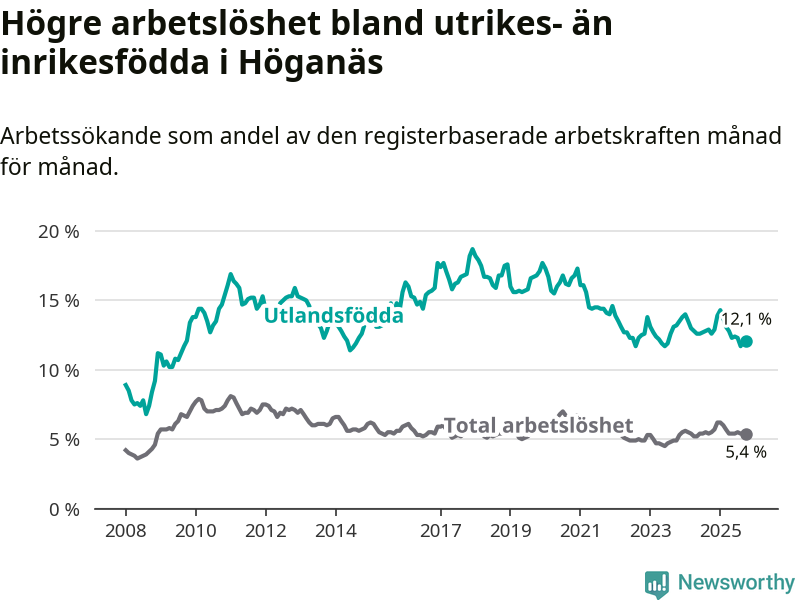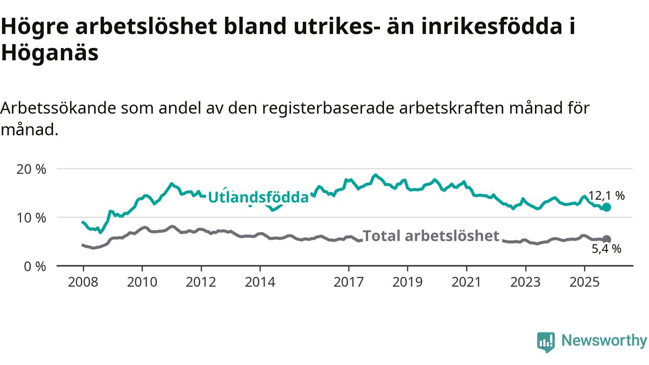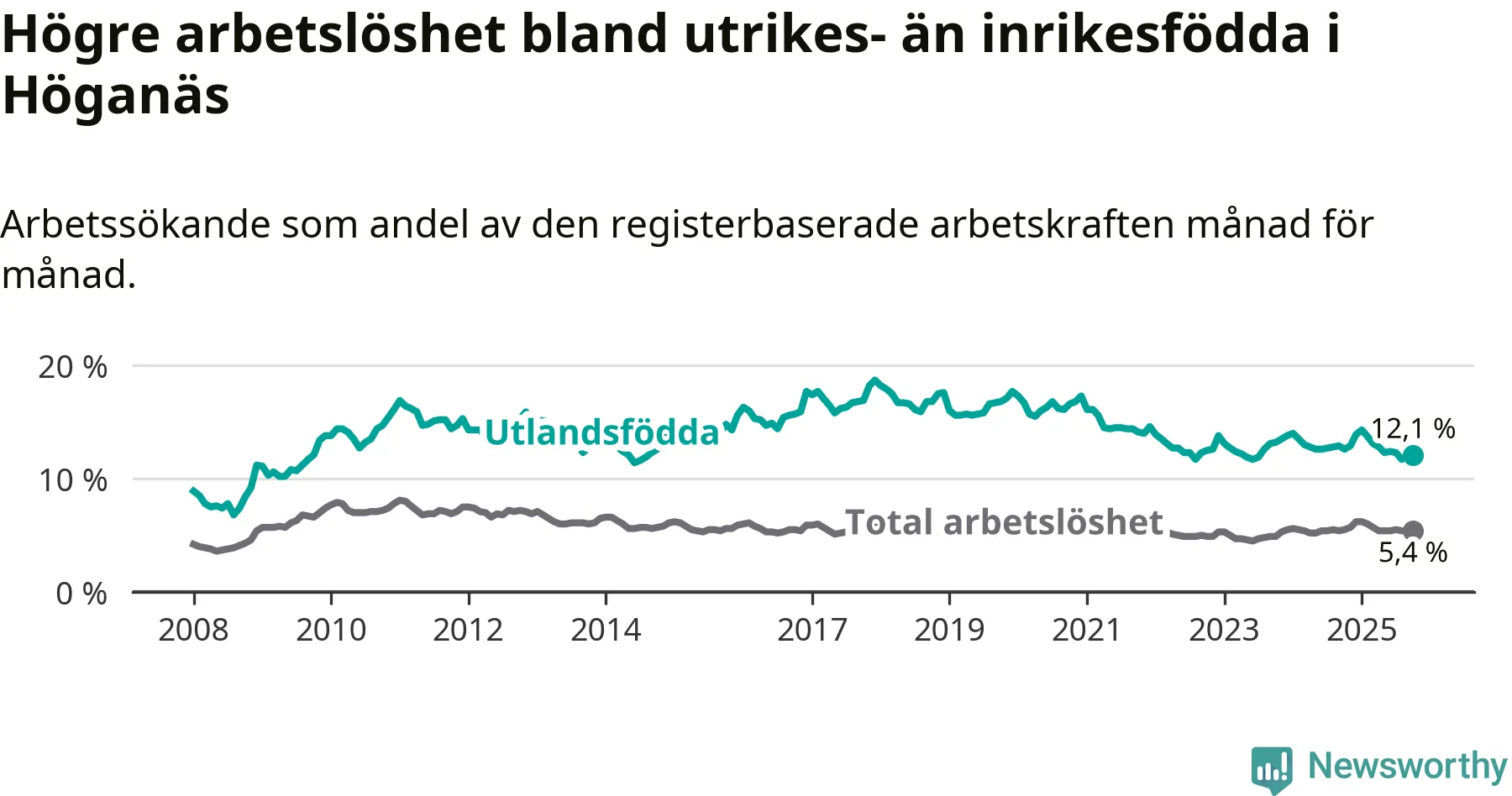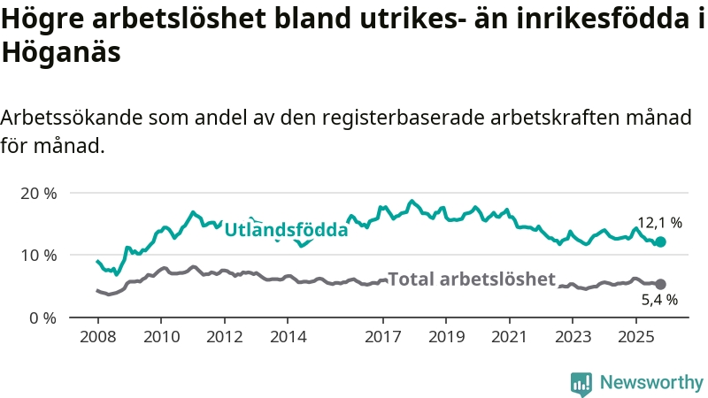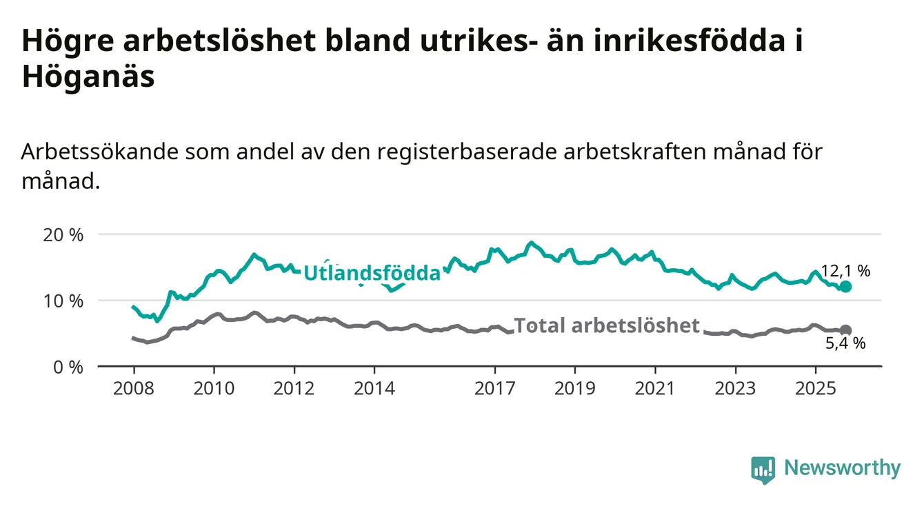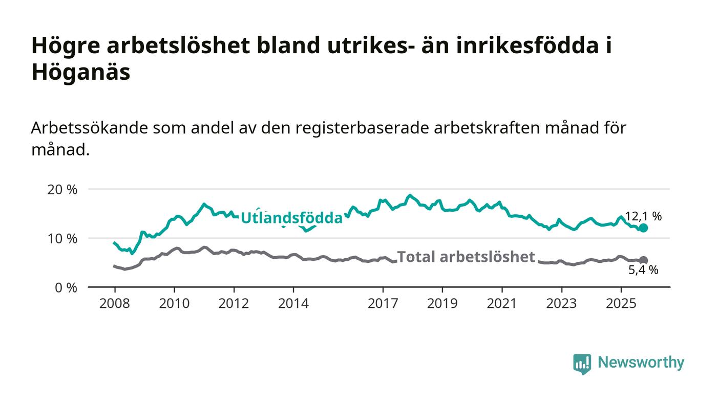 Arbetslösheten bland utlandsfödda var 12,1 procent i Höganäs under oktober månad, motsvarande 263 av 2 174 personer. Det är 0,5 procentenheter färre än vid samma tidpunkt i fjol (−9 om man räknar personer). Därmed är de utlandsföddas arbetslöshet lägre än vid samma tidpunkt i fjol för sjätte månaden i följd.