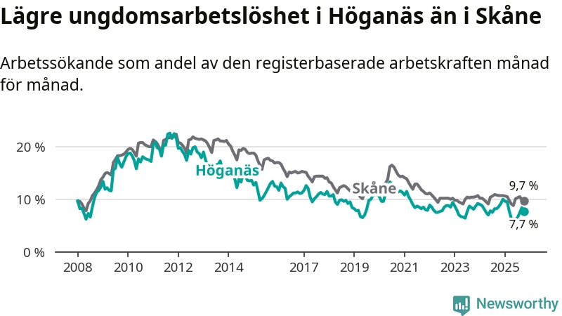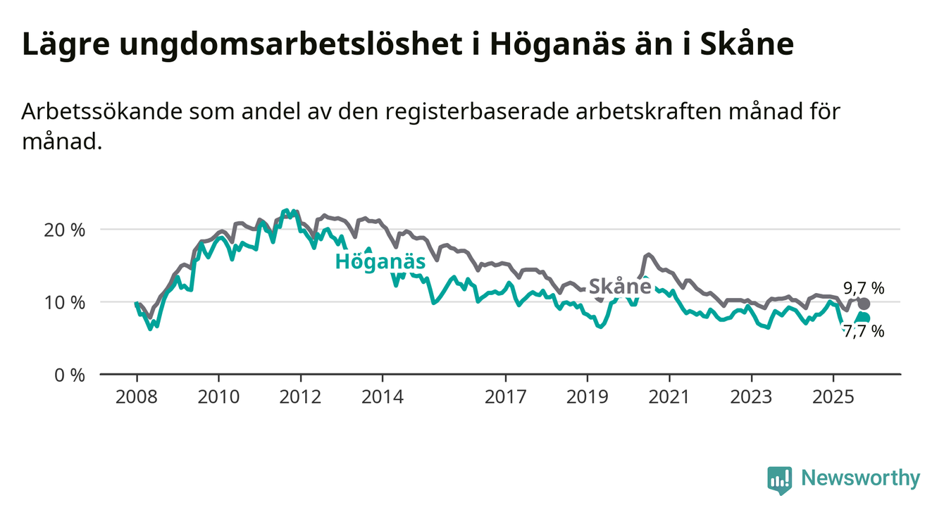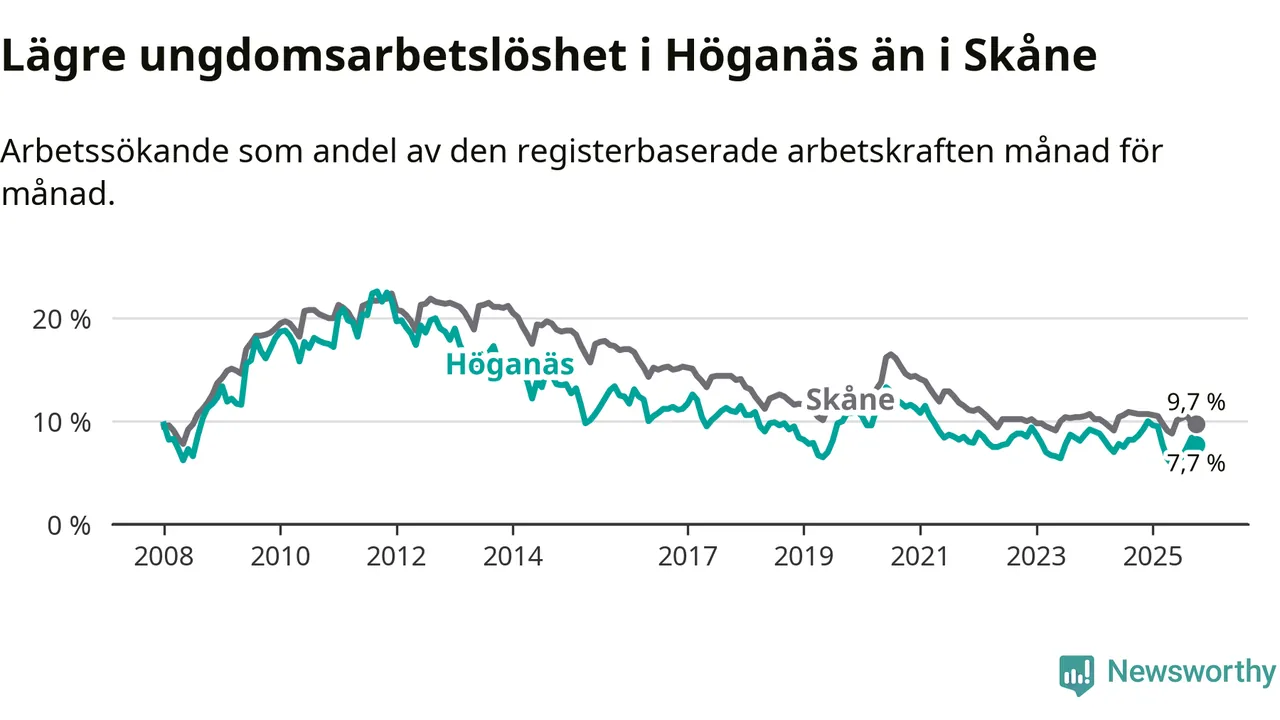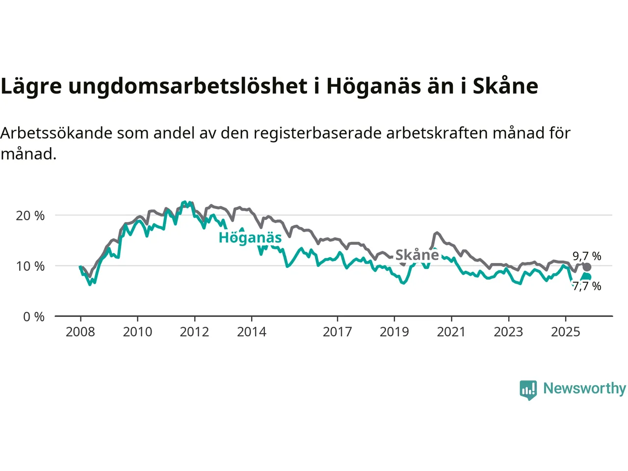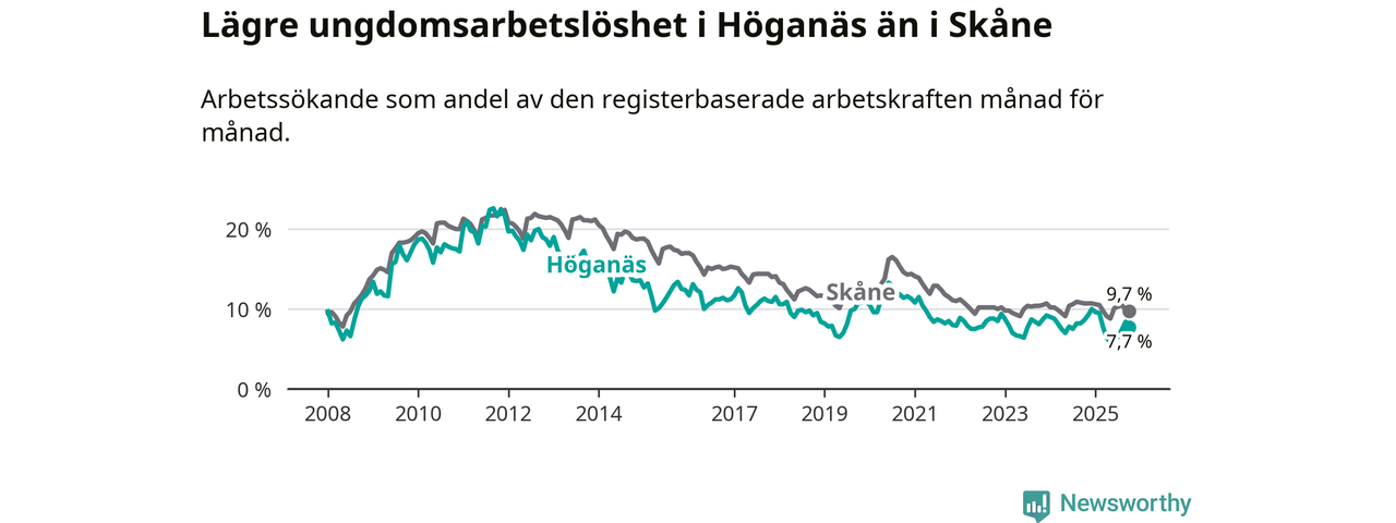 Precis som den totala arbetslösheten ligger ungdomsarbetslösheten i Höganäs lägre än i Skåne som helhet. Skillnaden mellan kommunen och länet är 2,0 procentenheter.