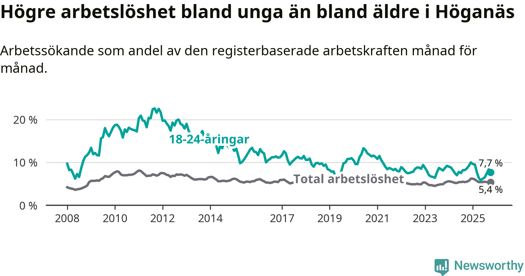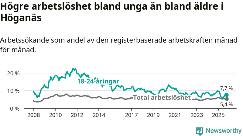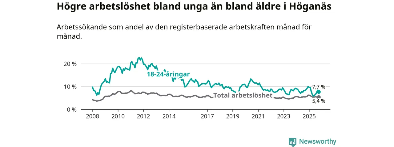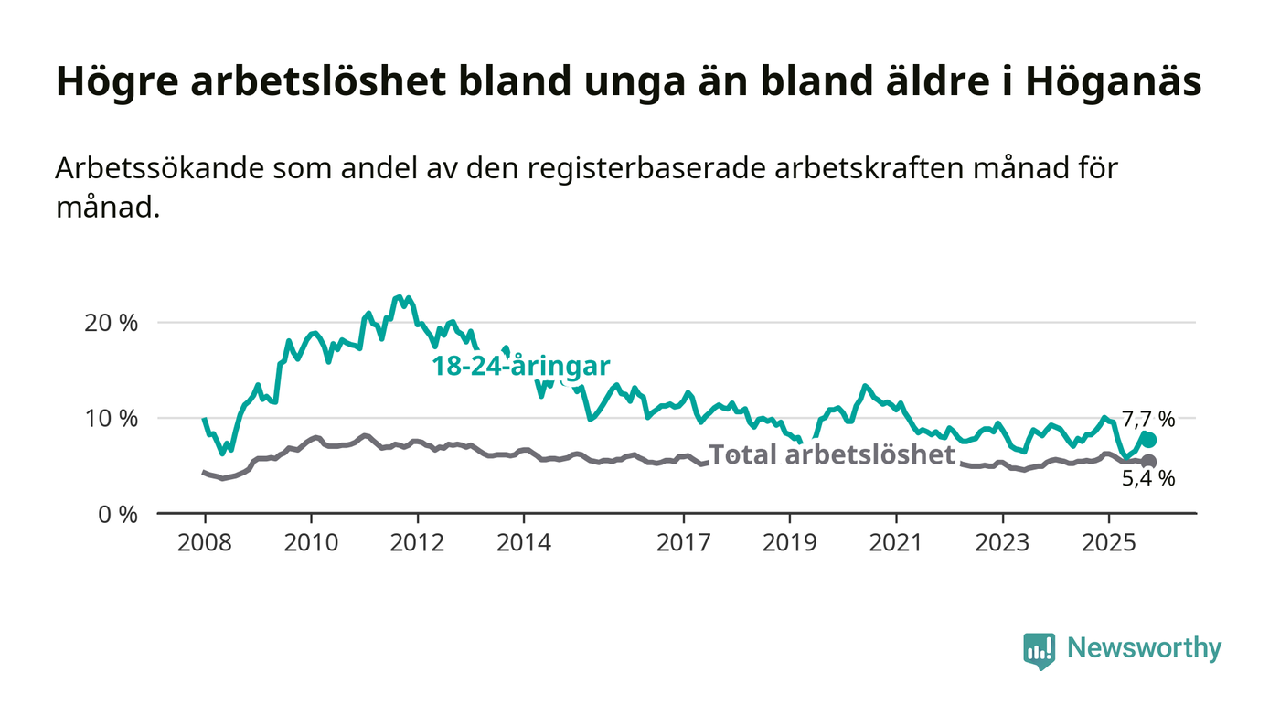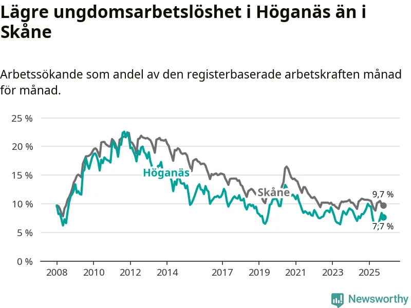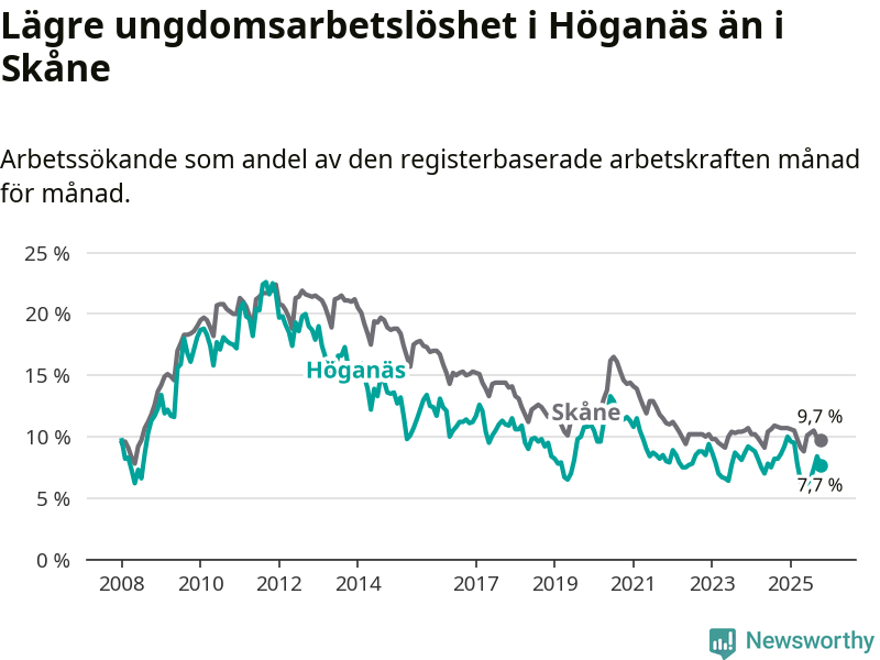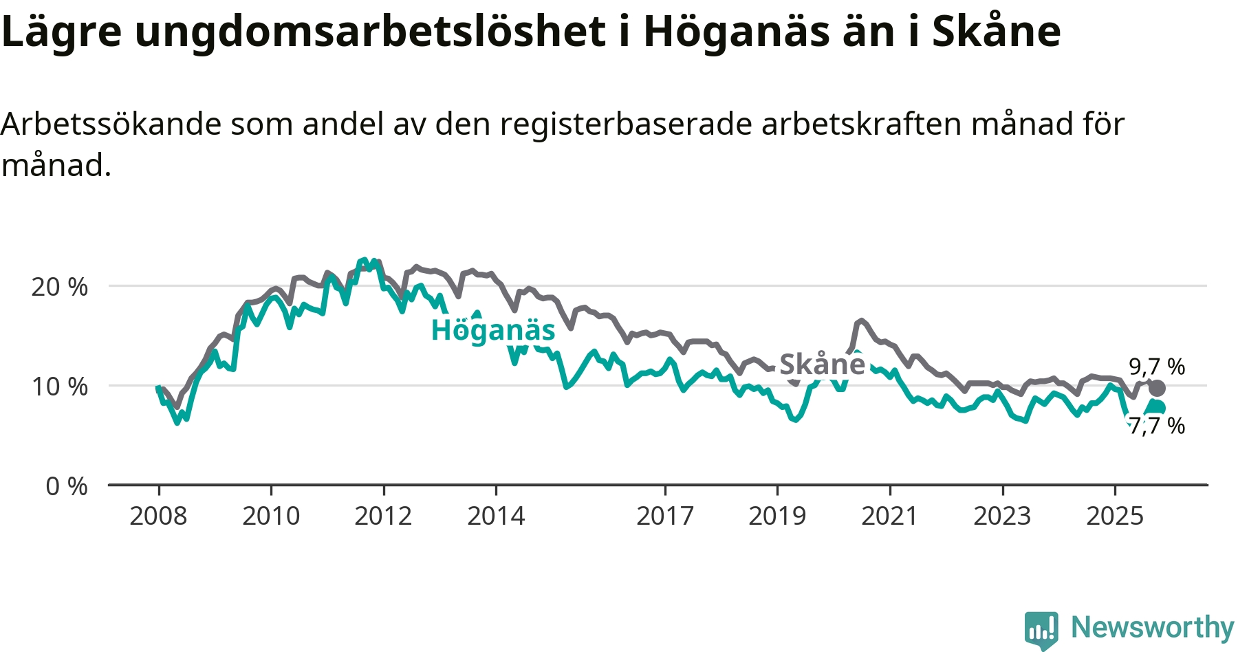 Precis som den totala arbetslösheten ligger ungdomsarbetslösheten i Höganäs lägre än i Skåne som helhet. Skillnaden mellan kommunen och länet är 2,0 procentenheter.
