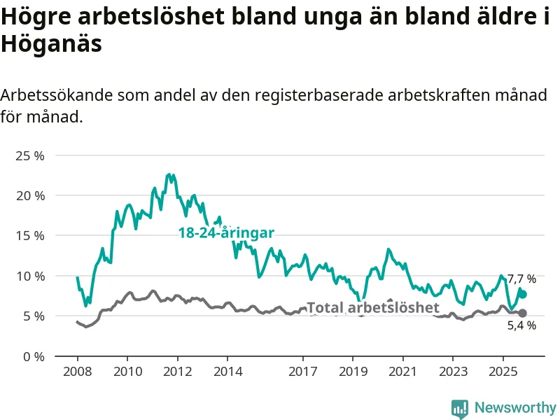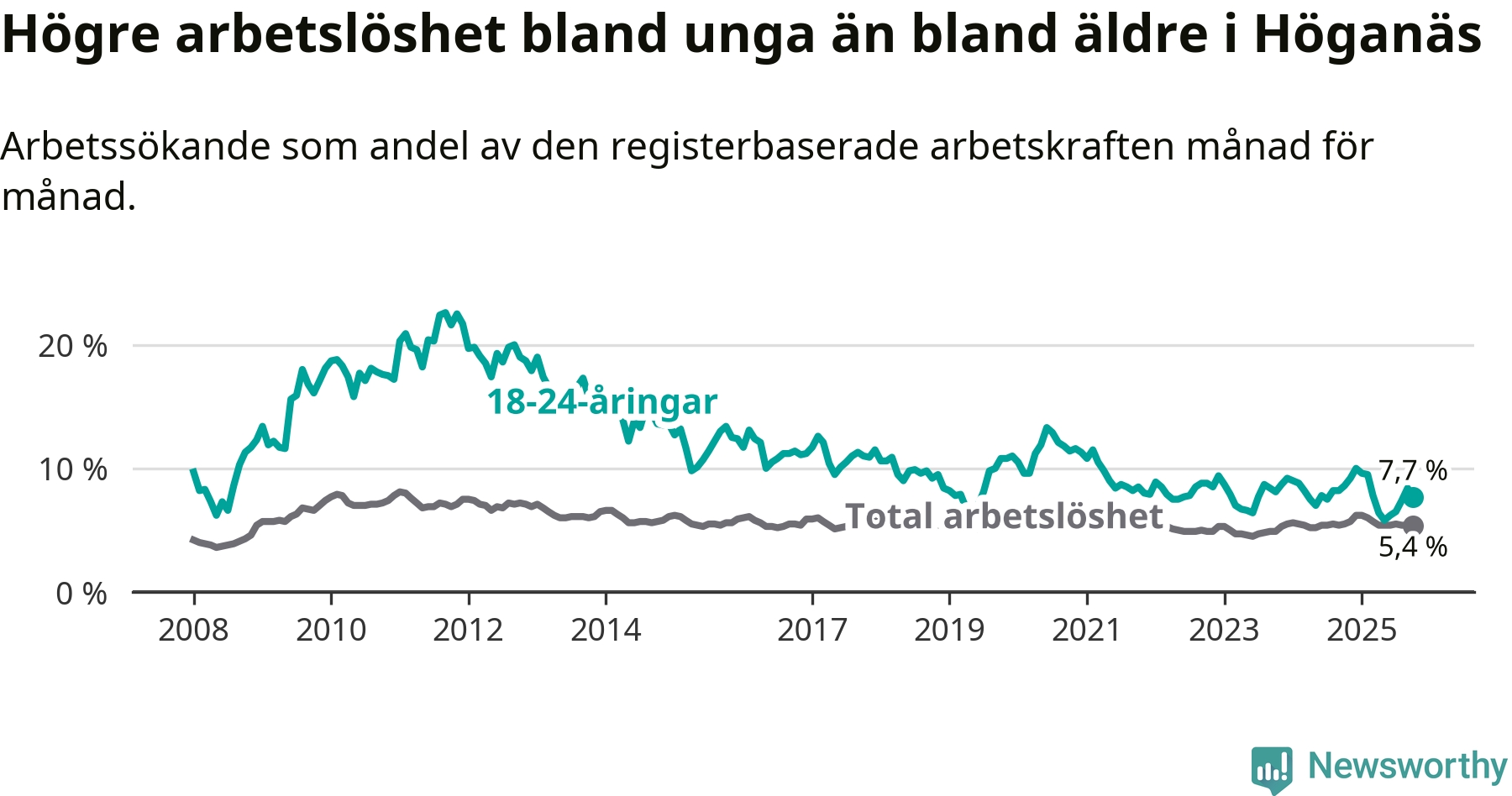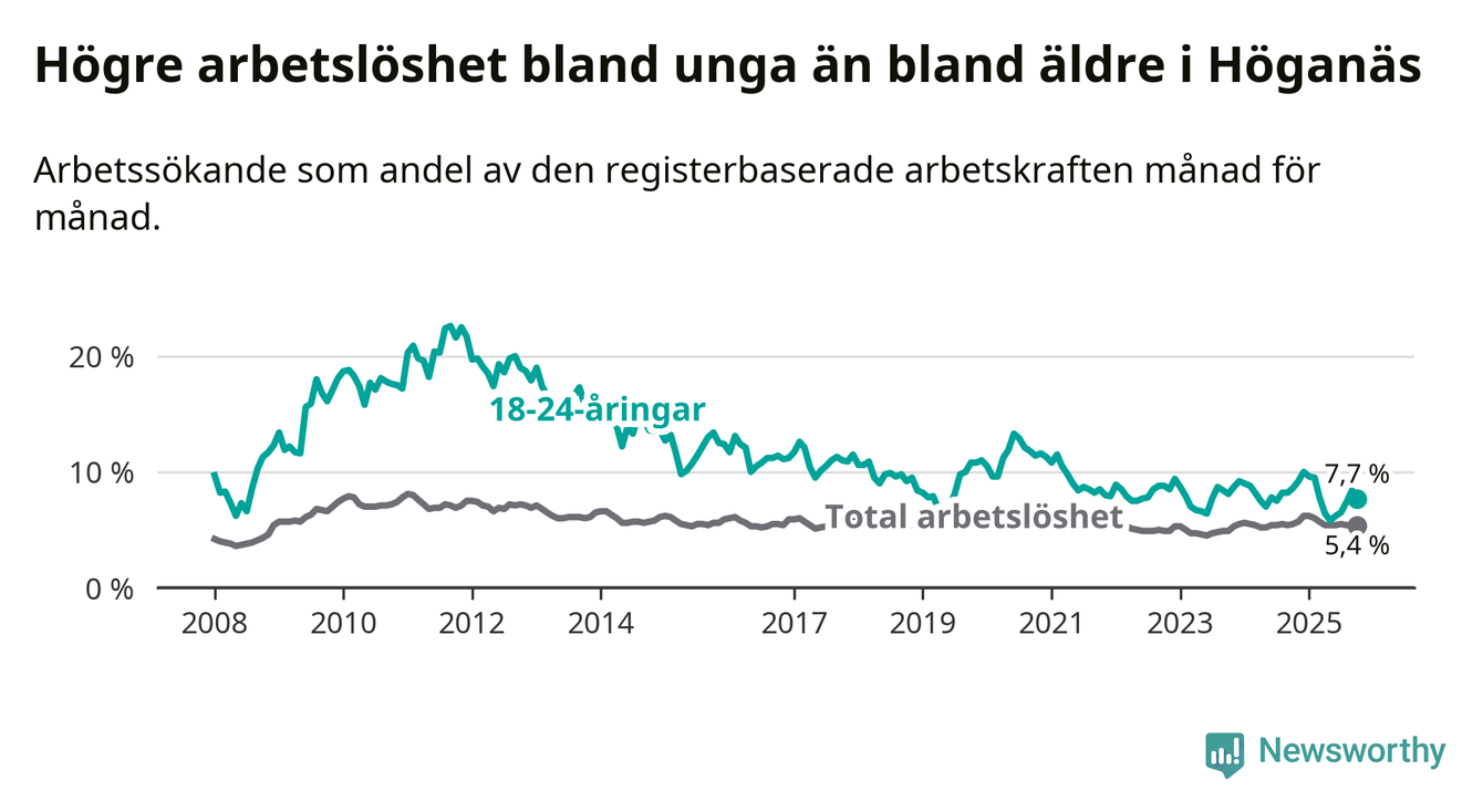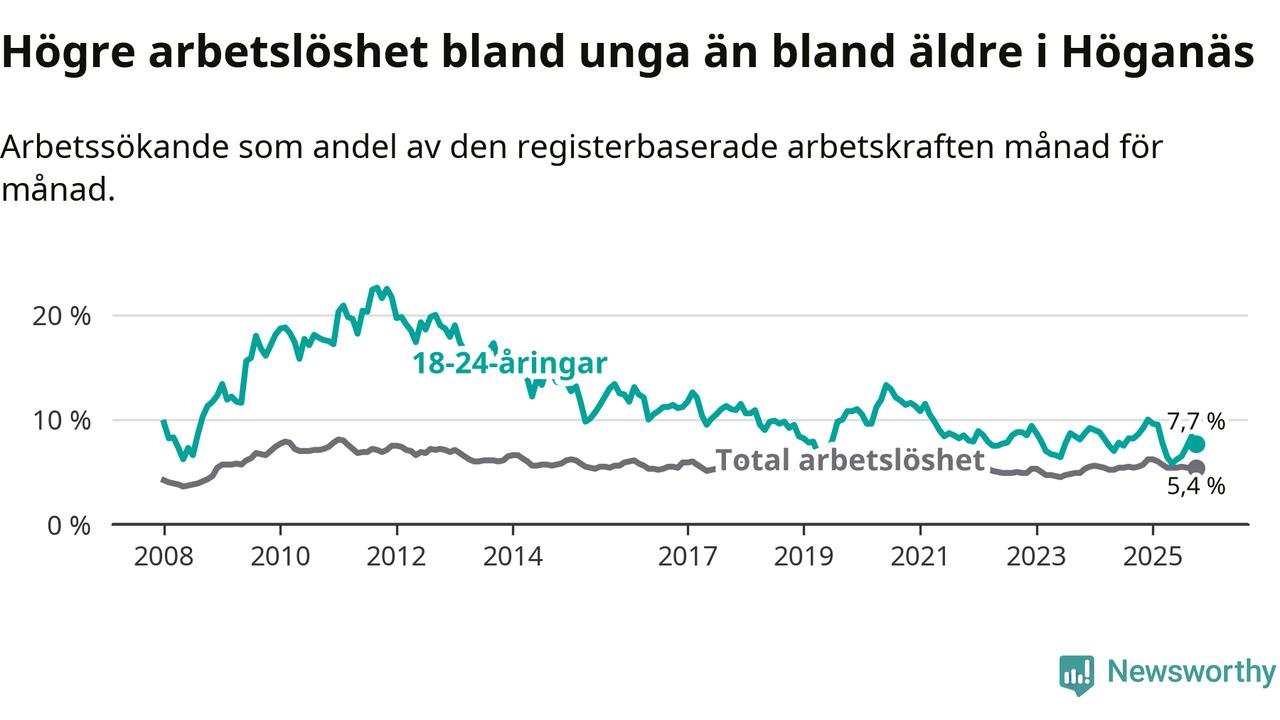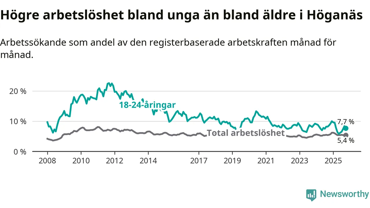 Precis som den totala arbetslösheten ligger ungdomsarbetslösheten i Höganäs lägre än i Skåne som helhet. Skillnaden mellan kommunen och länet är 2,0 procentenheter.