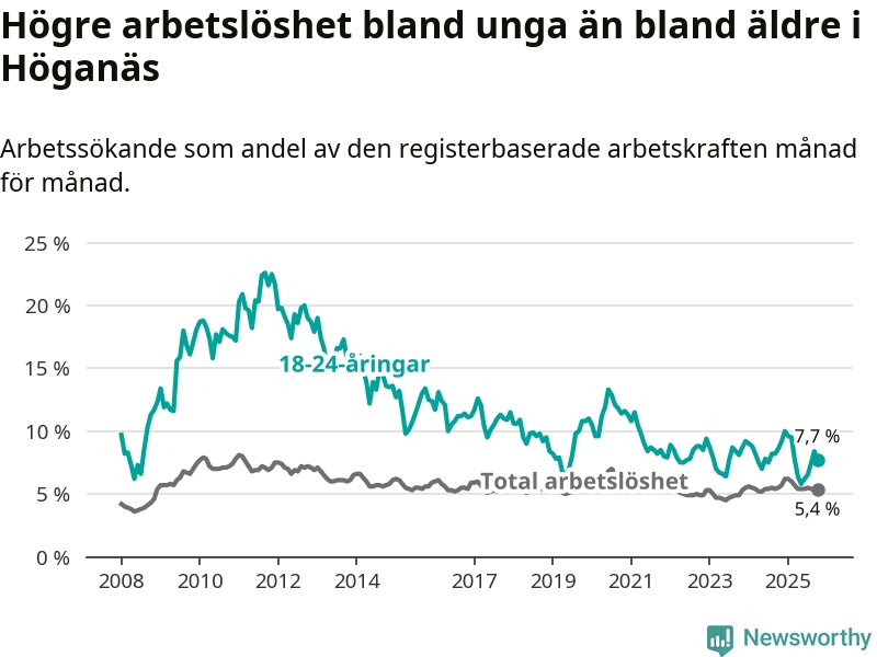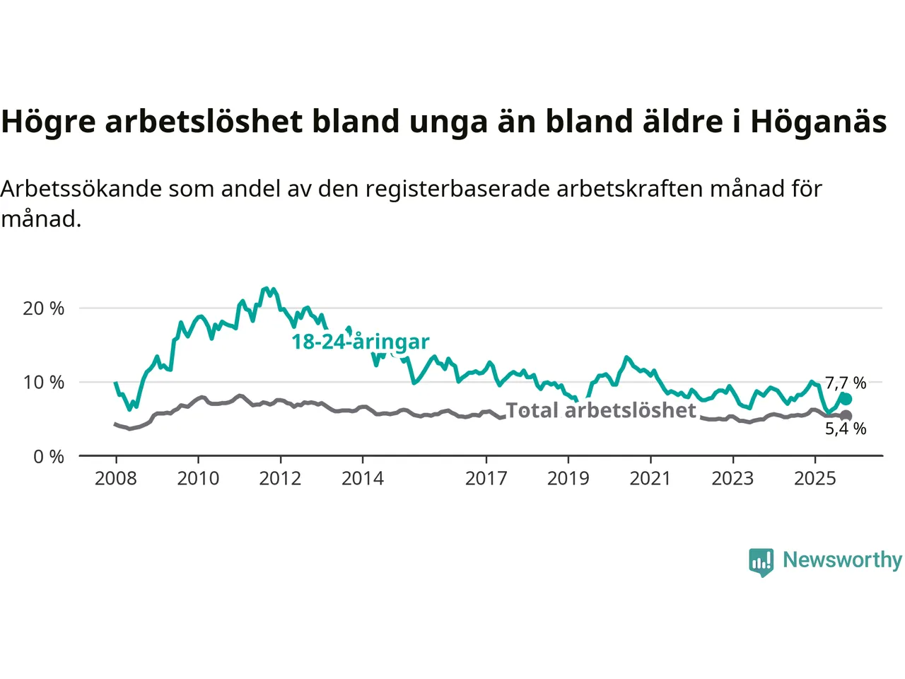 Precis som den totala arbetslösheten sjunker arbetslösheten bland unga (−0,9 procentenheter). I oktober var 7,7 procent av 18–24-åringarna inskrivna som arbetssökande (motsvarande 88 personer). Mäter vi antalet inskrivna ser vi en minskning med fem personer på ett års sikt.