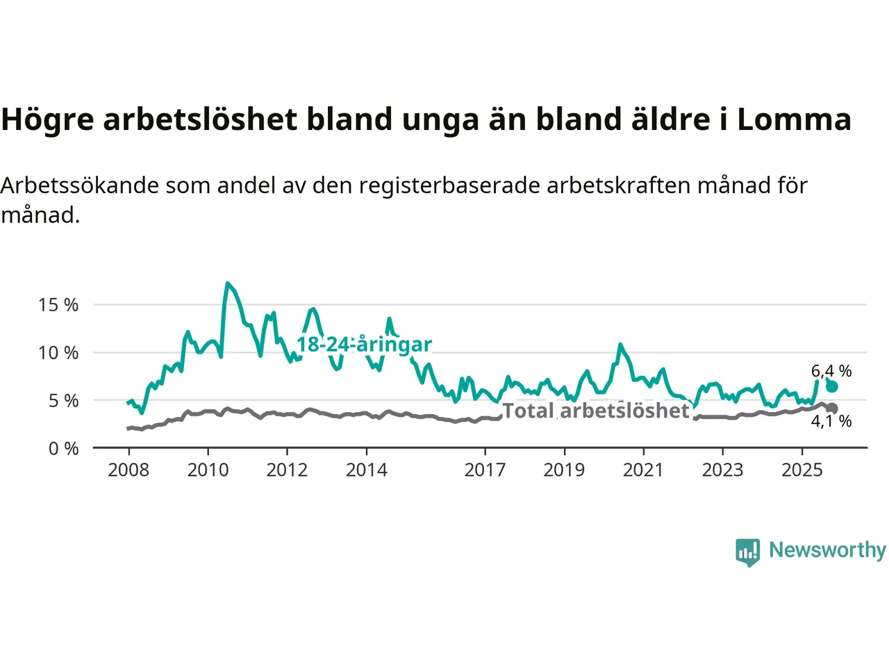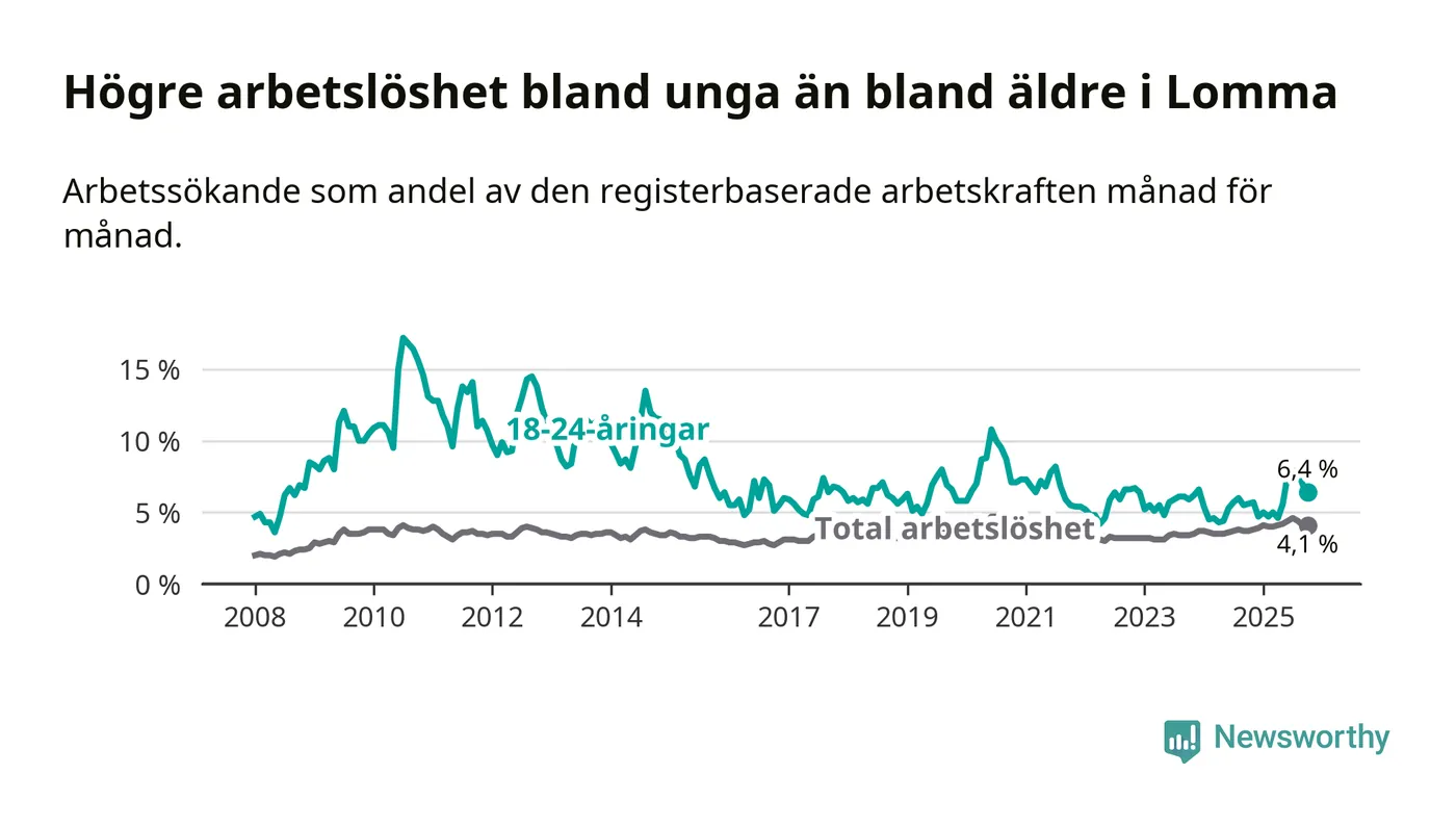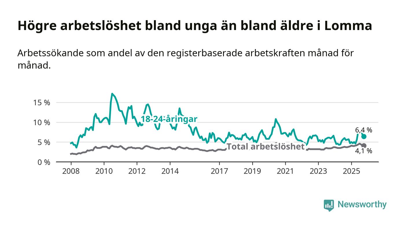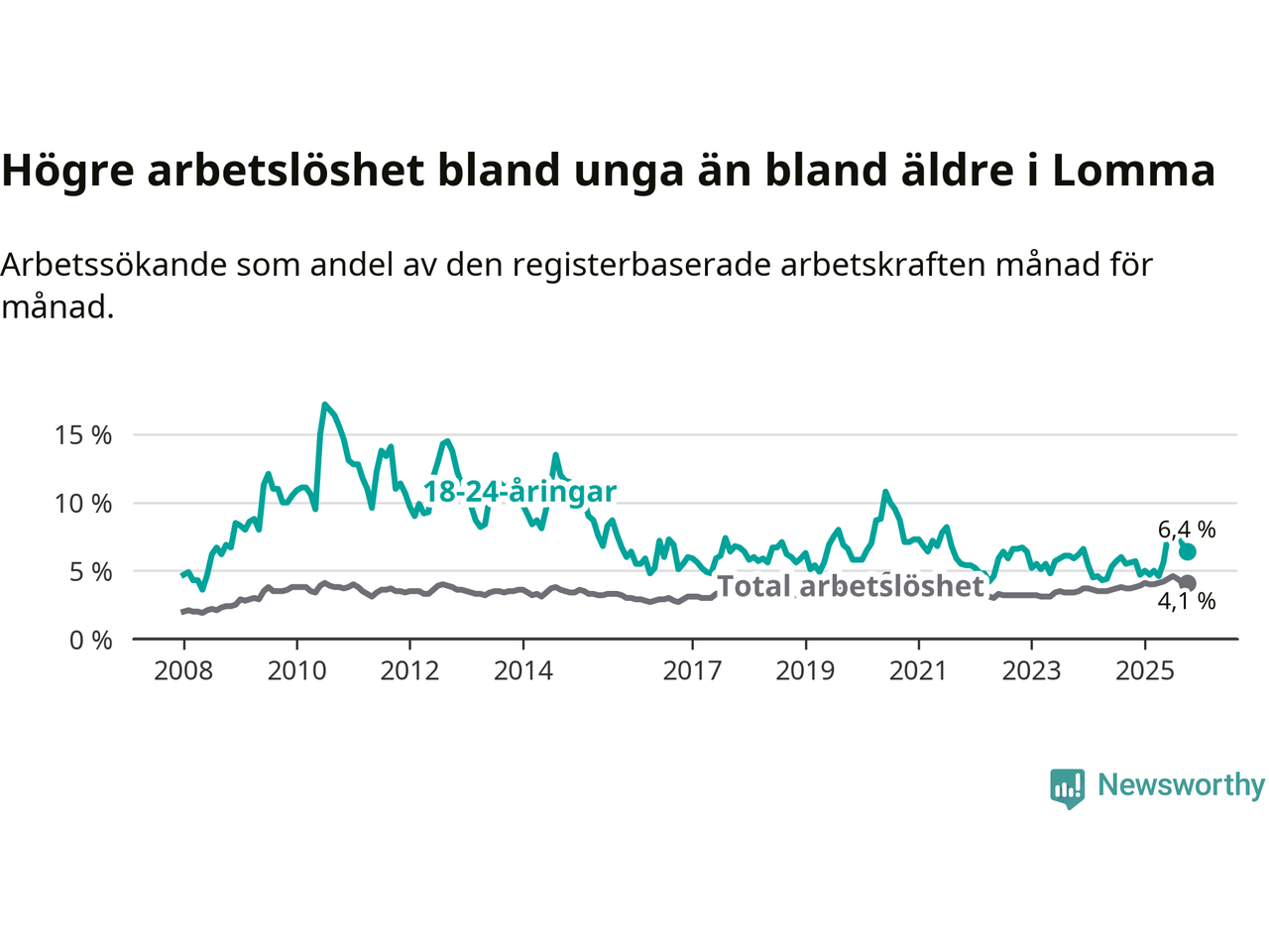 I och med den senaste månadens uppgång har de ungas arbetslöshet i Lomma stigit nio månader i följd (upp från 5,0 procent i januari till 6,4 procent nu).