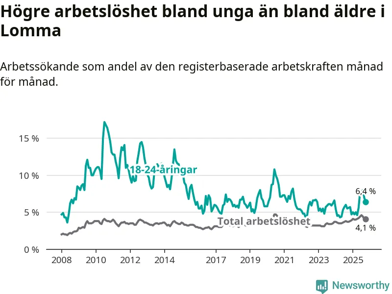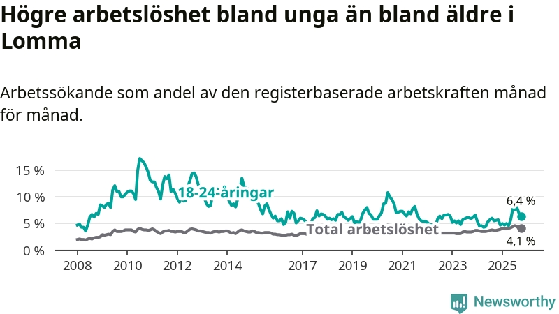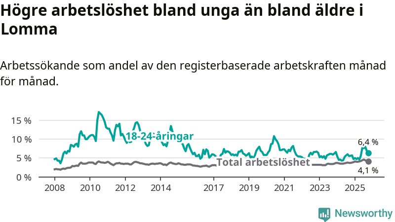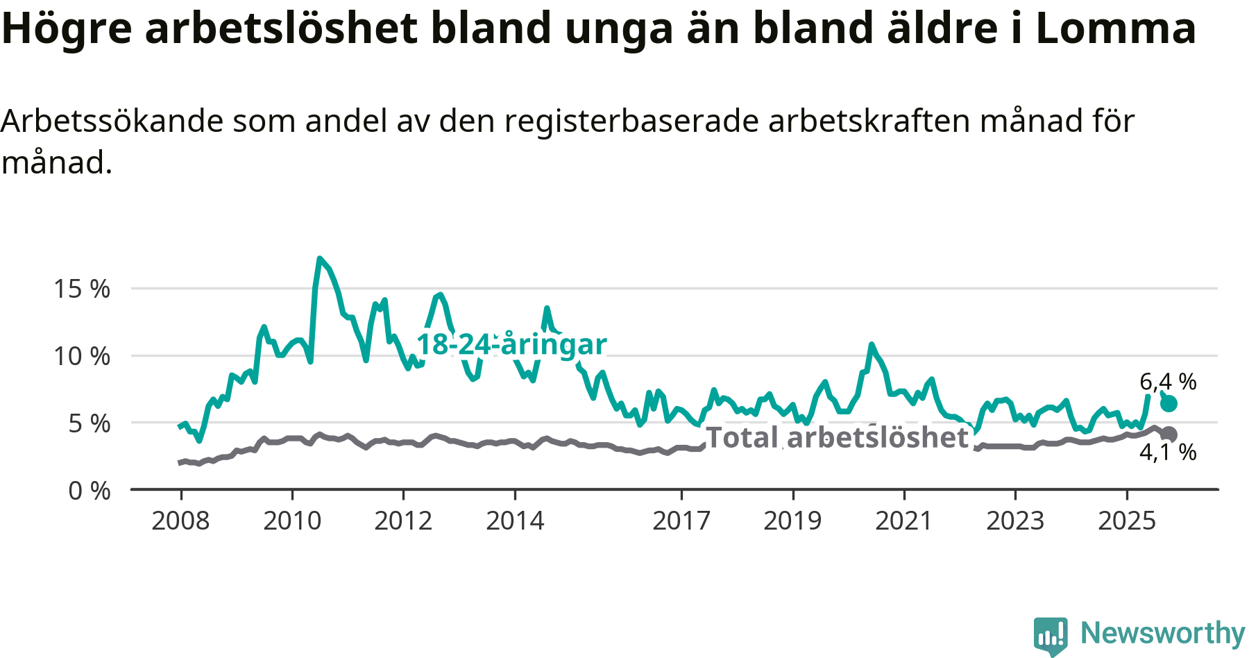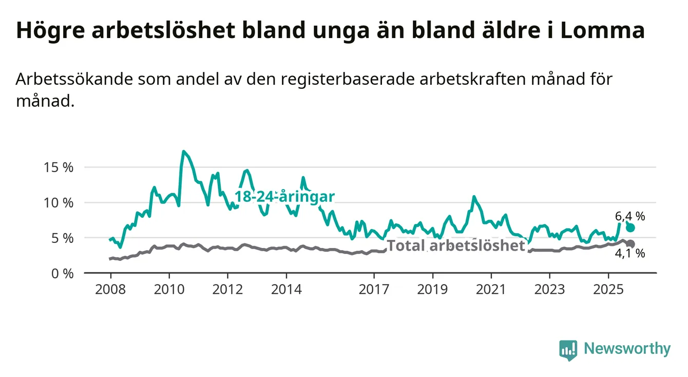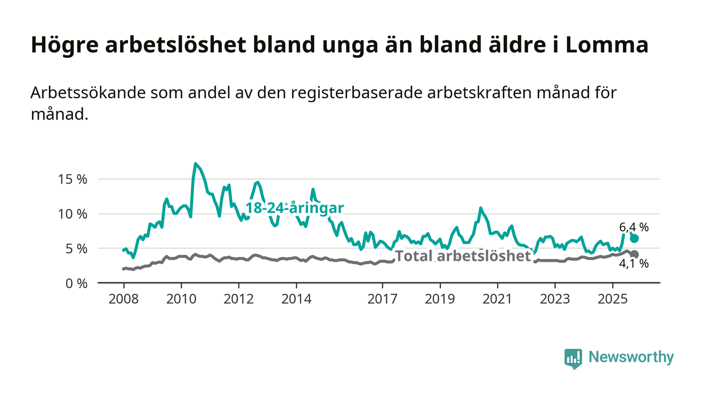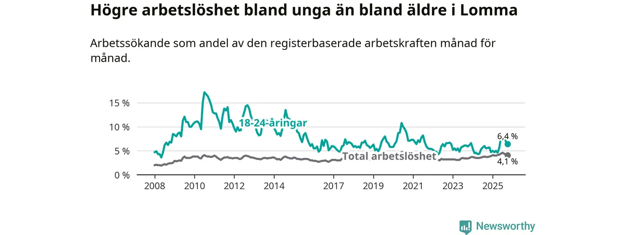 I och med den senaste månadens uppgång har de ungas arbetslöshet i Lomma stigit nio månader i följd (upp från 5,0 procent i januari till 6,4 procent nu).