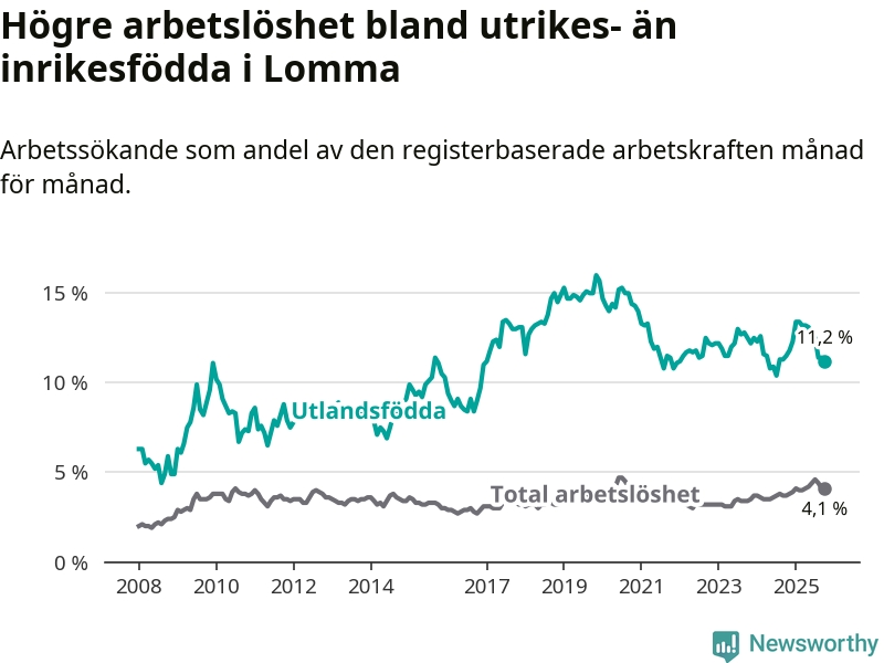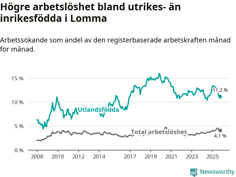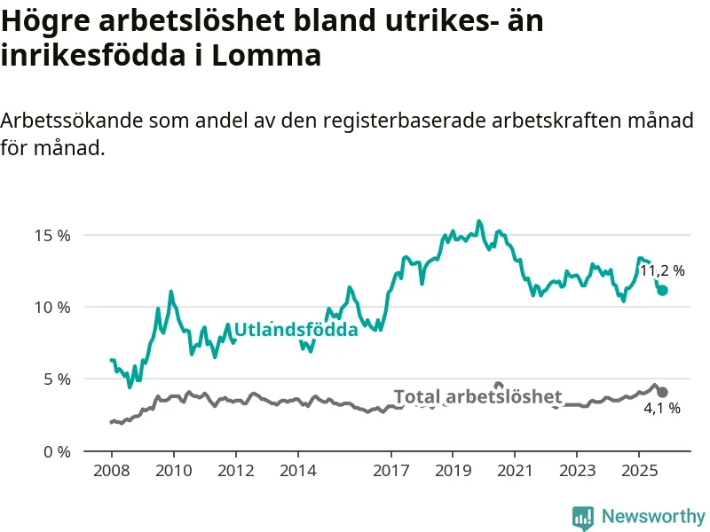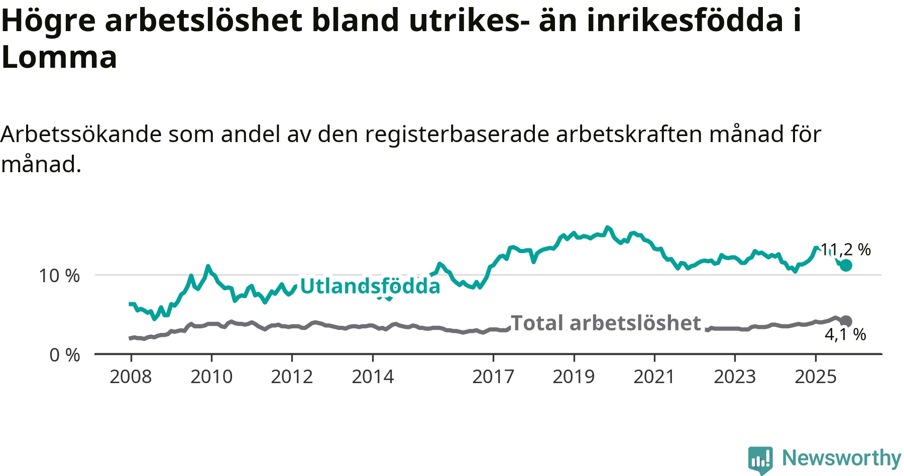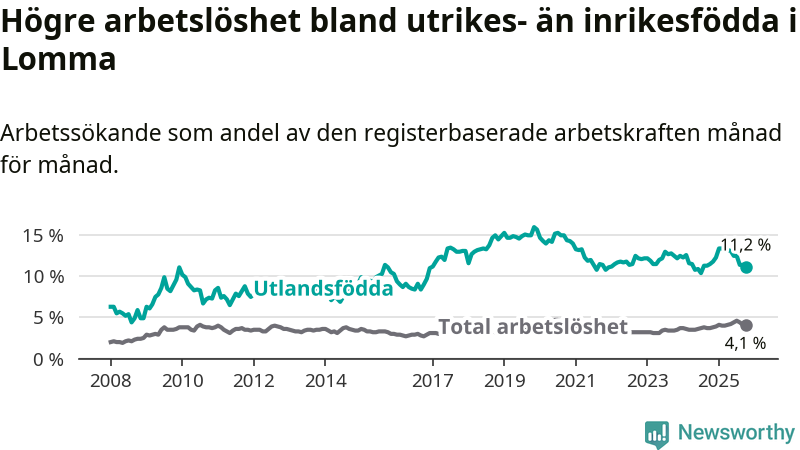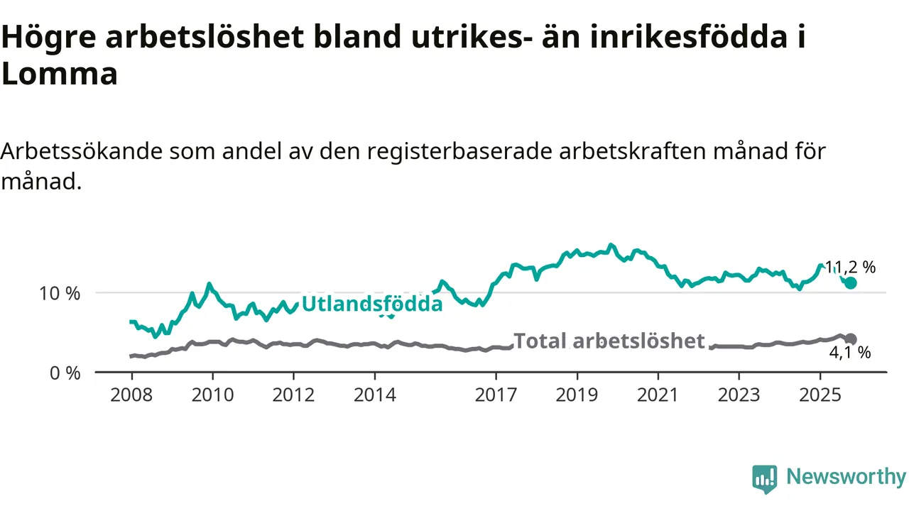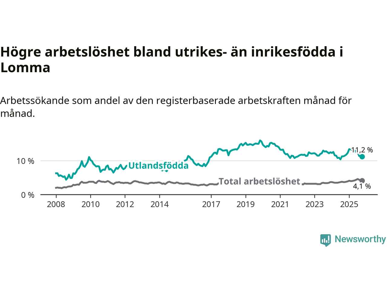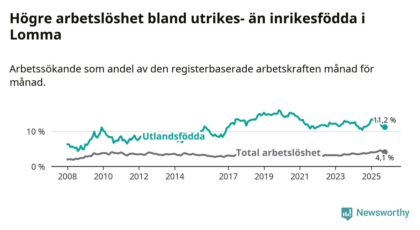 Arbetslösheten bland utlandsfödda var 11,2 procent i Lomma under oktober månad, motsvarande 153 av 1 366 personer. Det är 0,3 procentenheter färre än vid samma tidpunkt i fjol (−2 om man räknar personer). Den senaste månadens nedgång innebär ett trendbrott. Under de nio föregående månaderna hade arbetslösheten bland utlandsfödda varit högre än motsvarande tidpunkt året innan.