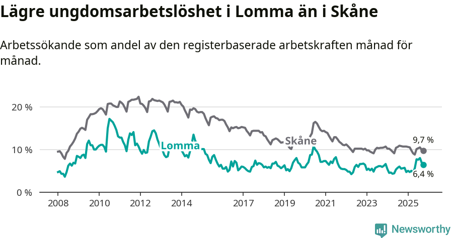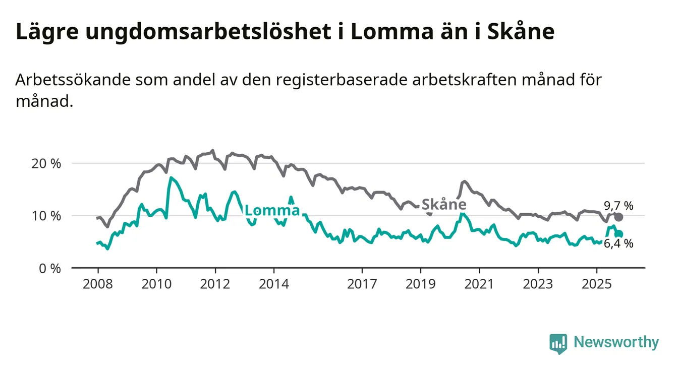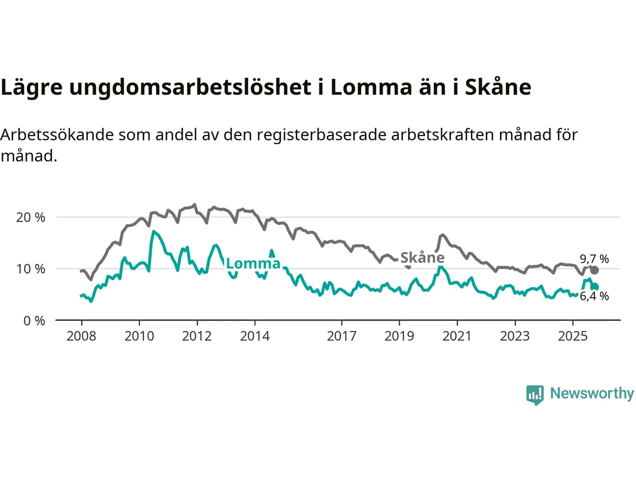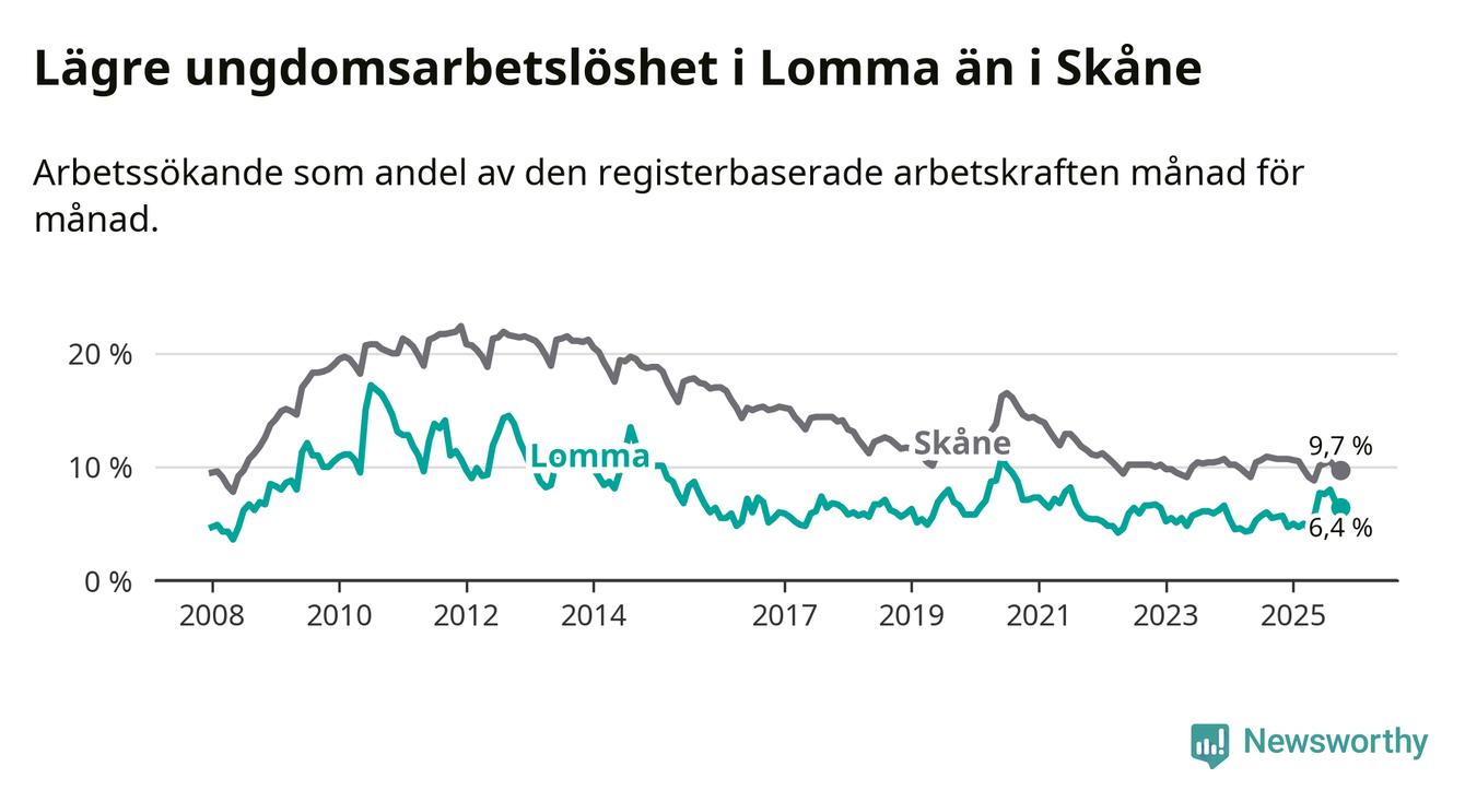 Precis som den totala arbetslösheten ligger ungdomsarbetslösheten i Lomma lägre än i Skåne som helhet. Skillnaden mellan kommunen och länet är 3,3 procentenheter.