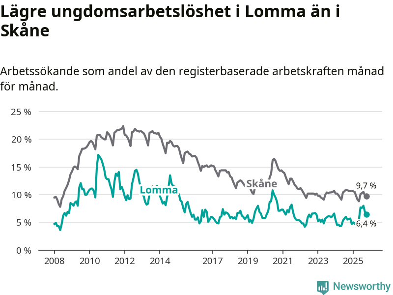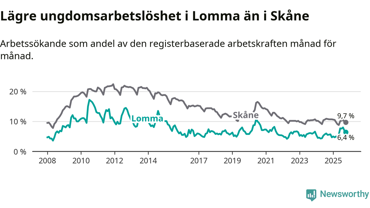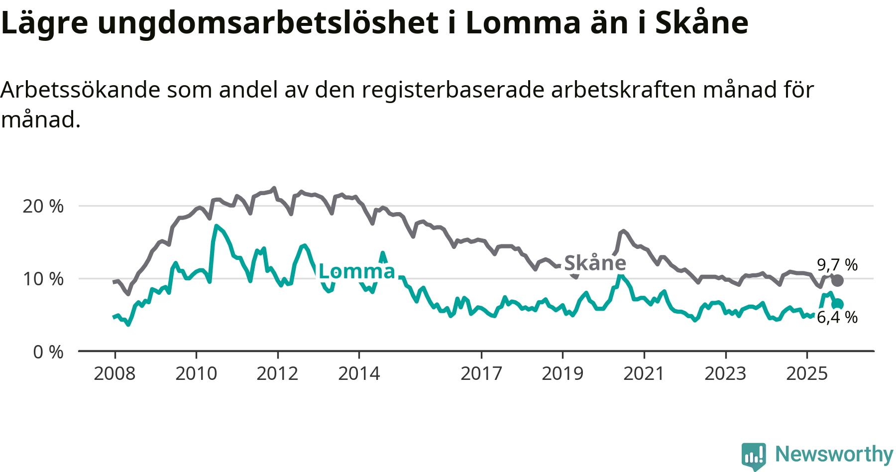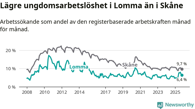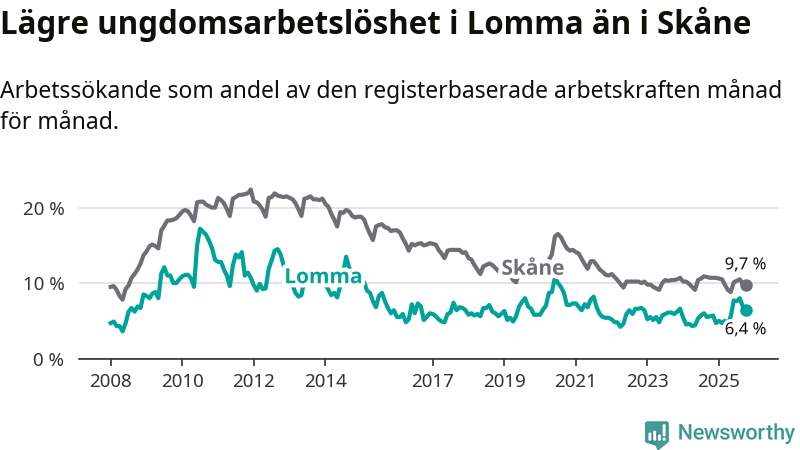 Precis som den totala arbetslösheten ligger ungdomsarbetslösheten i Lomma lägre än i Skåne som helhet. Skillnaden mellan kommunen och länet är 3,3 procentenheter.