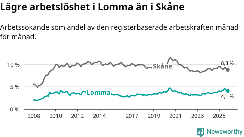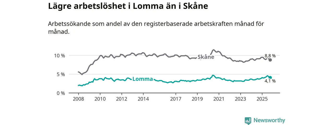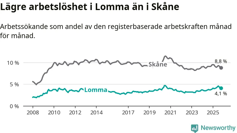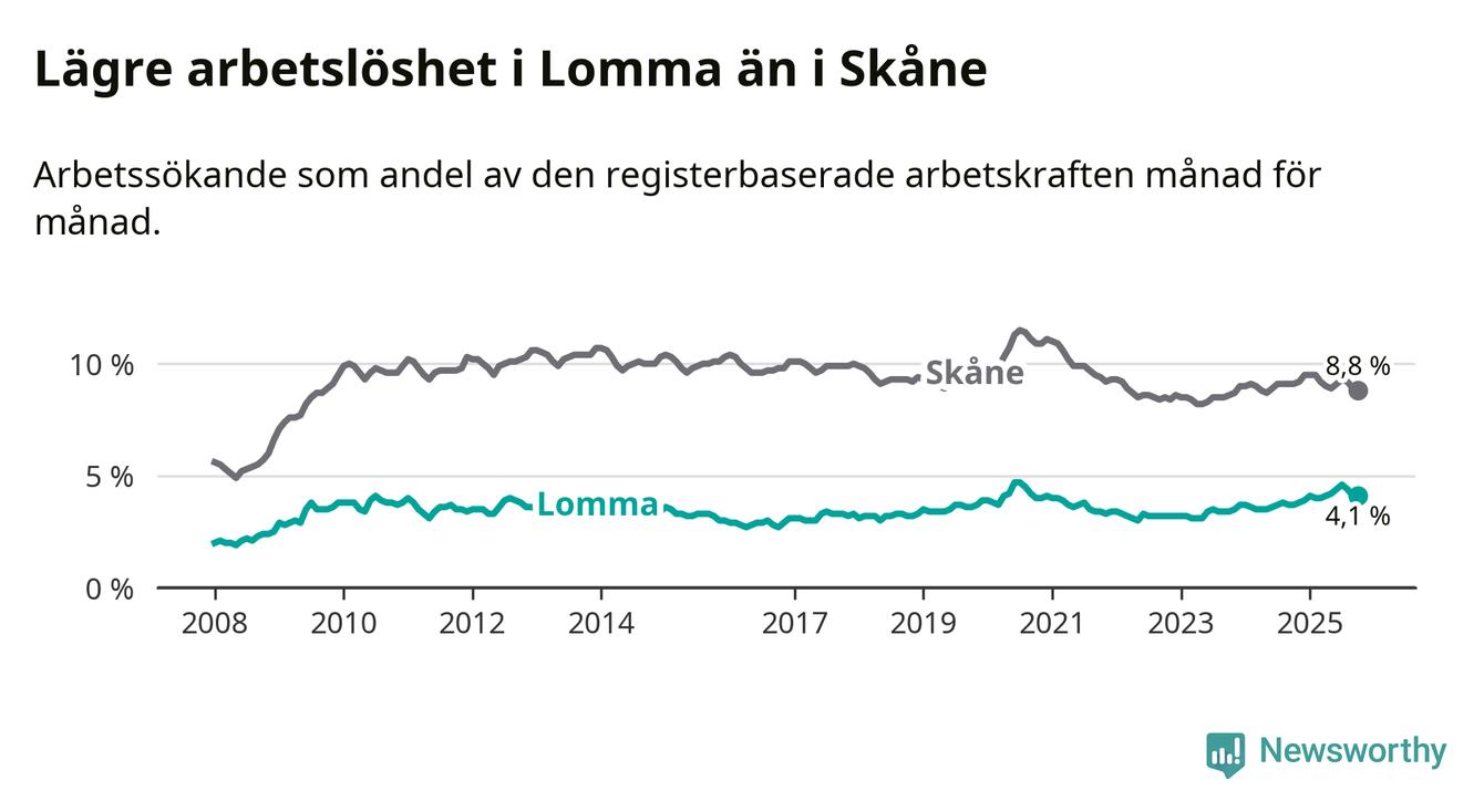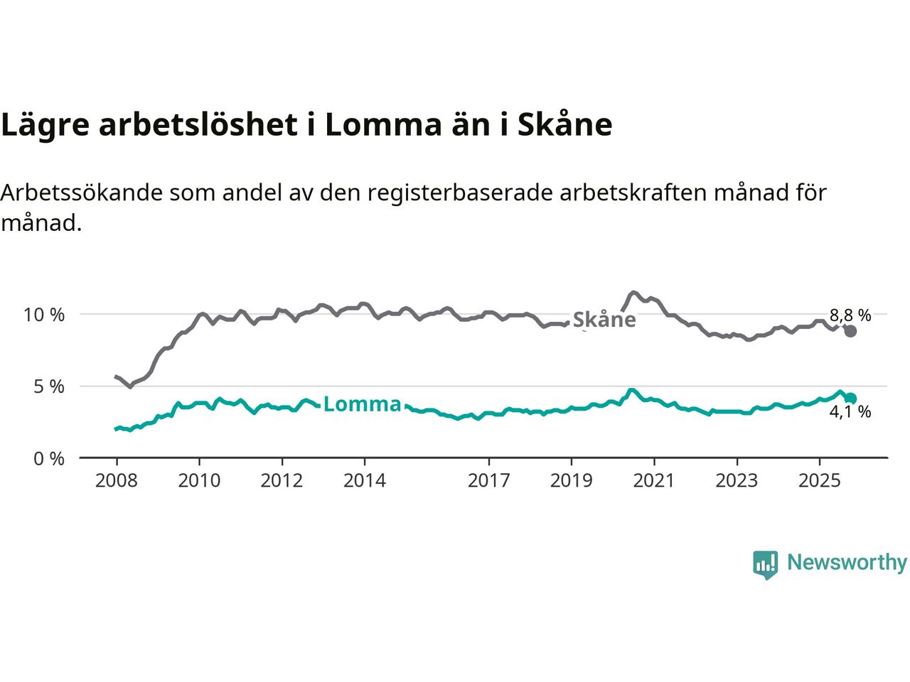 Även om arbetslösheten i Lomma alltså ökar, så ligger den fortfarande under snittet i hela Skåne län (4,1 procent i kommunen, jämfört med 8,8 procent i hela länet). Lomma har därmed även den lägsta arbetslöshetsnivån i länet. Perstorp har den högsta (13,6 procent).