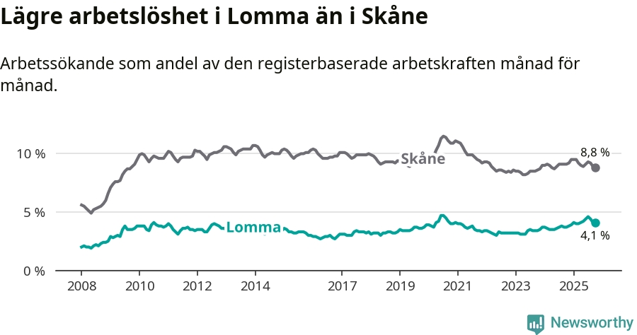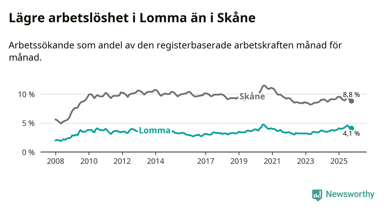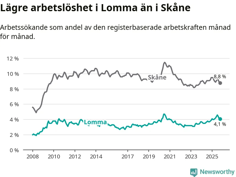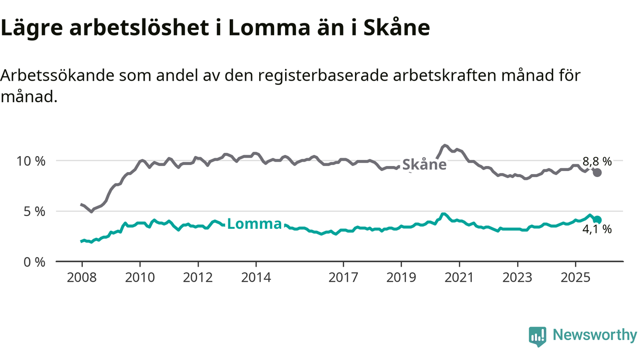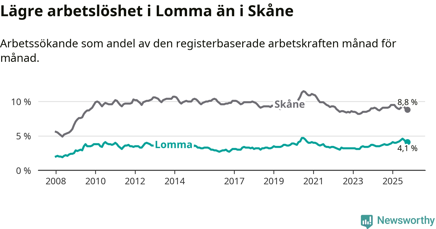 Även om arbetslösheten i Lomma alltså ökar, så ligger den fortfarande under snittet i hela Skåne län (4,1 procent i kommunen, jämfört med 8,8 procent i hela länet). Lomma har därmed även den lägsta arbetslöshetsnivån i länet. Perstorp har den högsta (13,6 procent).
