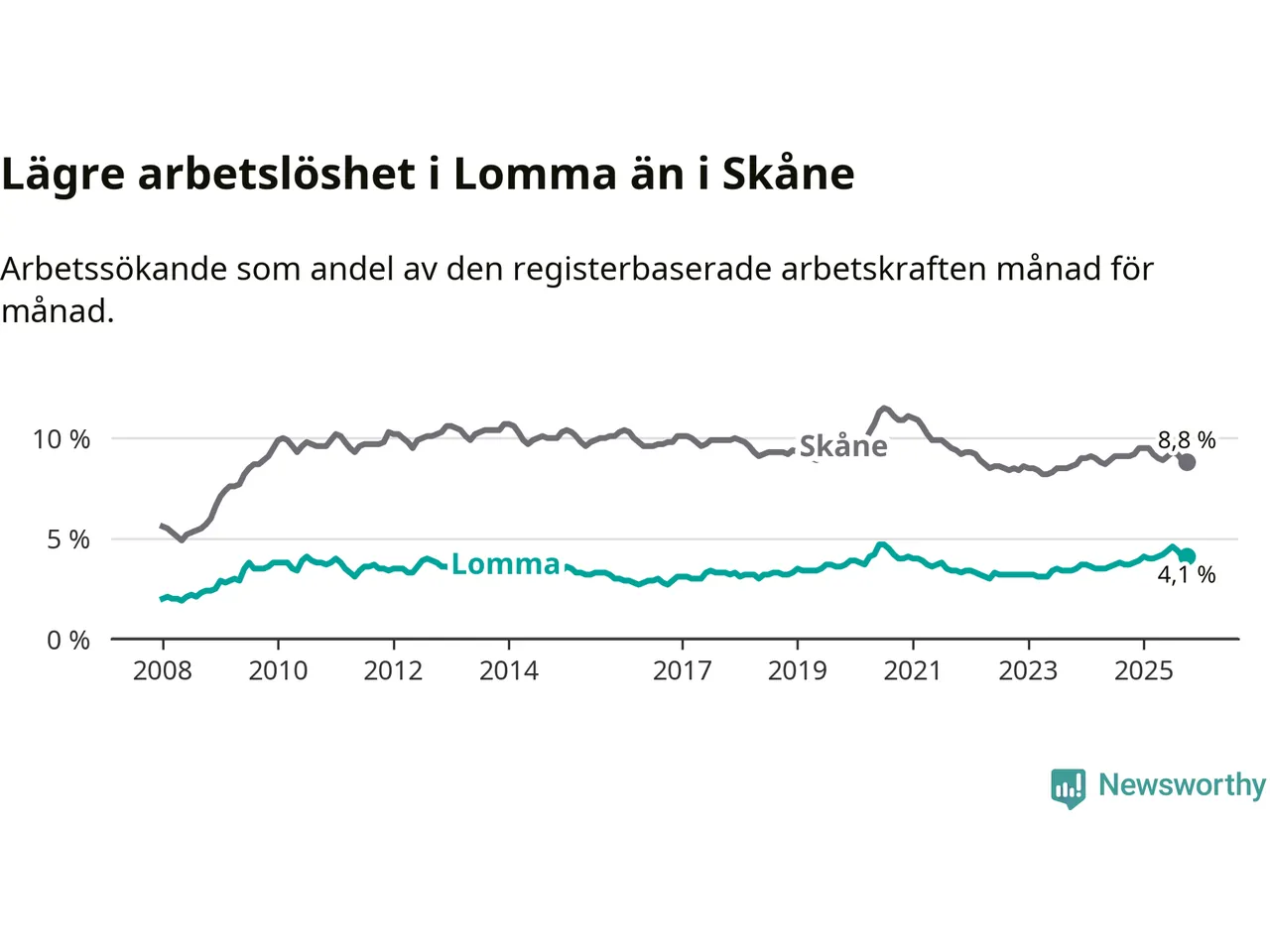 Under oktober månad rapporterade Lomma kommun en total arbetslöshet på 4,1 procent. Det är en ökning jämfört med samma tidpunkt i fjol (+0,4 procentenheter). I Skåne län däremot sjunker arbetslösheten .