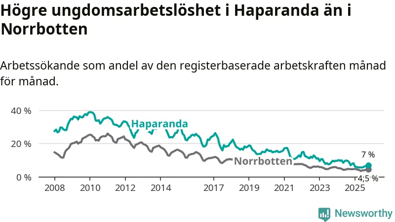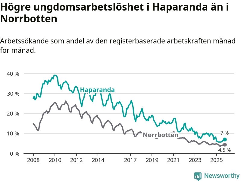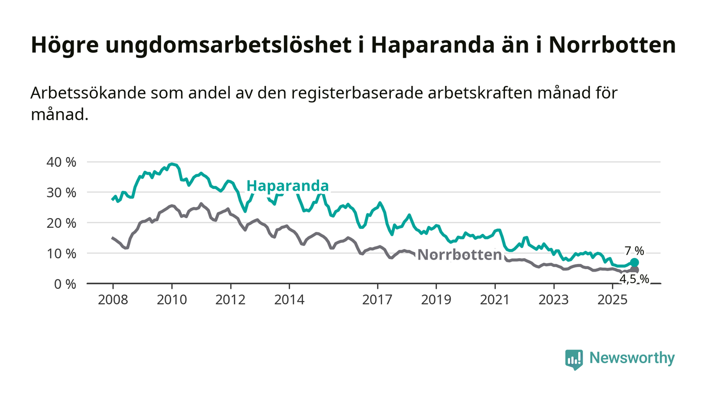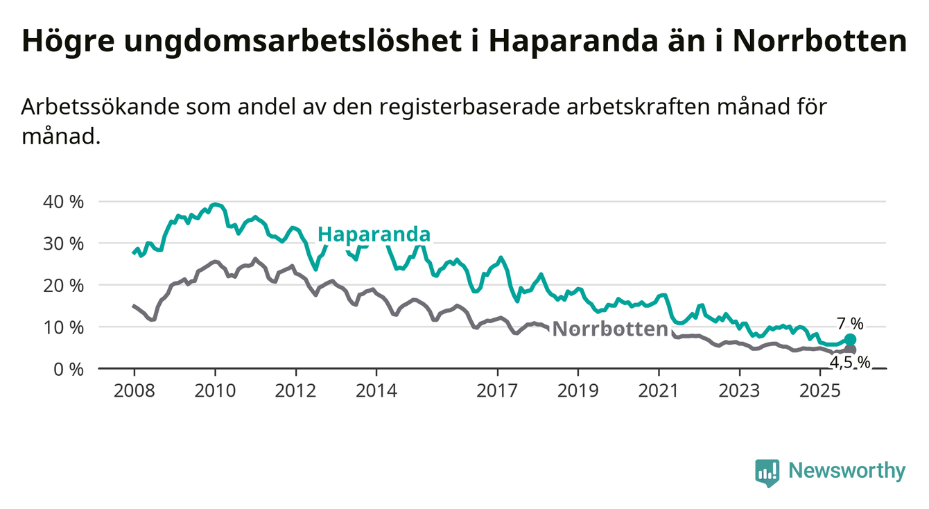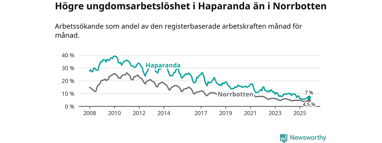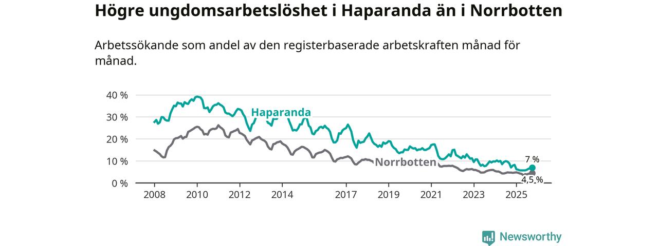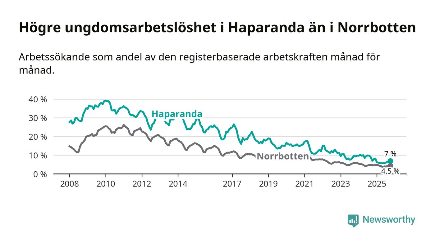 Precis som den totala arbetslösheten ligger ungdomsarbetslösheten i Haparanda högre än i Norrbotten som helhet. Skillnaden mellan kommunen och länet är 2,5 procentenheter.