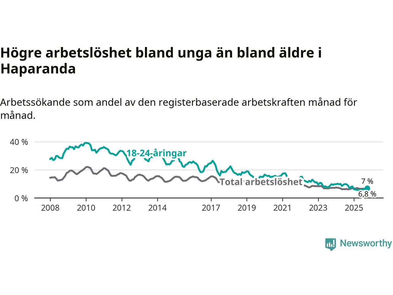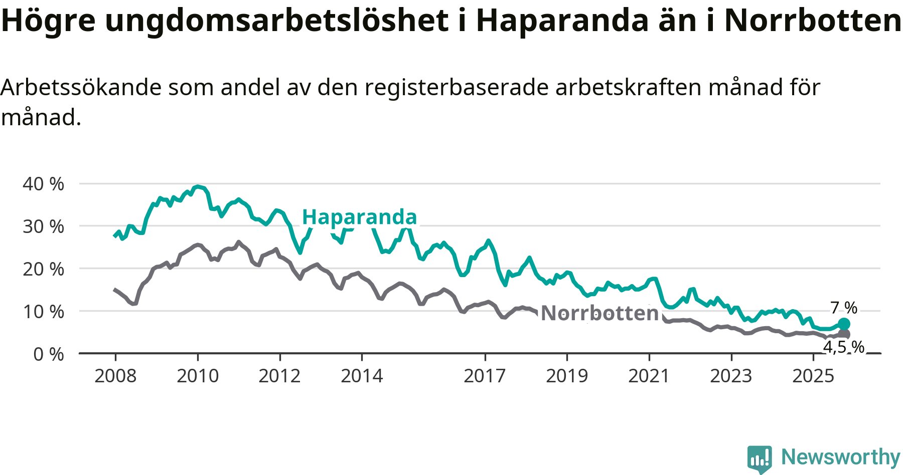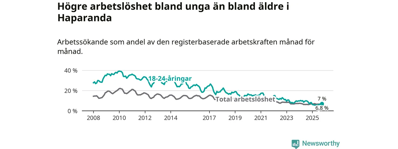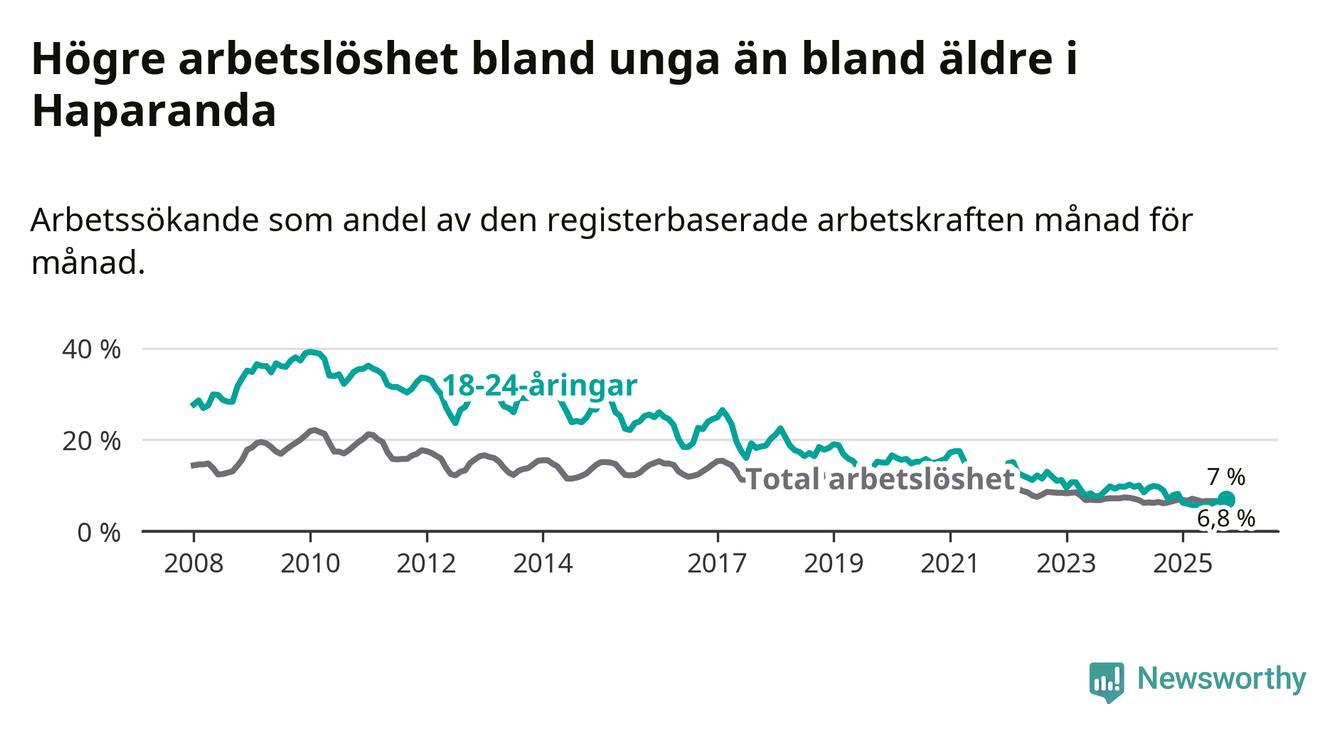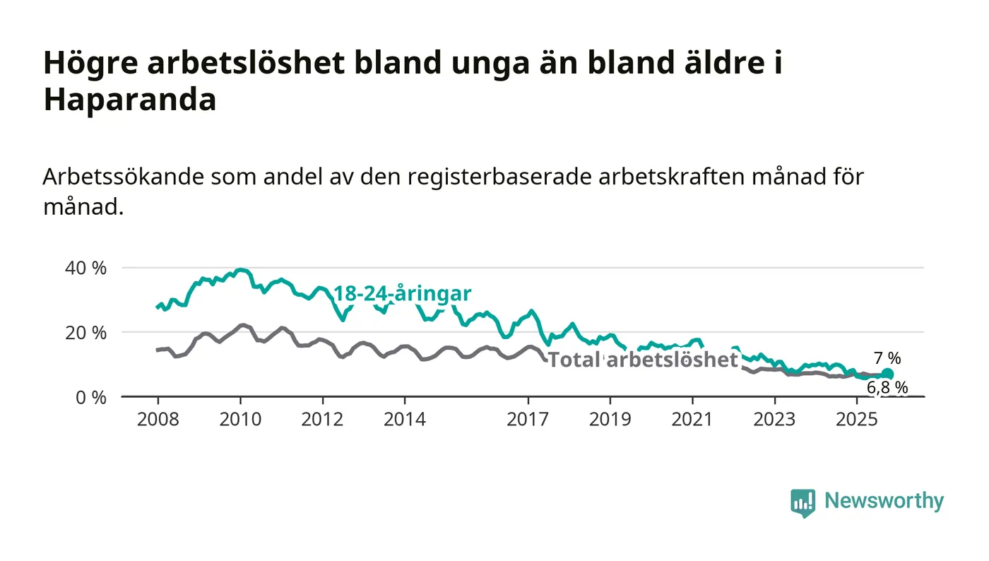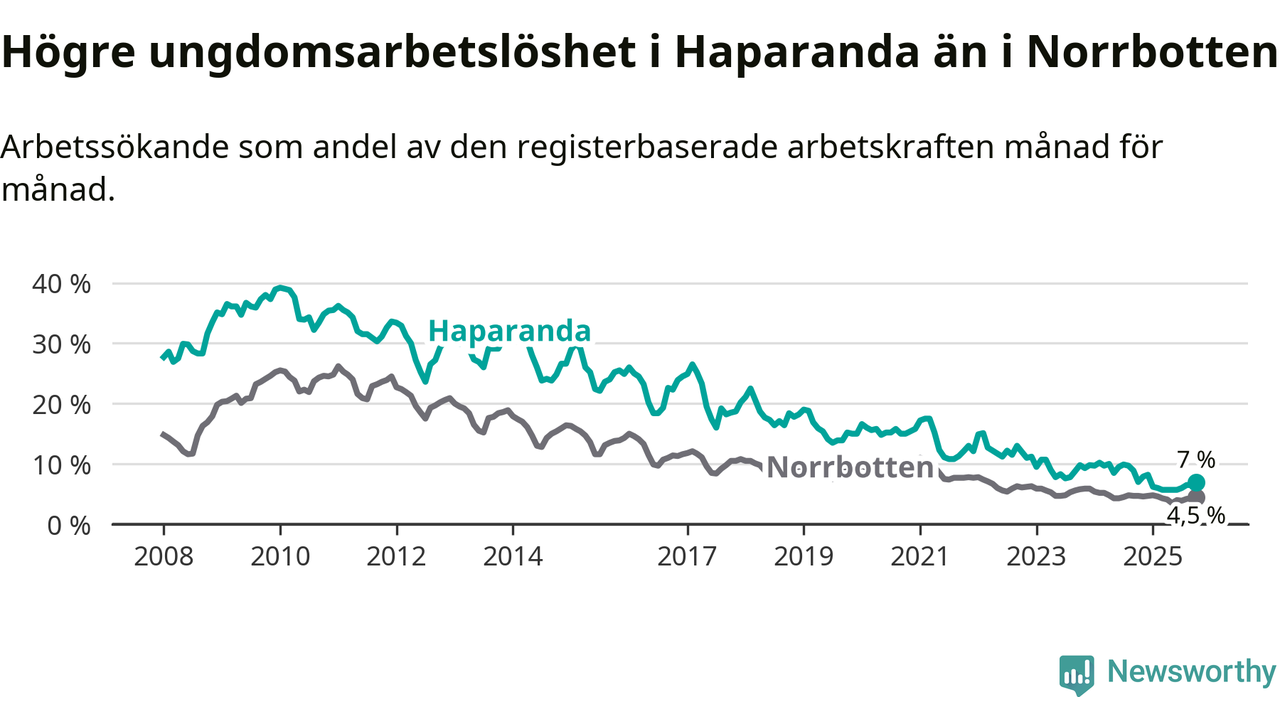 Precis som den totala arbetslösheten ligger ungdomsarbetslösheten i Haparanda högre än i Norrbotten som helhet. Skillnaden mellan kommunen och länet är 2,5 procentenheter.