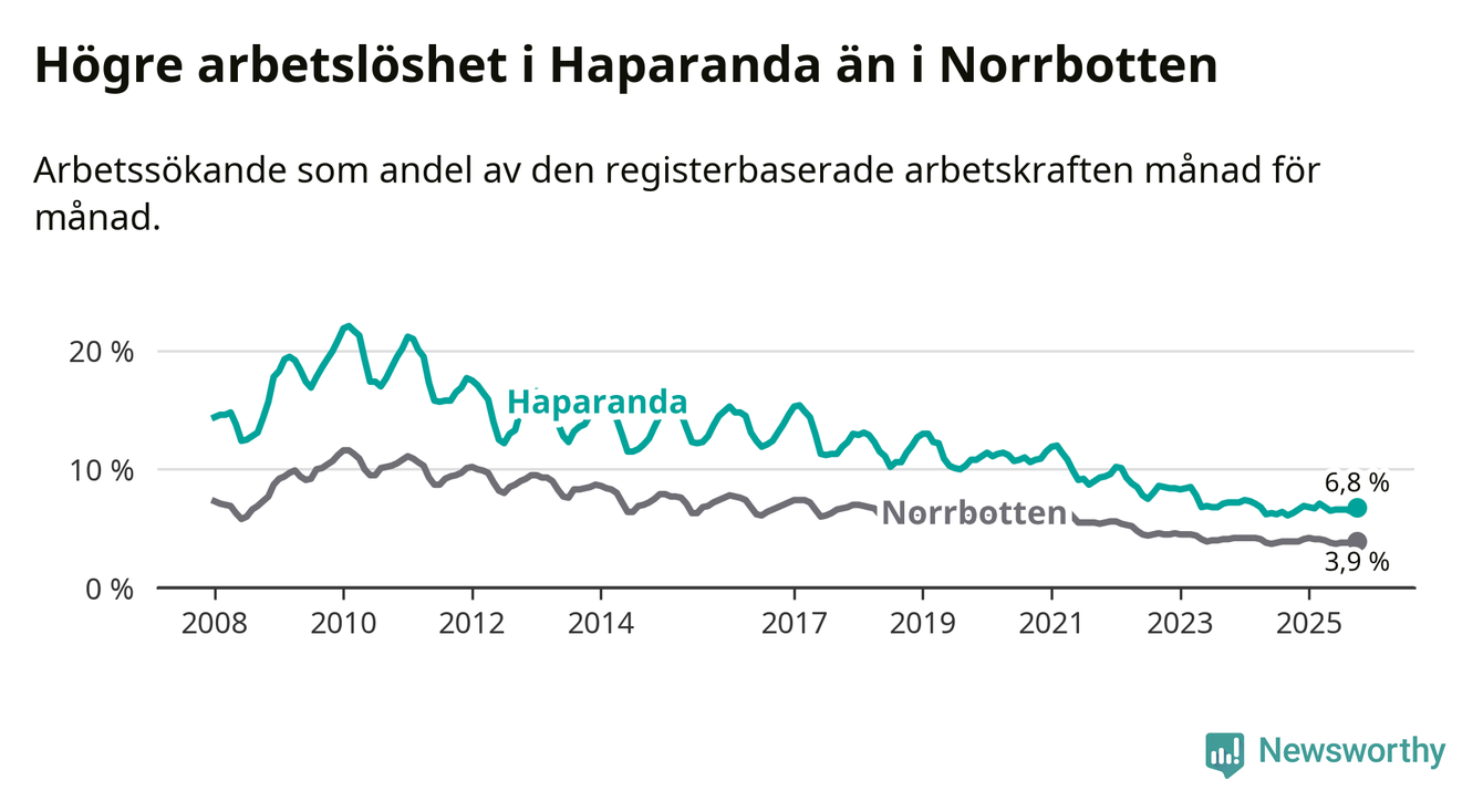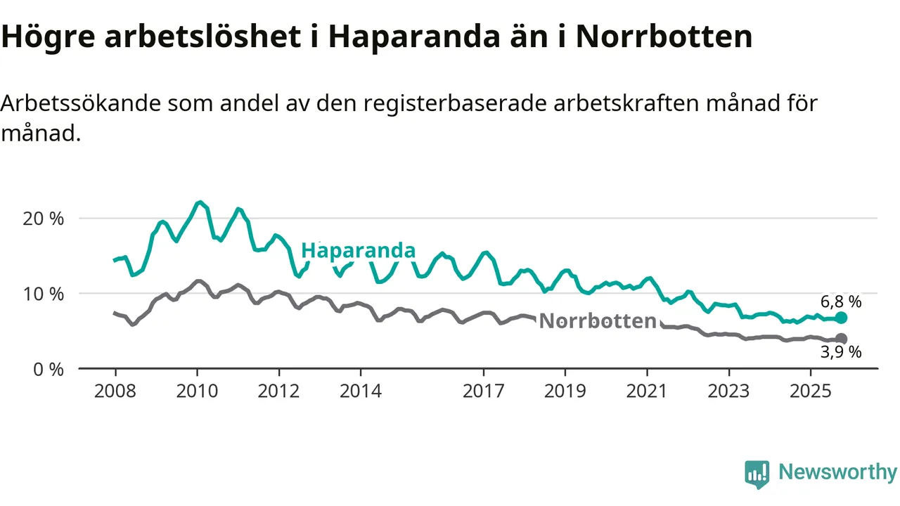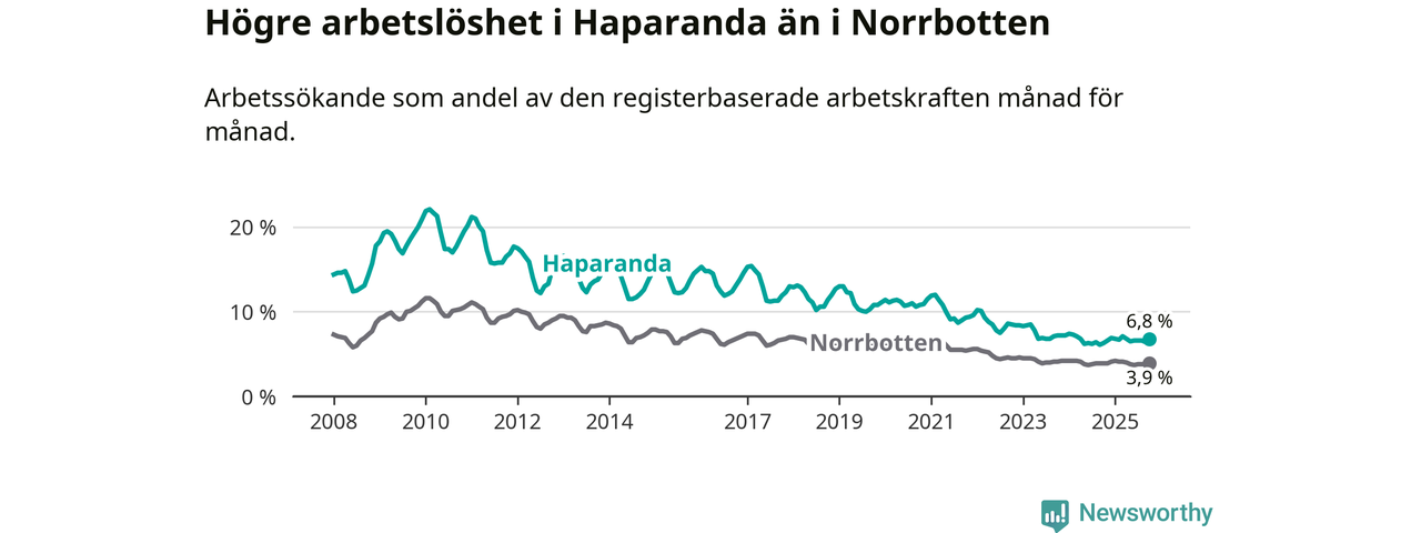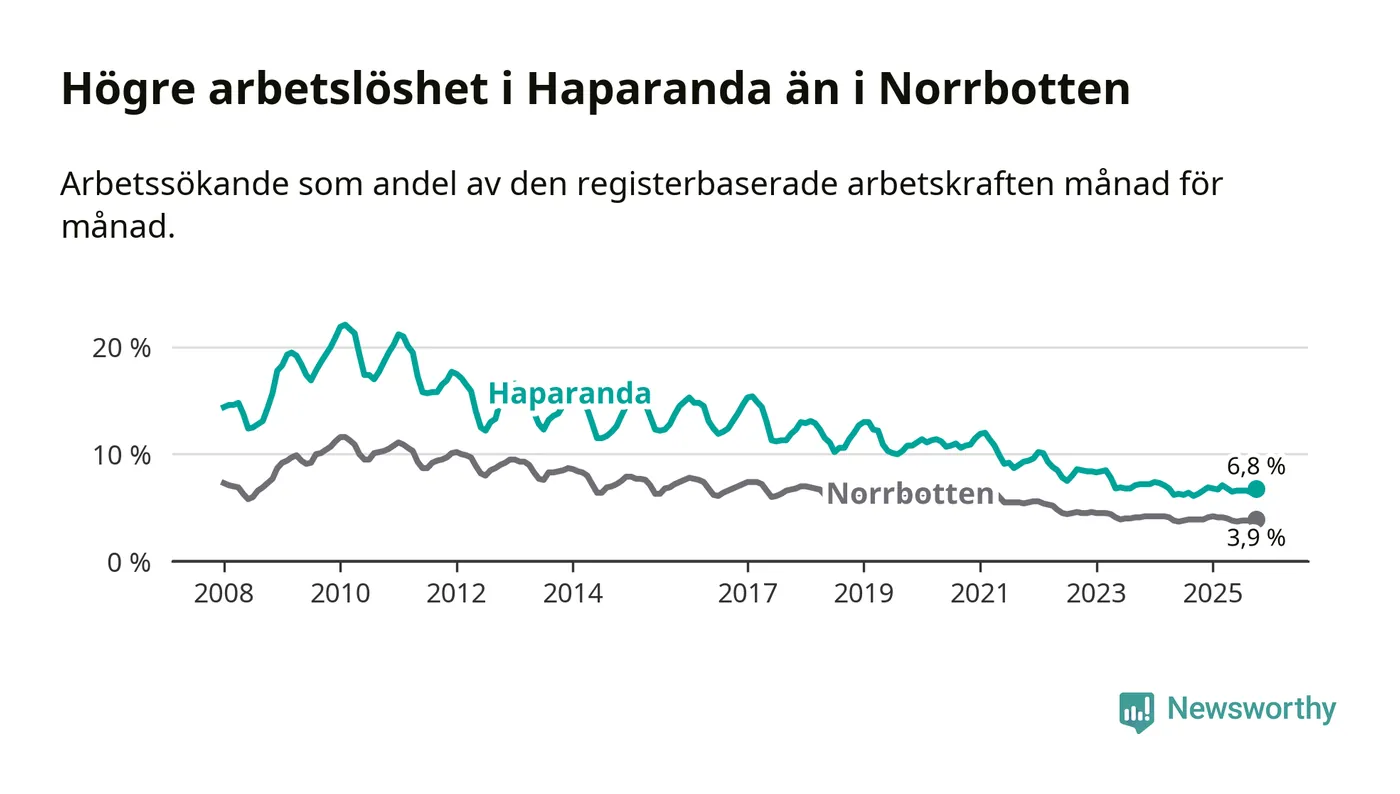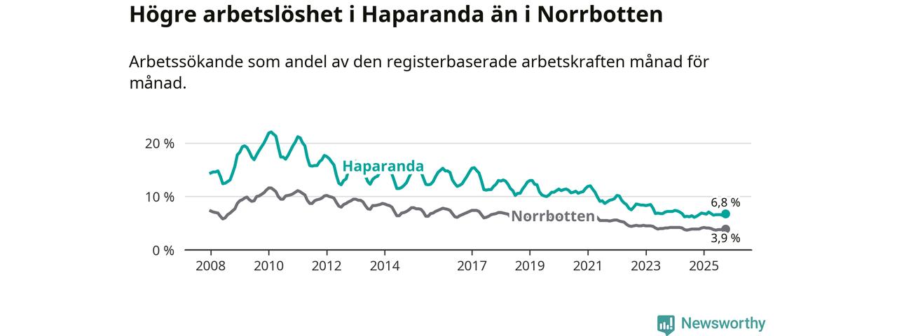 Under oktober månad rapporterade Haparanda kommun en total arbetslöshet på 6,8 procent. Det är en ökning jämfört med samma tidpunkt i fjol (+0,5 procentenheter). I Norrbottens län däremot står arbetslösheten stilla.