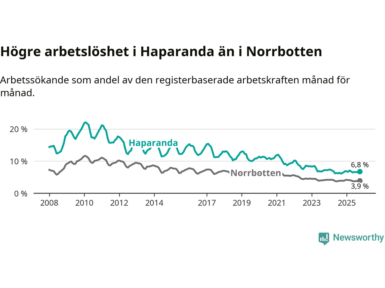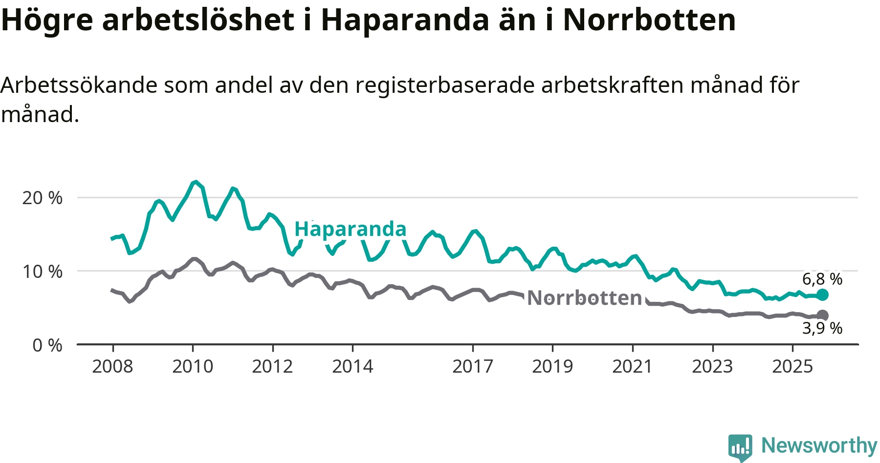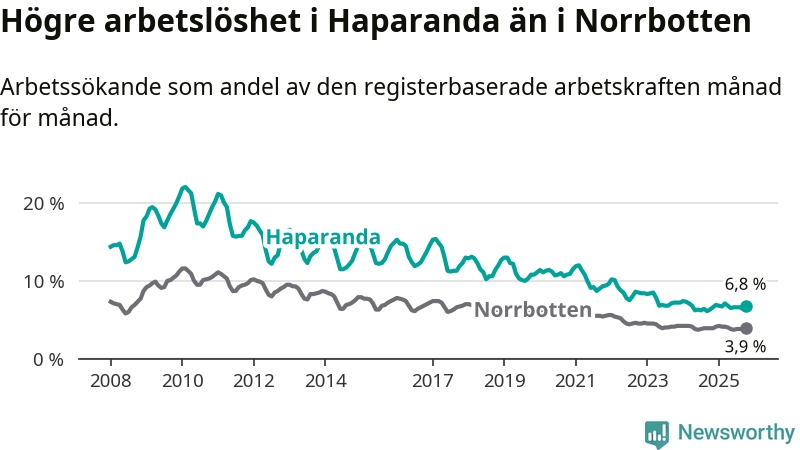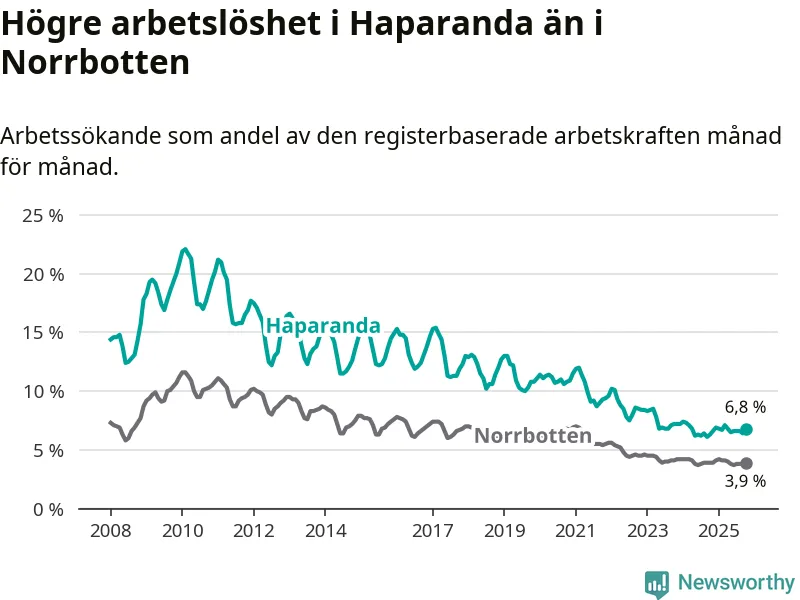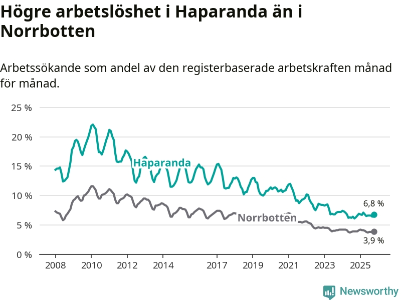 Under oktober månad rapporterade Haparanda kommun en total arbetslöshet på 6,8 procent. Det är en ökning jämfört med samma tidpunkt i fjol (+0,5 procentenheter). I Norrbottens län däremot står arbetslösheten stilla.