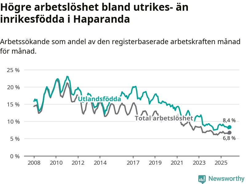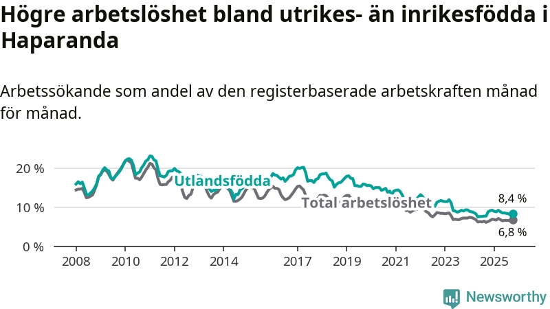 Arbetslösheten bland utlandsfödda var 8,4 procent i Haparanda under oktober månad, motsvarande 110 av 1 310 personer. Det är 0,4 procentenheter färre än vid samma tidpunkt i fjol (−6 om man räknar personer). Den senaste månadens nedgång innebär ett trendbrott. Under de sju föregående månaderna hade arbetslösheten bland utlandsfödda varit högre än motsvarande tidpunkt året innan.