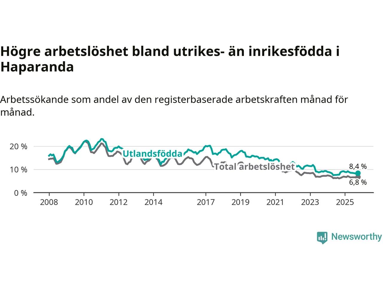 | Bland utlandsfödda | 8,4 % | −0,4 % ▼ | 9,2 % | −0,7 % ▼ | 14,5 % | −0,8 % ▼ |