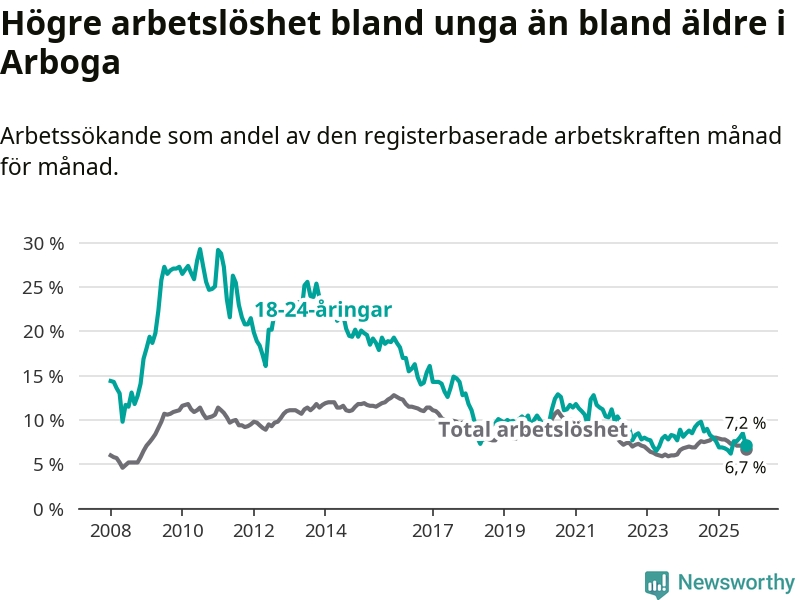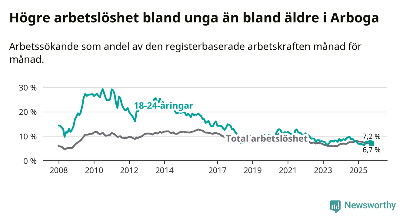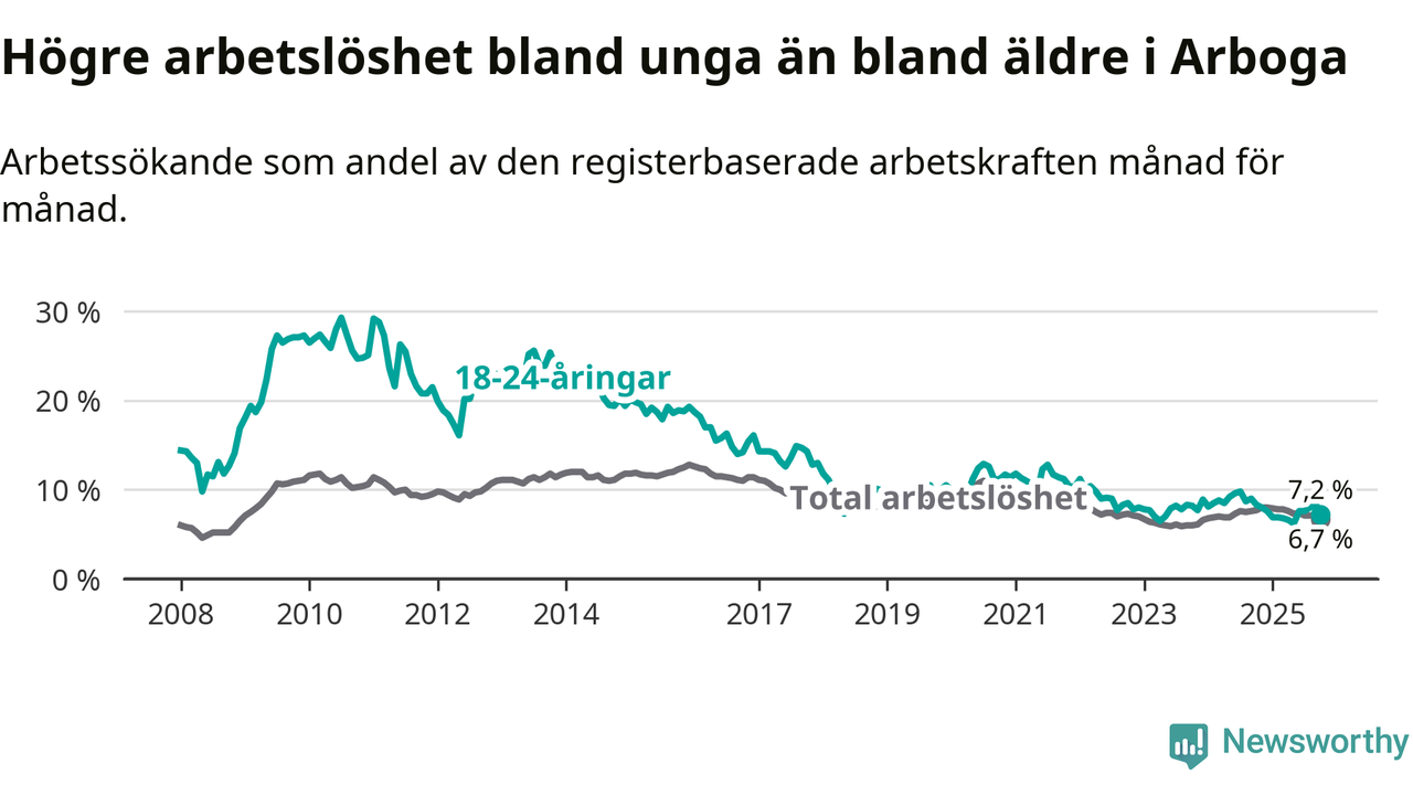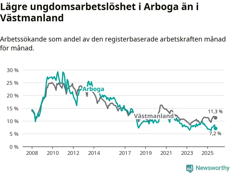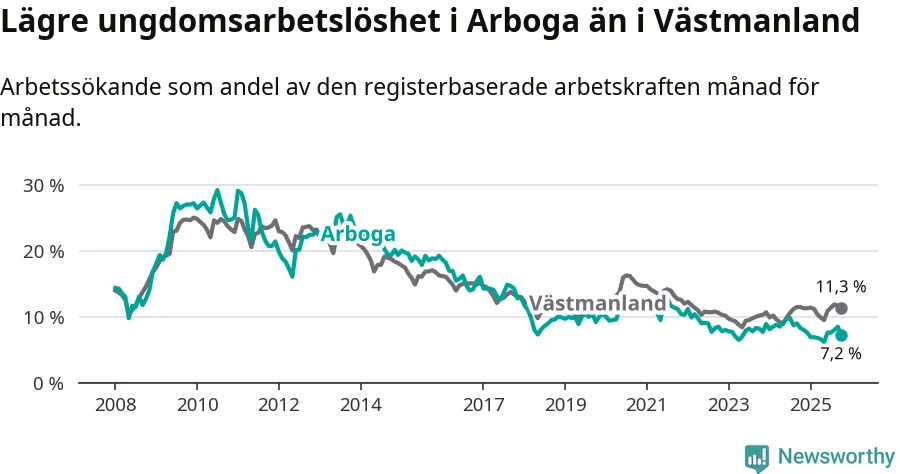 I och med den senaste månadens nedgång har de ungas arbetslöshet i Arboga sjunkit elva månader i följd (ner från 8,0 procent i november 2024 till 7,2 procent nu).