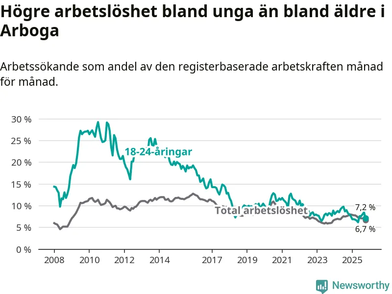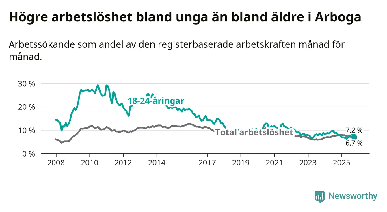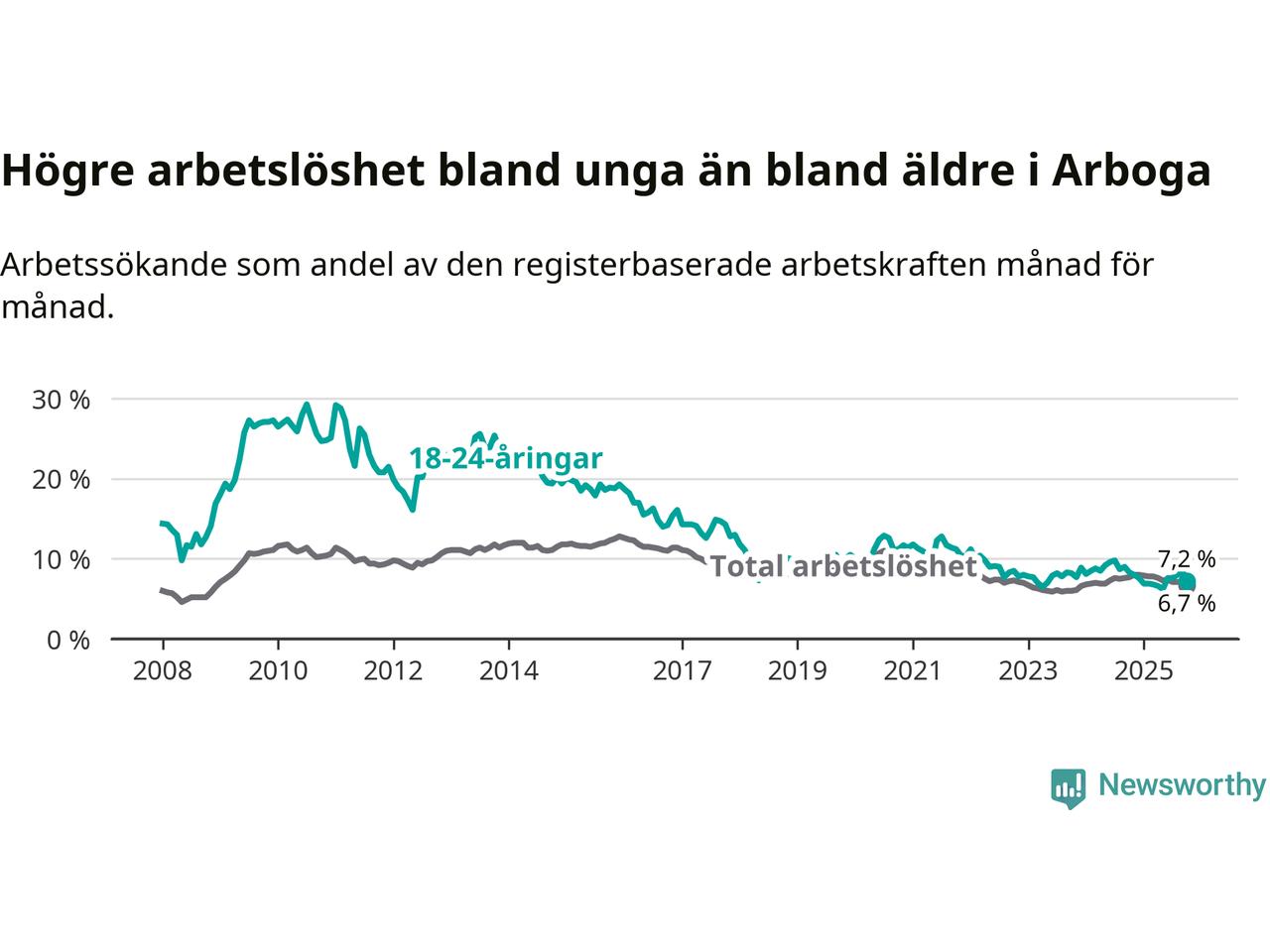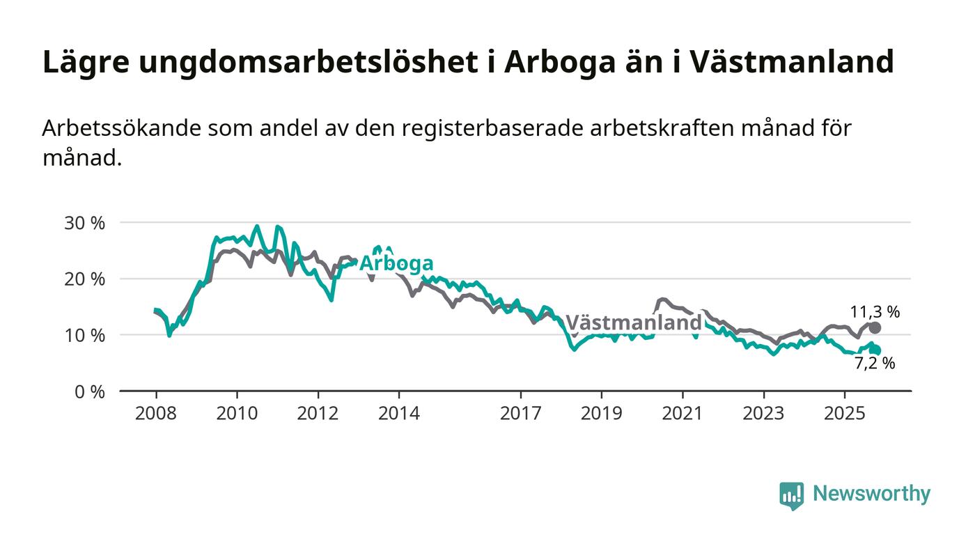 Graf: Arbetslöshet bland unga i Arboga kommun och Västmanlands län