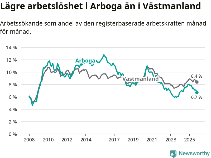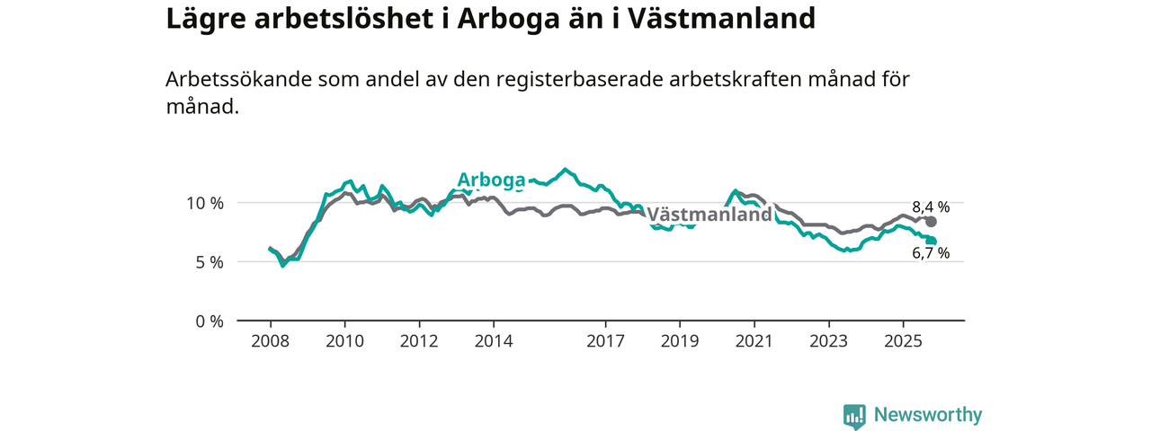 Graf: Arbetslöshet i Arboga kommun och Västmanlands län