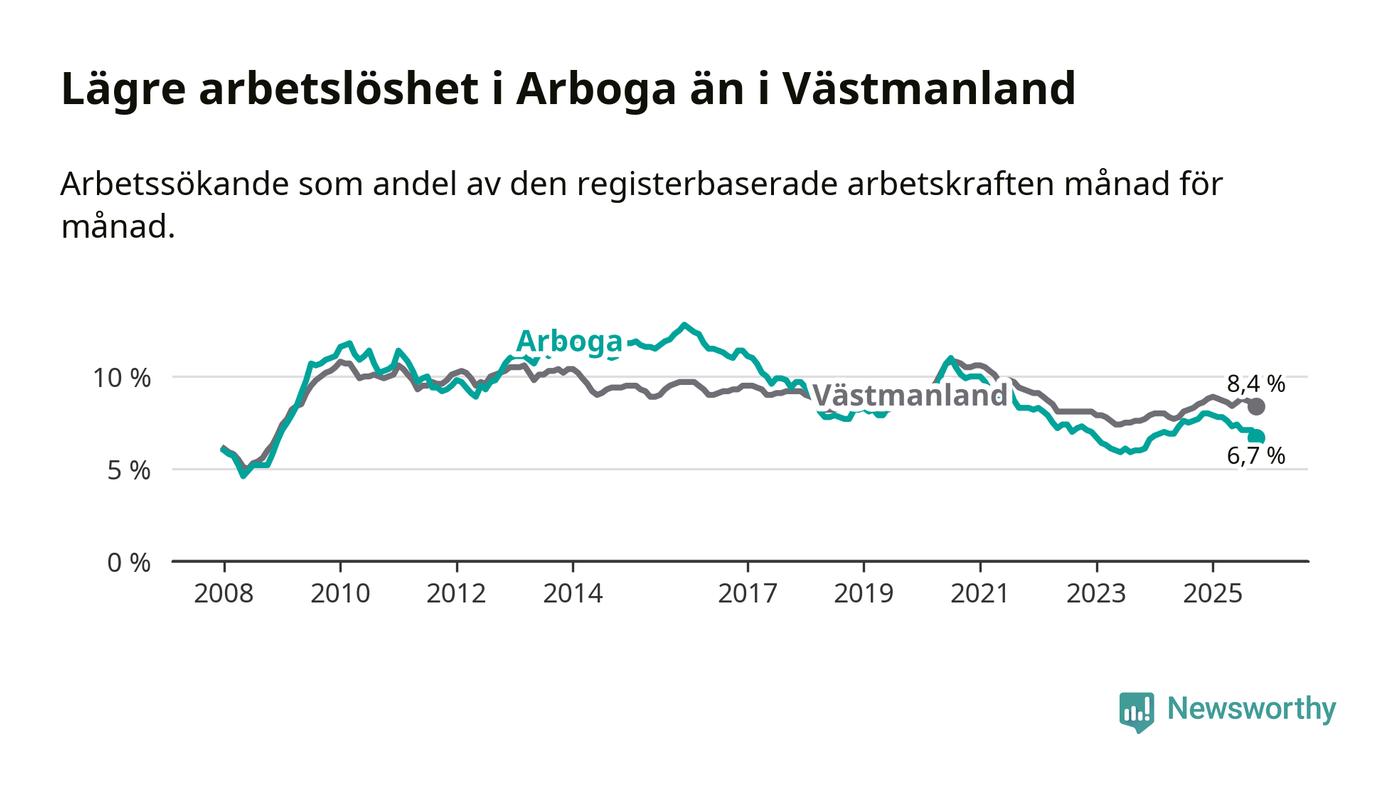 Arboga hade redan tidigare lägre arbetslöshet än snittet i hela Västmanlands län och nu växer klyftan (6,7 procent i kommunen, jämfört med 8,4 procent i hela länet). Surahammar har den lägsta arbetslösheten i länet (6,4 procent), medan Fagersta har den högsta (9,2 procent). För att Arboga skulle komma ner i samma arbetslöshetsnivå som Surahammar skulle 20 personer behöva sysselsättas.