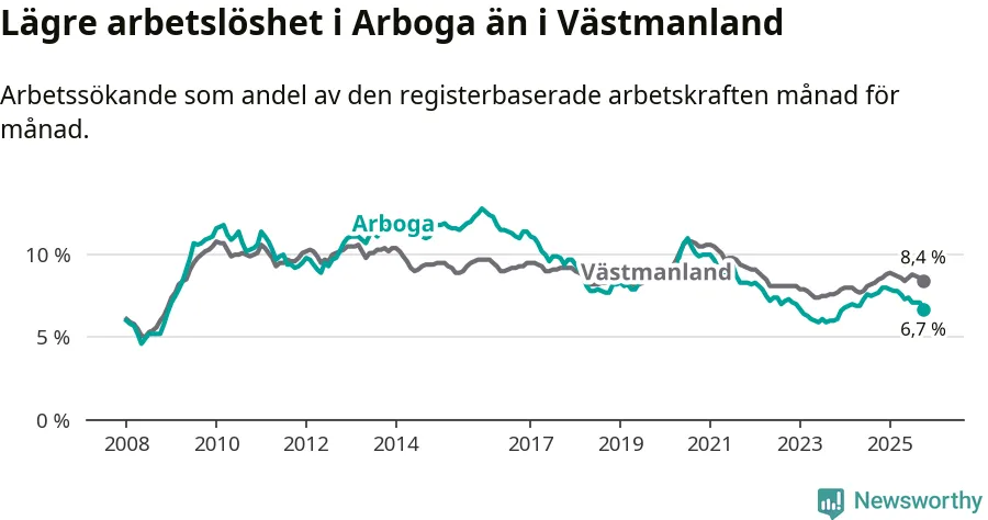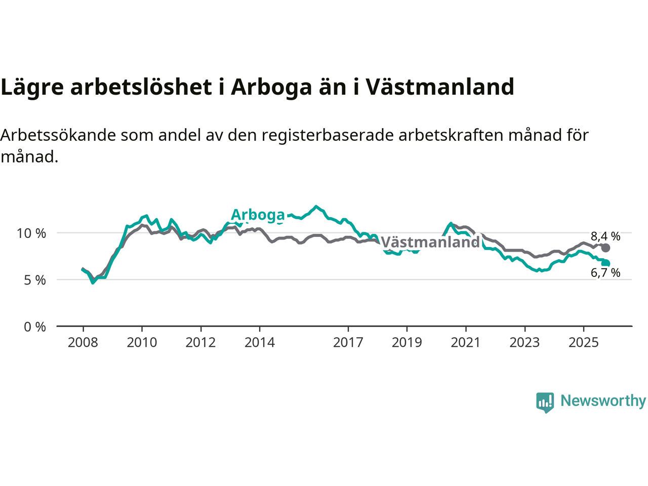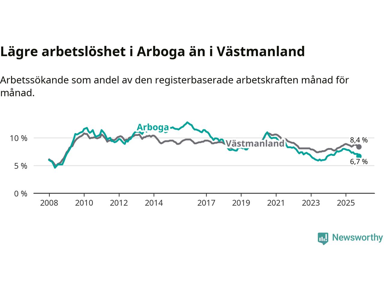 Under oktober månad rapporterade Arboga kommun en total arbetslöshet på 6,7 procent. Det är en minskning jämfört med samma tidpunkt i fjol (−1,0 procentenheter). Även i Västmanlands län sjunker arbetslösheten något.