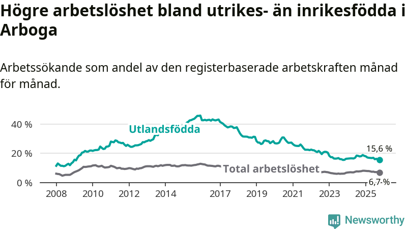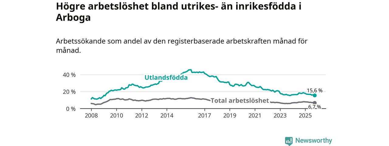 Arbetslösheten bland utlandsfödda var 15,6 procent i Arboga under oktober månad, motsvarande 178 av 1 141 personer. Det är 2,4 procentenheter färre än vid samma tidpunkt i fjol (−28 om man räknar personer).