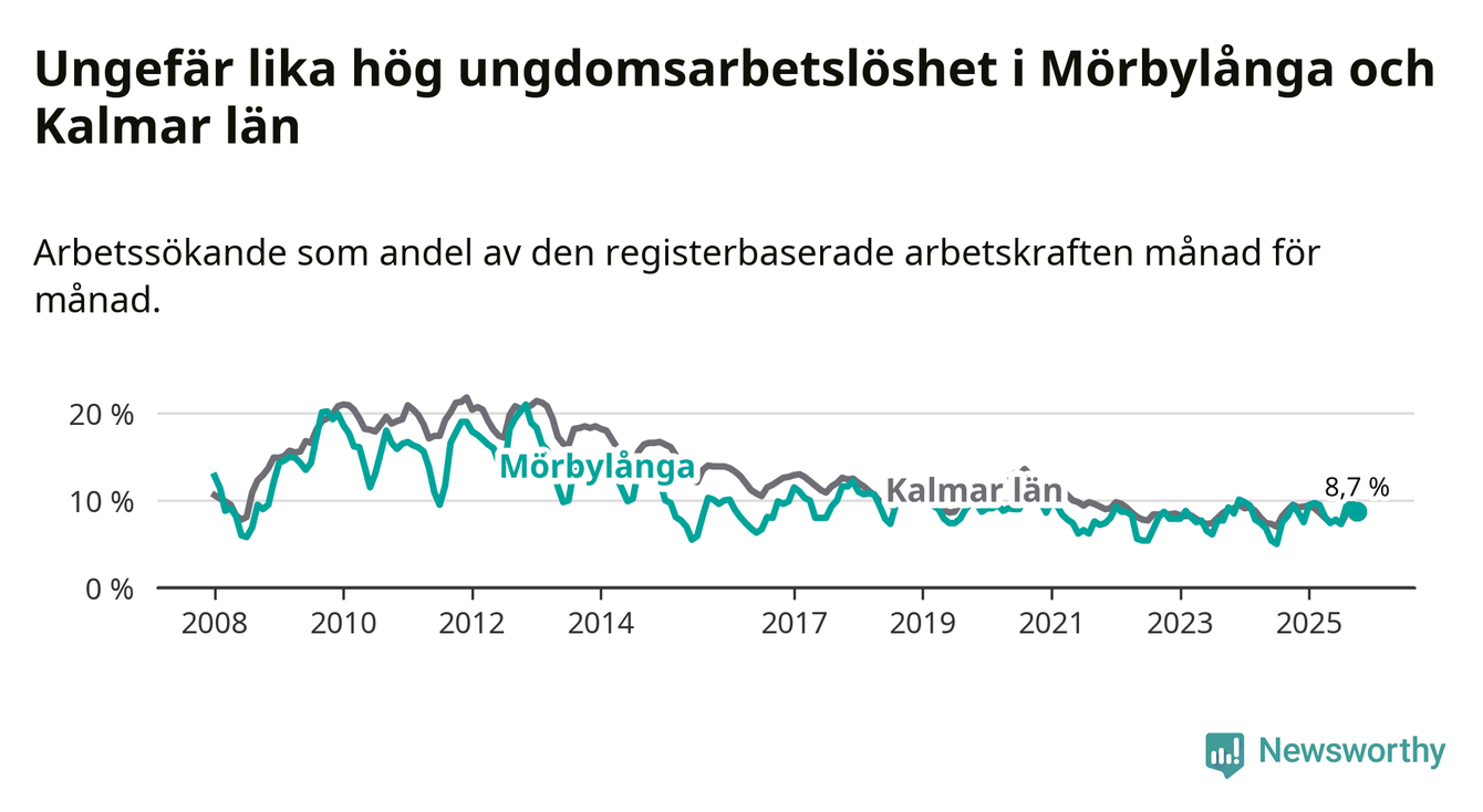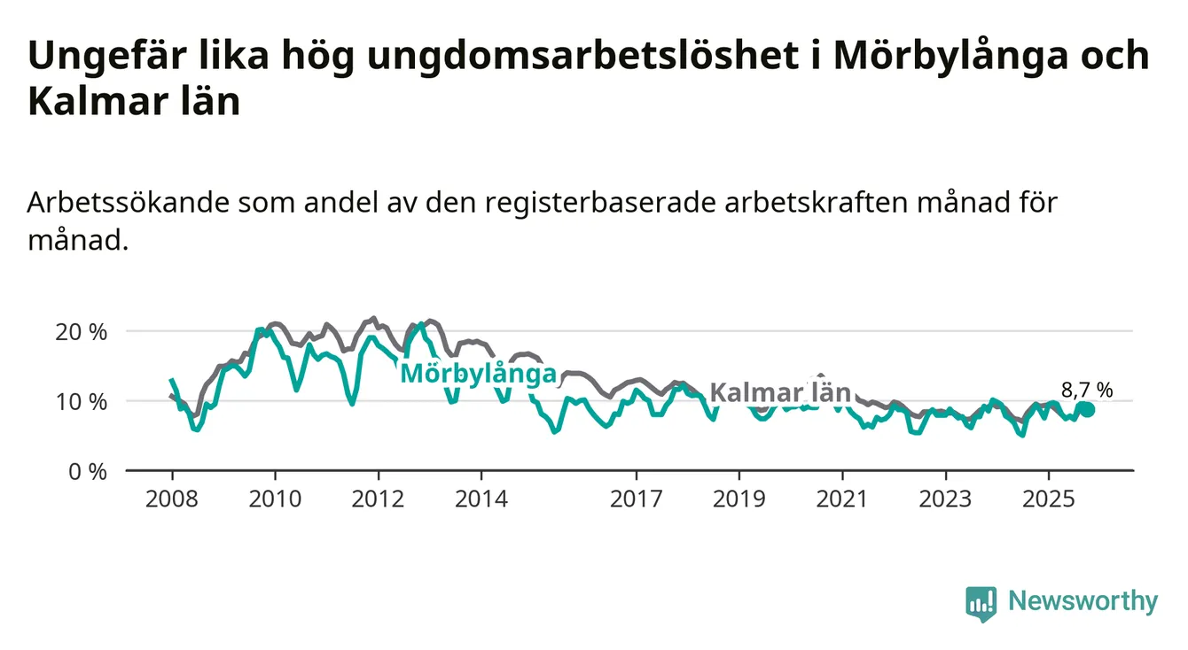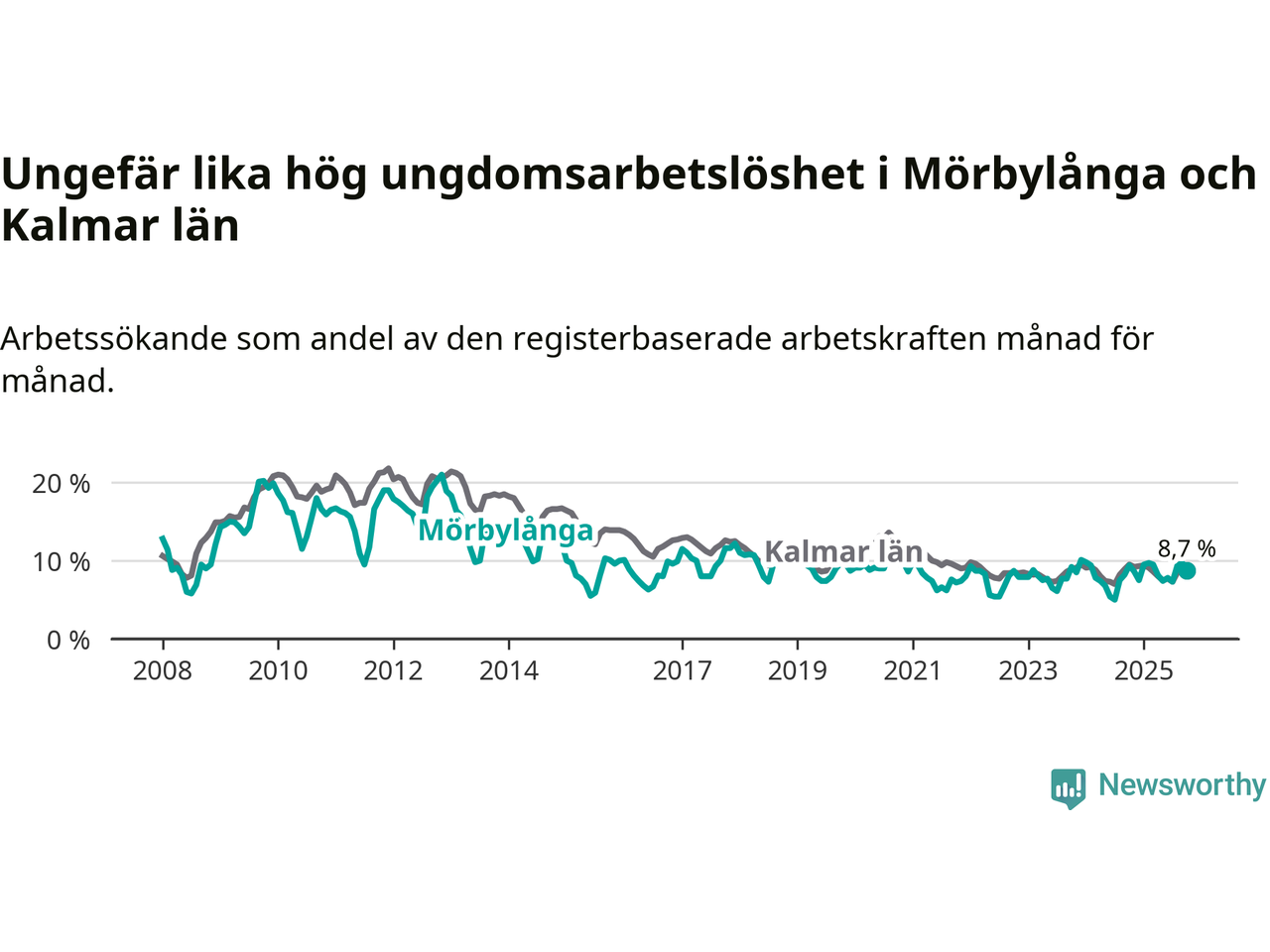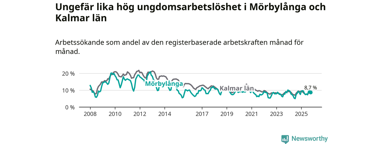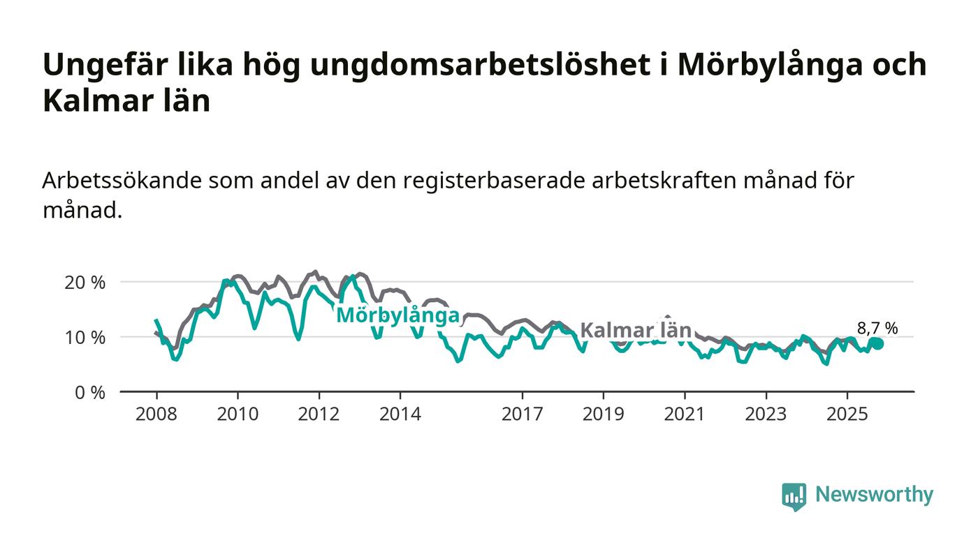 Medan Mörbylånga har lägre total arbetslöshet än Kalmar län, ligger ungdomsarbetslösheten på i stort sett samma nivå.