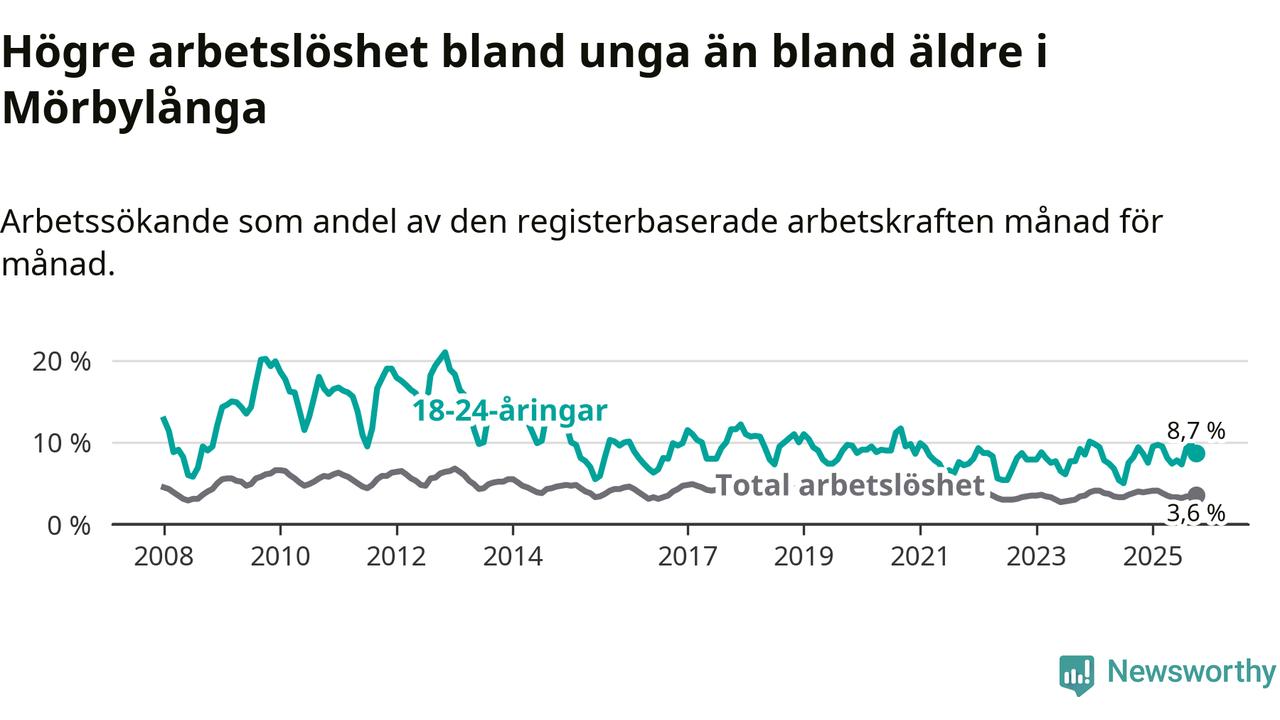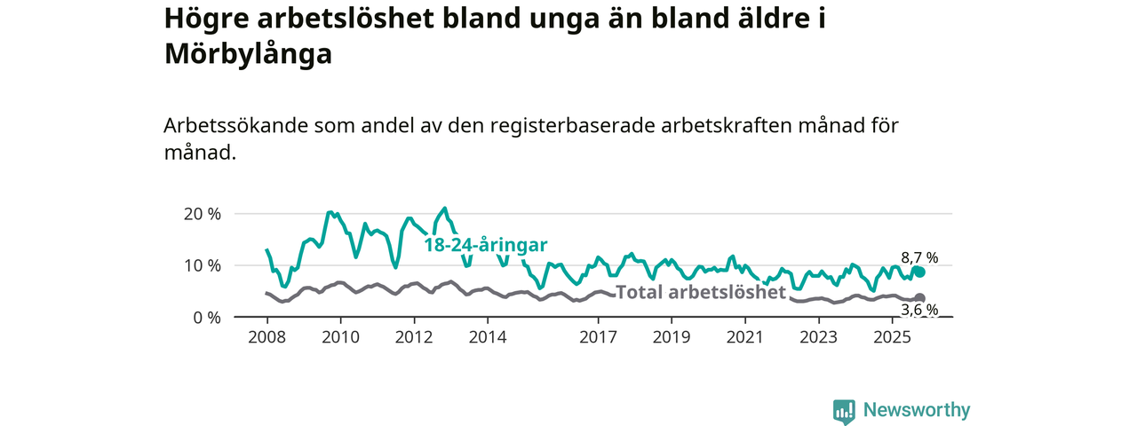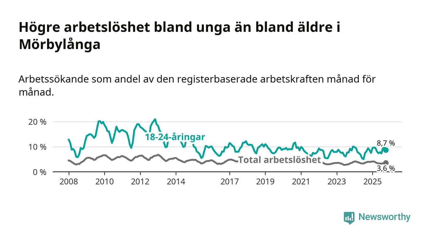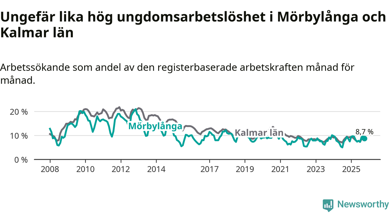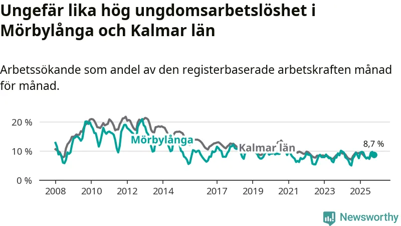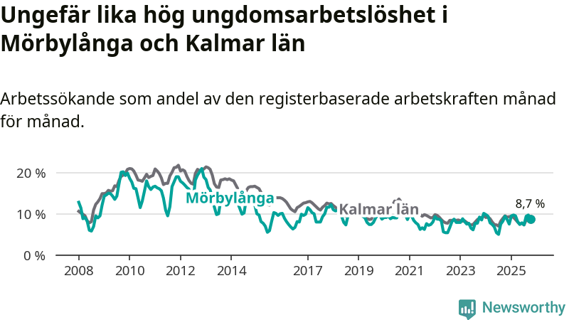 Medan Mörbylånga har lägre total arbetslöshet än Kalmar län, ligger ungdomsarbetslösheten på i stort sett samma nivå.