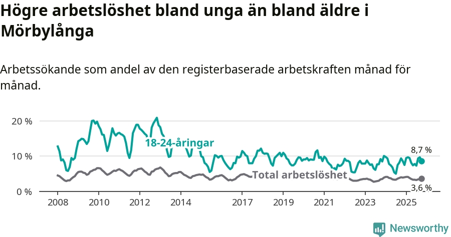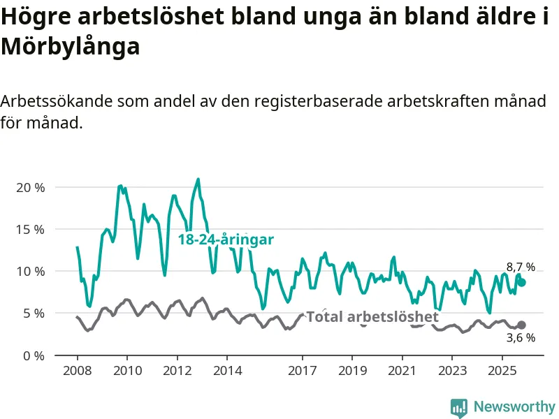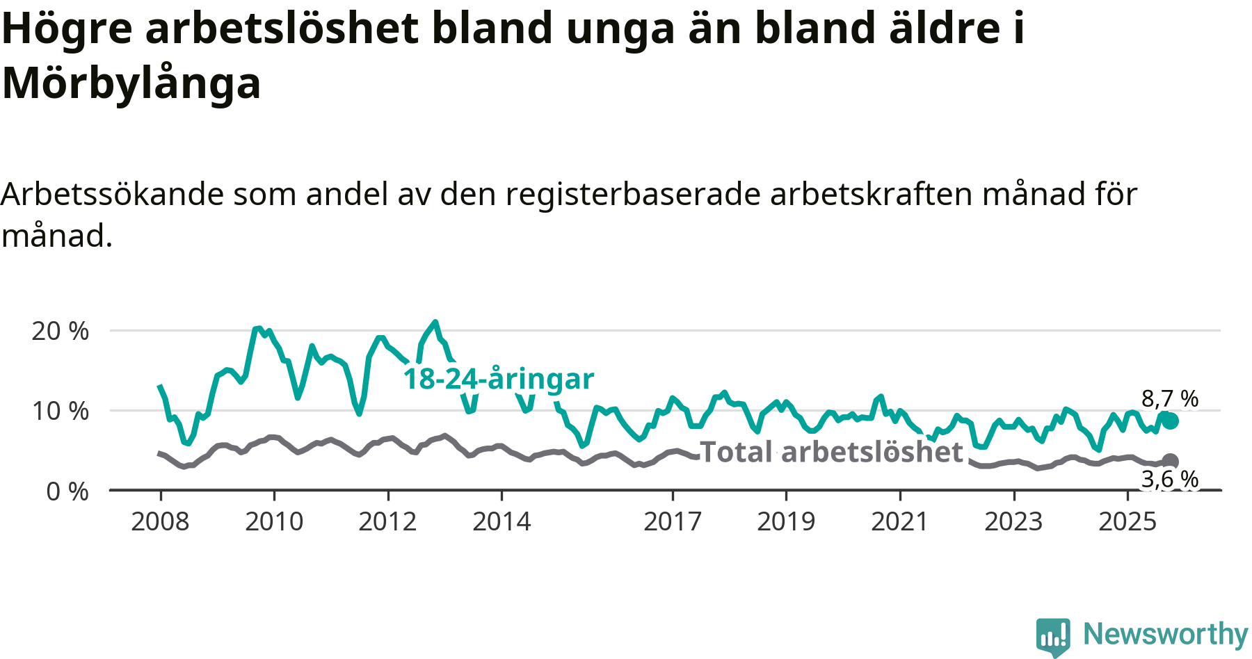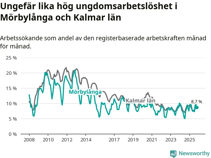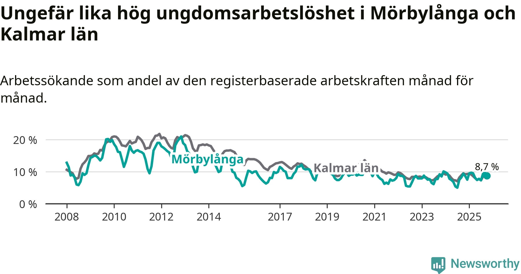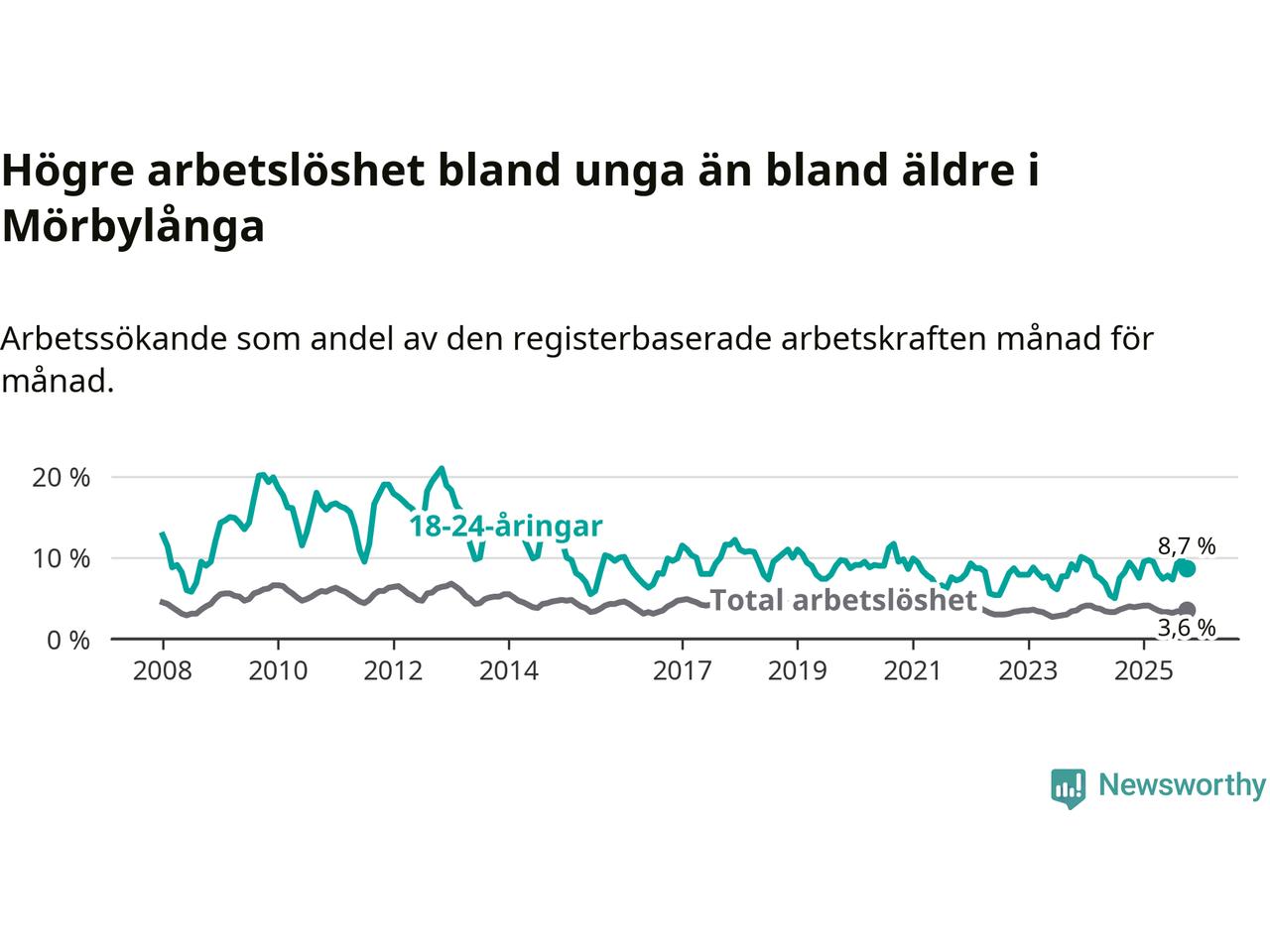 Medan Mörbylånga har lägre total arbetslöshet än Kalmar län, ligger ungdomsarbetslösheten på i stort sett samma nivå.