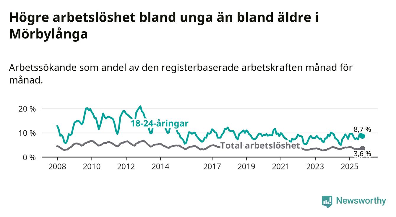 Den senaste månadsstatistiken från Arbetsförmedlingen visar på en nedgång i ungdomsarbetslöshet i Mörbylånga kommun med 0,7 procentenheter. Arbetslösheten bland personer i åldern 18–24 år låg i oktober på 8,7 procent.