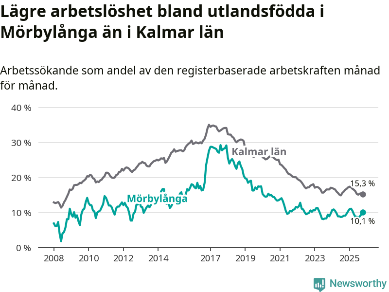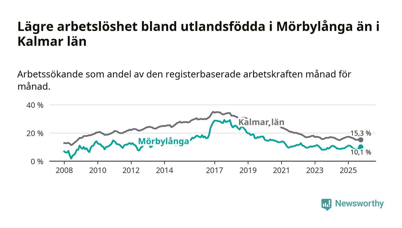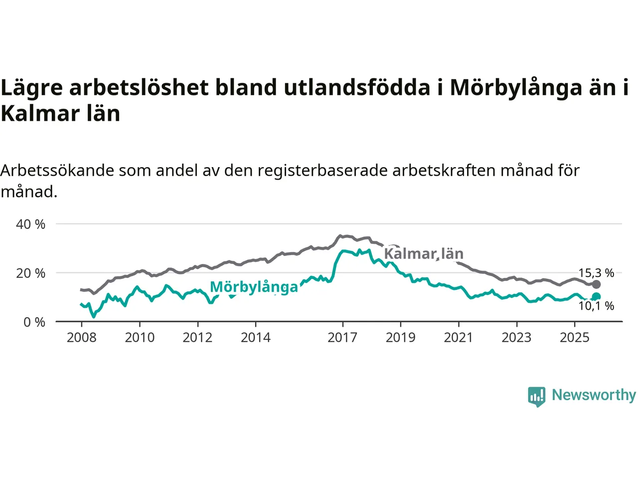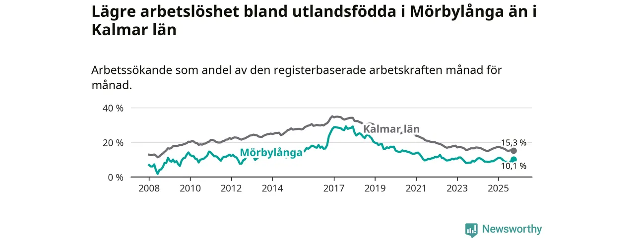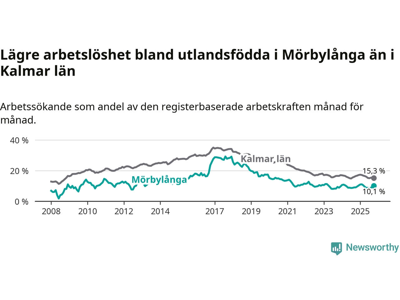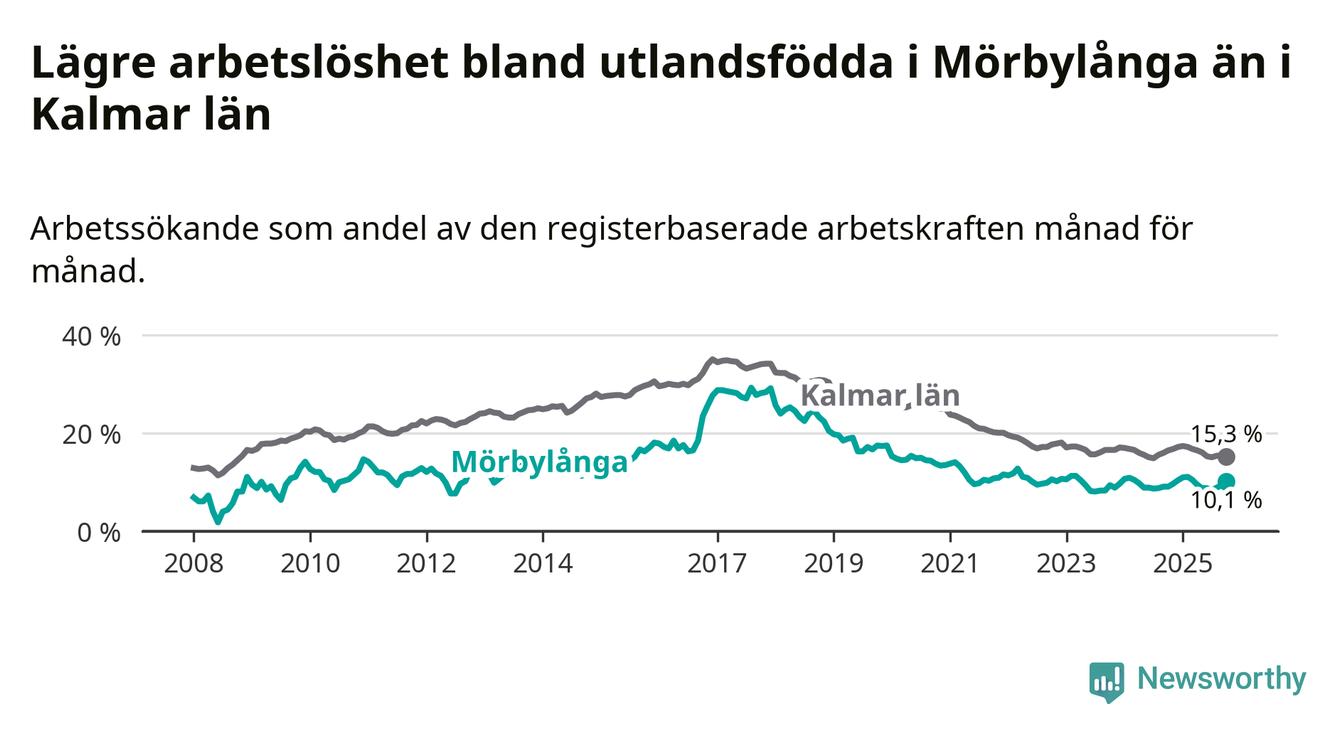 Medan arbetslösheten bland utlandsfödda alltså ökar i Mörbylånga så minskar den i Kalmar län. Jämfört med oktober förra året har andelen arbetslösa utlandsfödda i länet minskat med 1,2 procentenheter (till 15,3 procent). Trots den senaste uppgången har Mörbylånga med andra ord fortfarande lägre arbetslöshet bland utlandsfödda än Kalmar län.