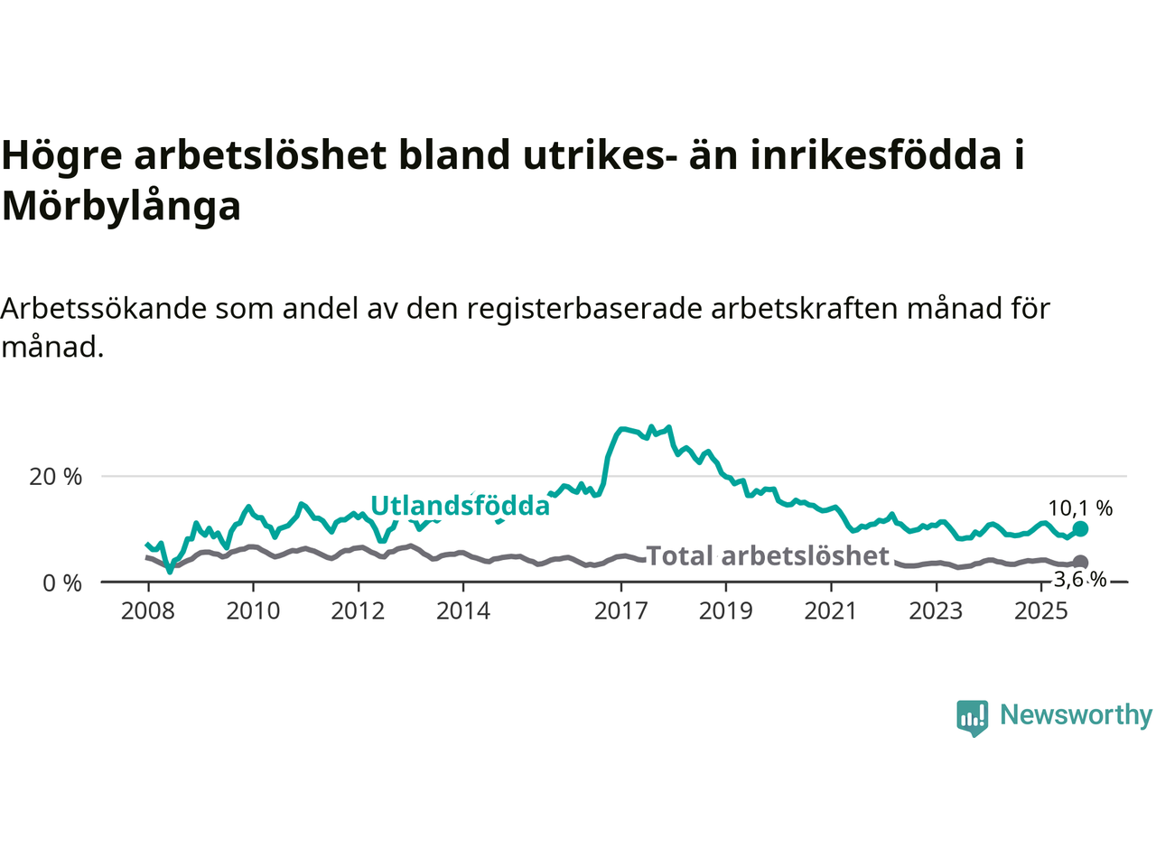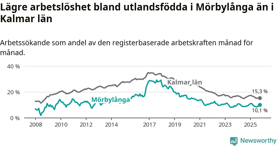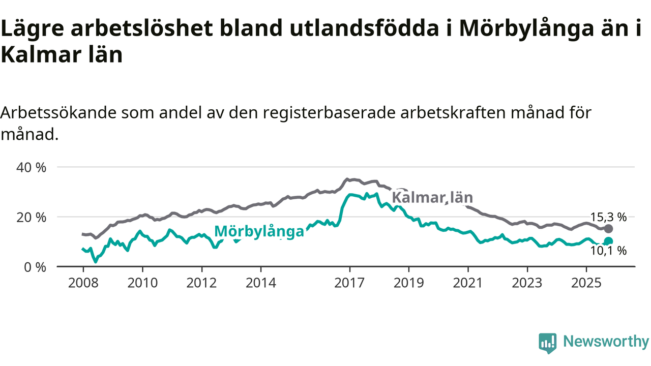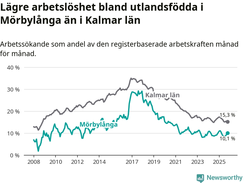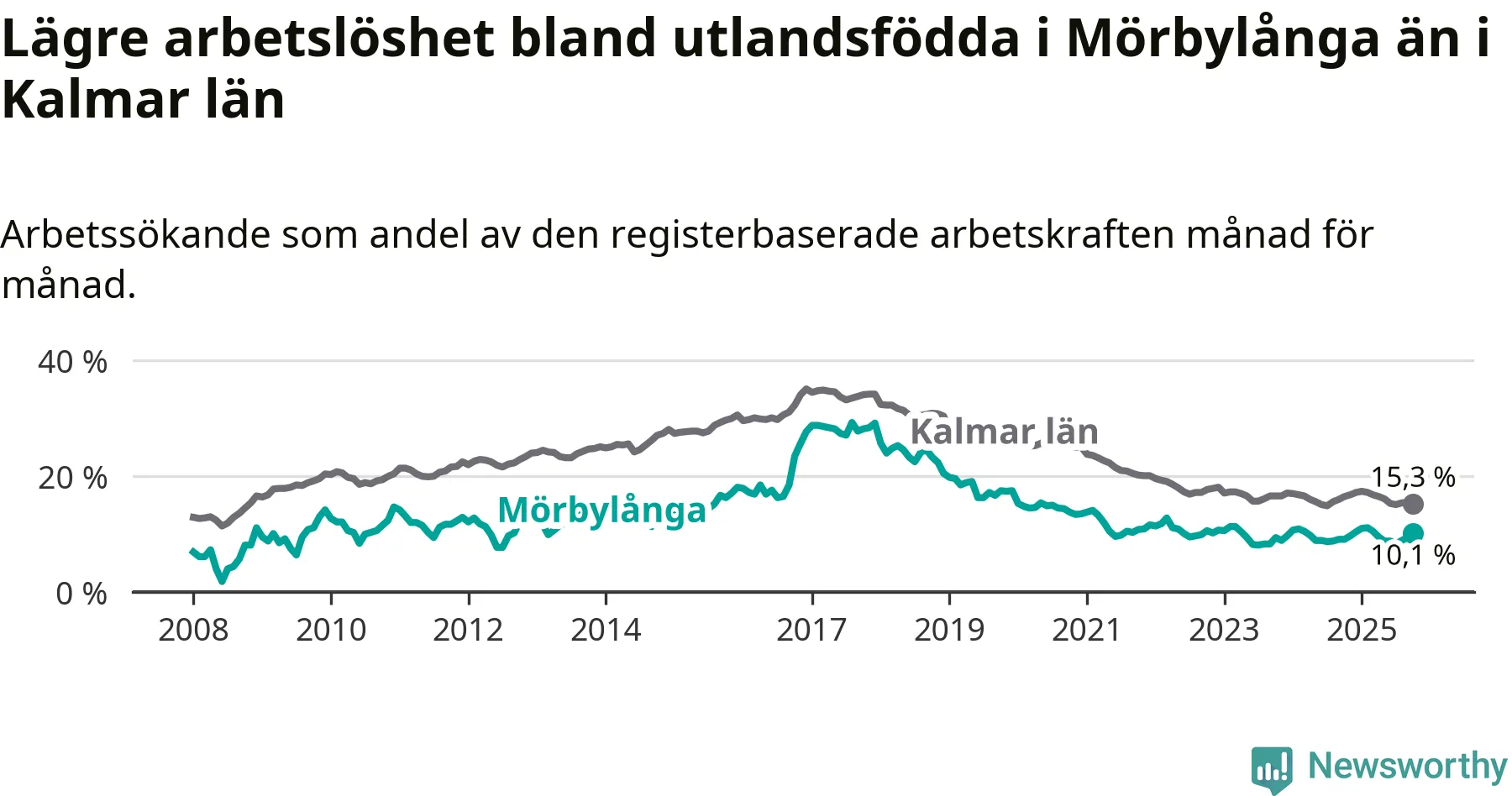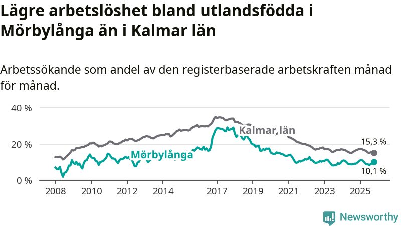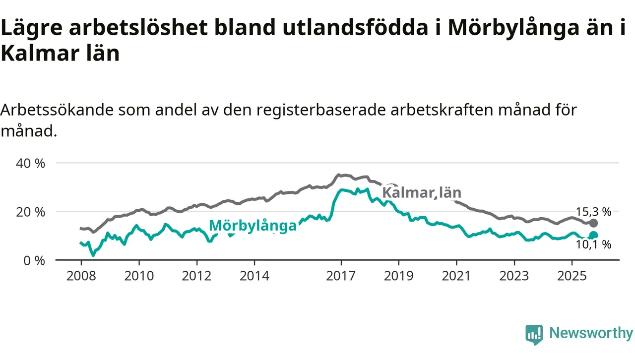 Medan arbetslösheten bland utlandsfödda alltså ökar i Mörbylånga så minskar den i Kalmar län. Jämfört med oktober förra året har andelen arbetslösa utlandsfödda i länet minskat med 1,2 procentenheter (till 15,3 procent). Trots den senaste uppgången har Mörbylånga med andra ord fortfarande lägre arbetslöshet bland utlandsfödda än Kalmar län.