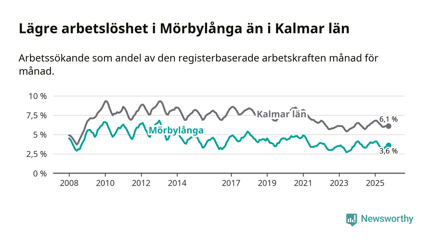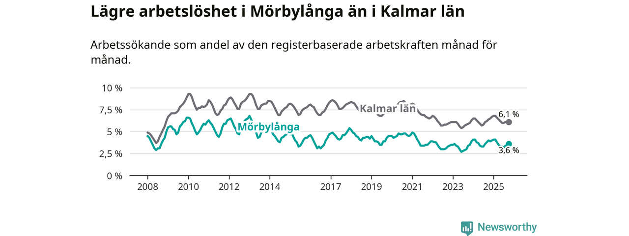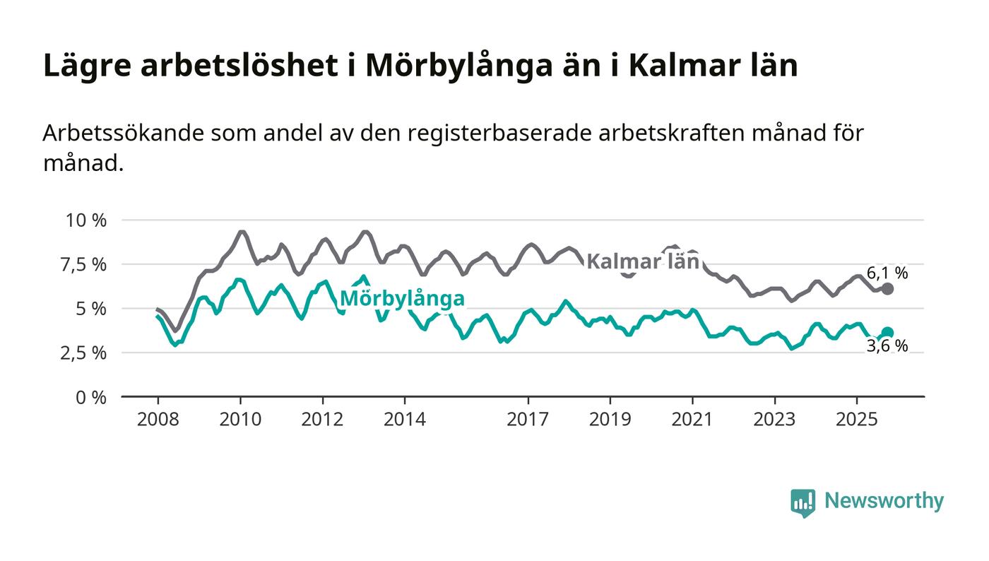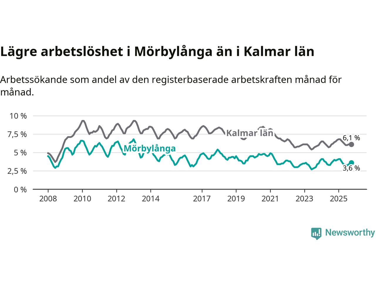 Under oktober månad rapporterade Mörbylånga kommun en total arbetslöshet på 3,6 procent. Det är en minskning jämfört med samma tidpunkt i fjol (−0,4 procentenheter). Även i Kalmar län sjunker arbetslösheten .