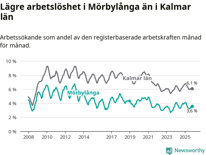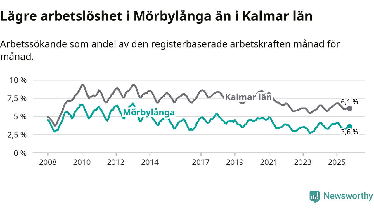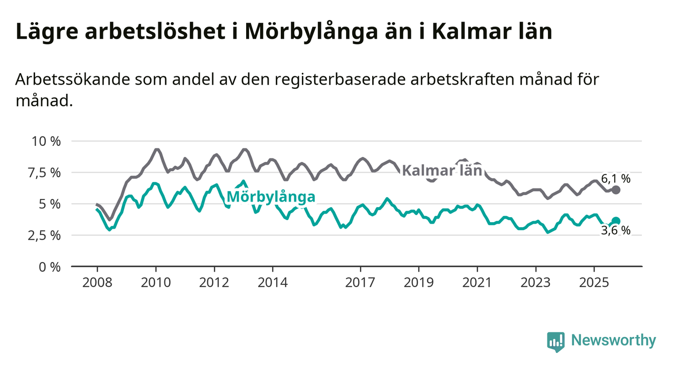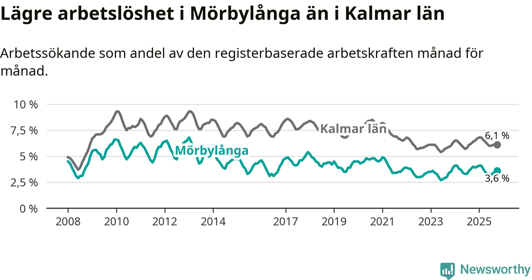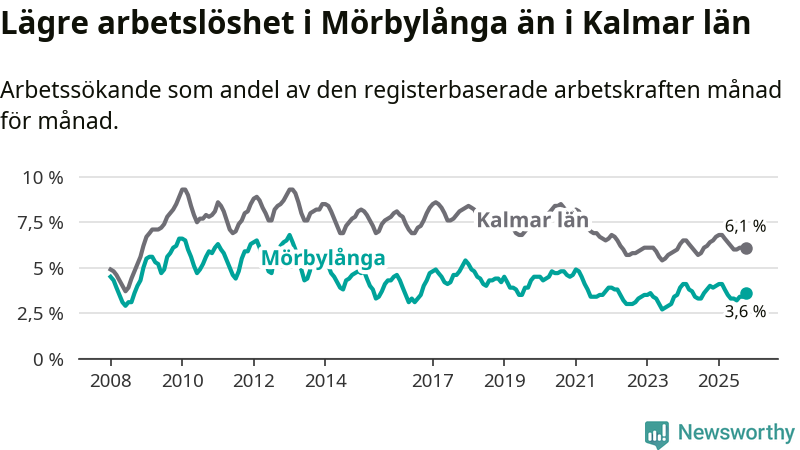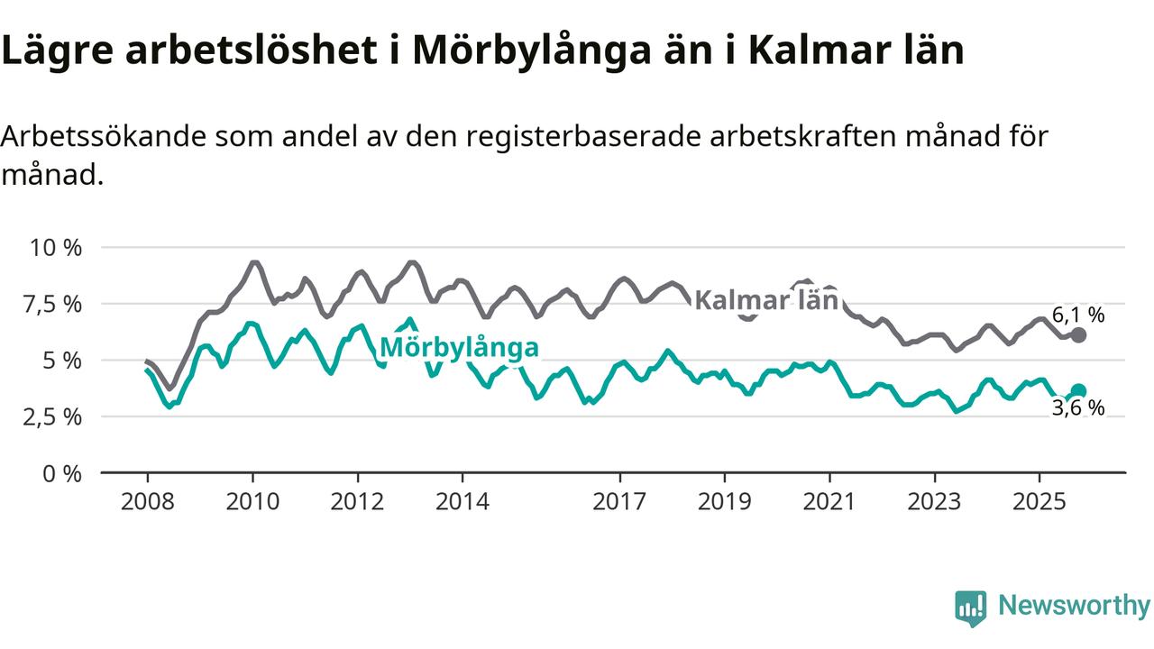 Under oktober månad rapporterade Mörbylånga kommun en total arbetslöshet på 3,6 procent. Det är en minskning jämfört med samma tidpunkt i fjol (−0,4 procentenheter). Även i Kalmar län sjunker arbetslösheten .