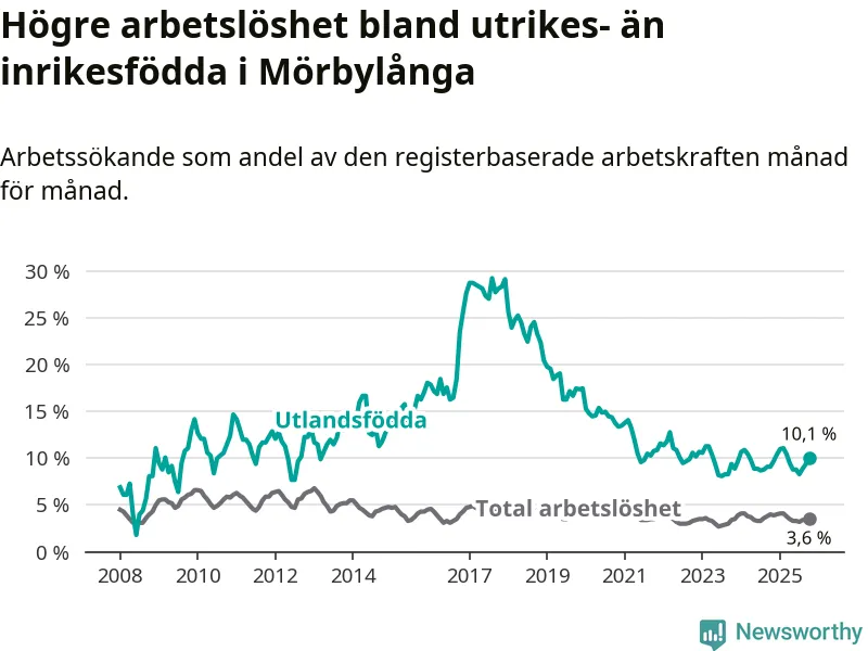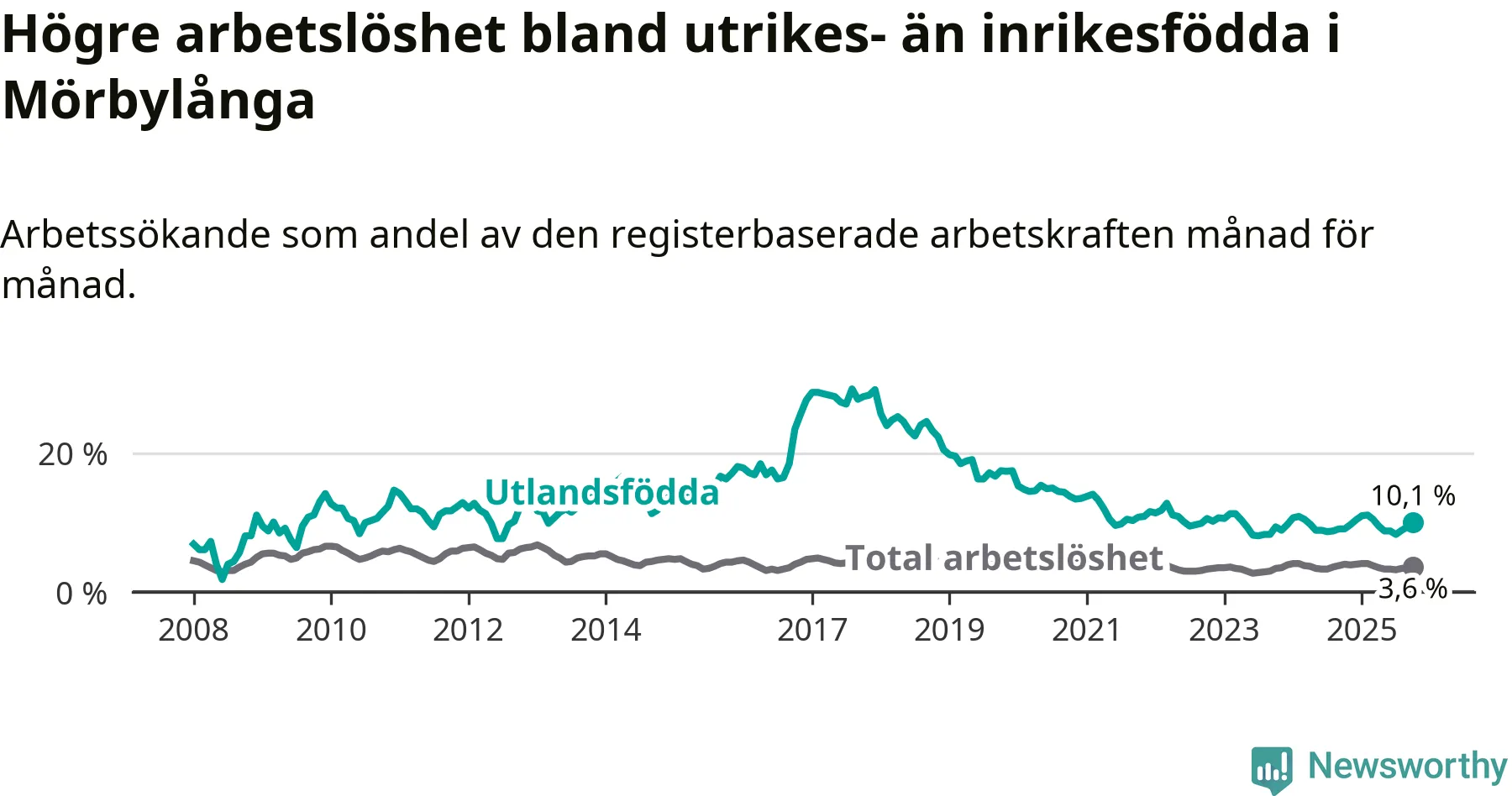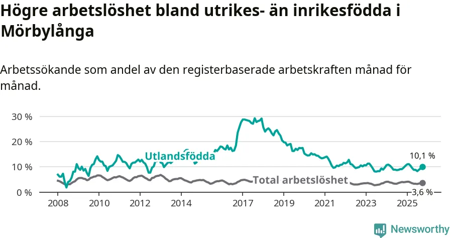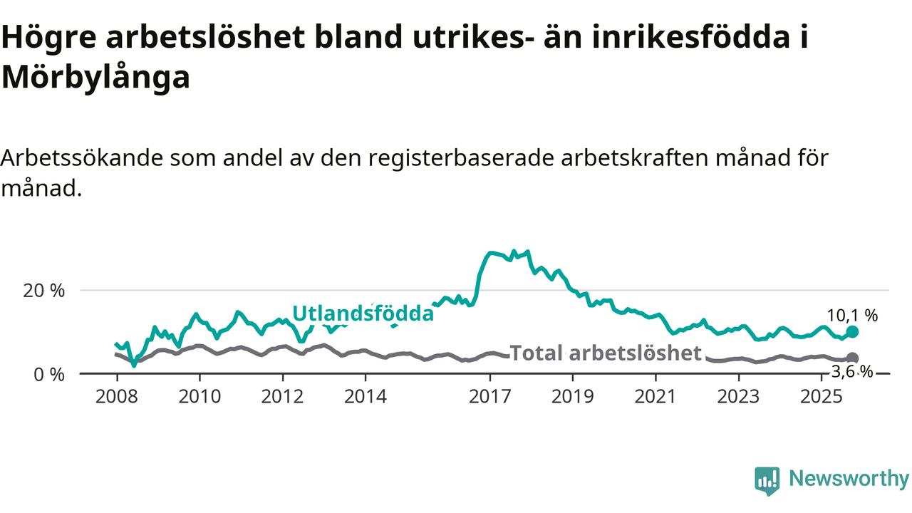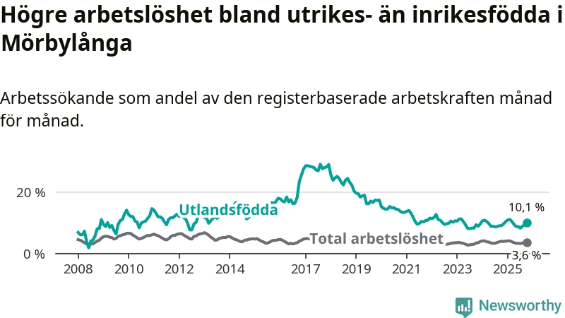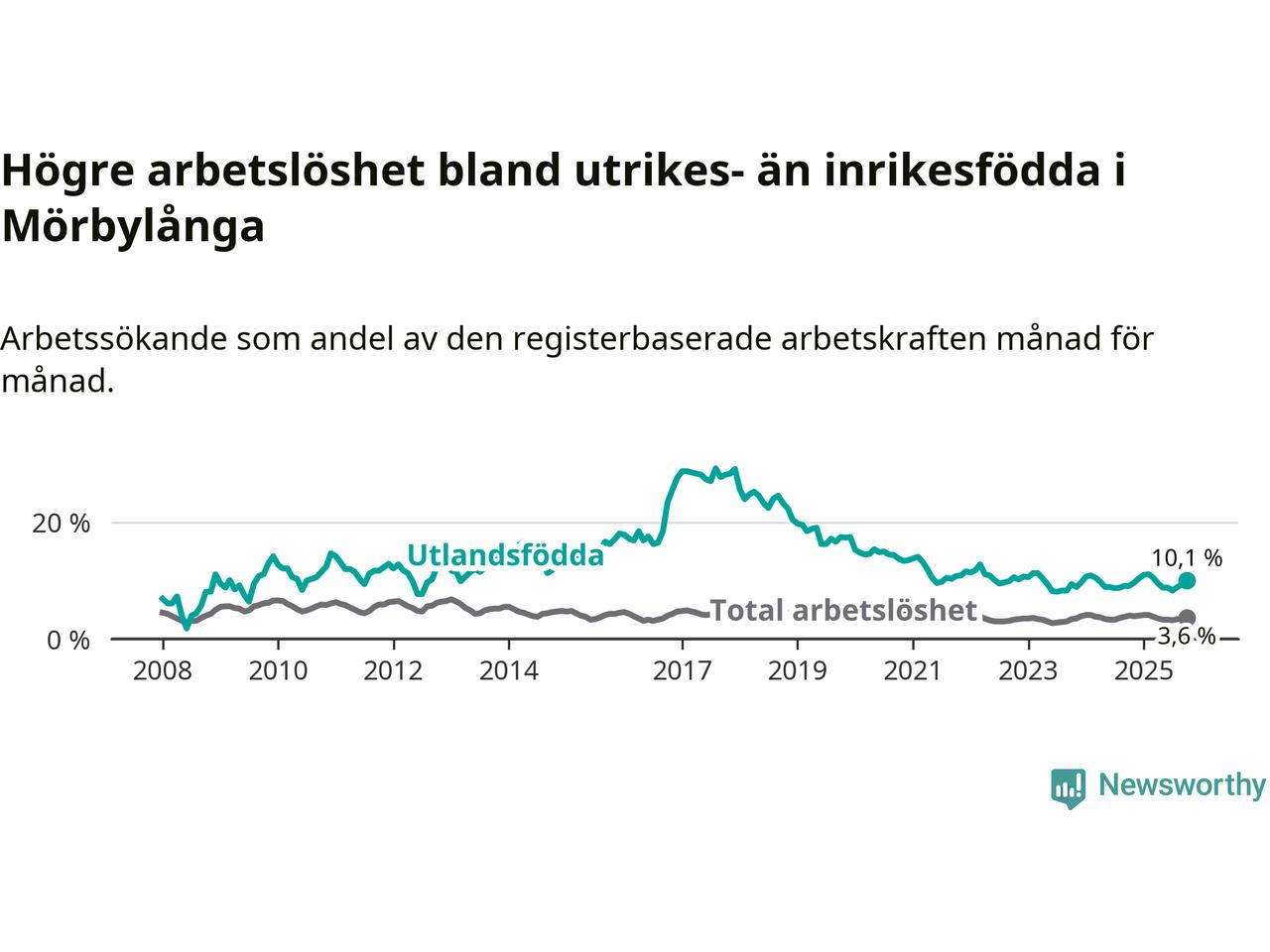 Arbetslösheten bland utlandsfödda var 10,1 procent i Mörbylånga under oktober månad, motsvarande 77 av 762 personer. Det är 1,0 procentenheter fler än vid samma tidpunkt i fjol (+9 om man räknar personer).