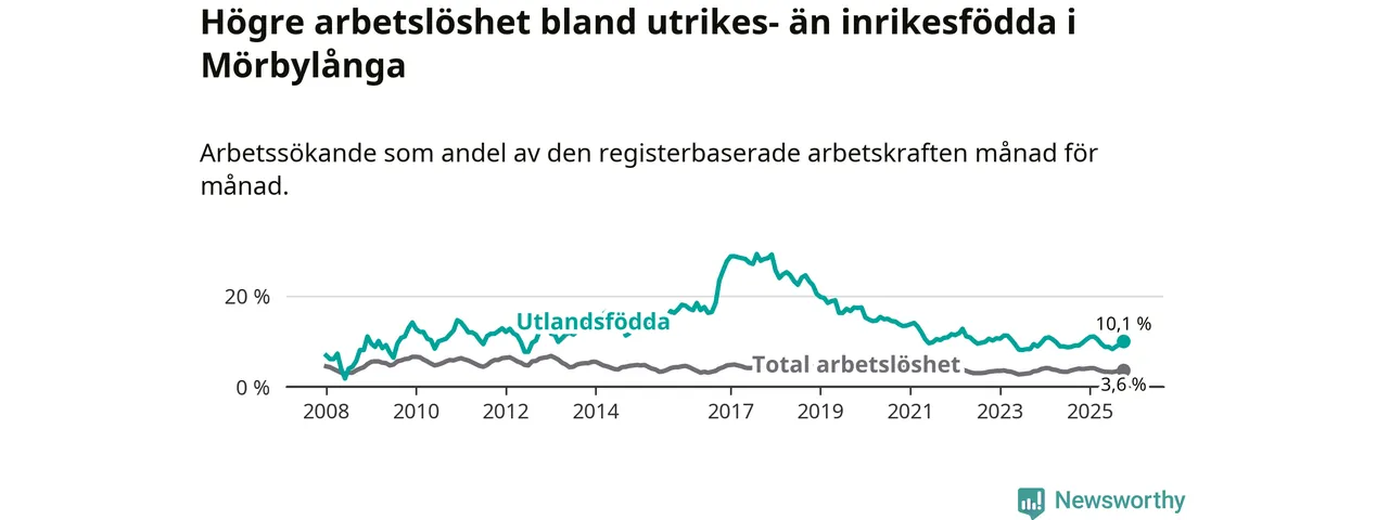 Skillnaden i arbetslöshet mellan utrikesfödda och hela befolkningen är 6,5 procentenheter i Mörbylånga. Det är en större skillnad än för ett år sedan (+1,4 procentenheter).