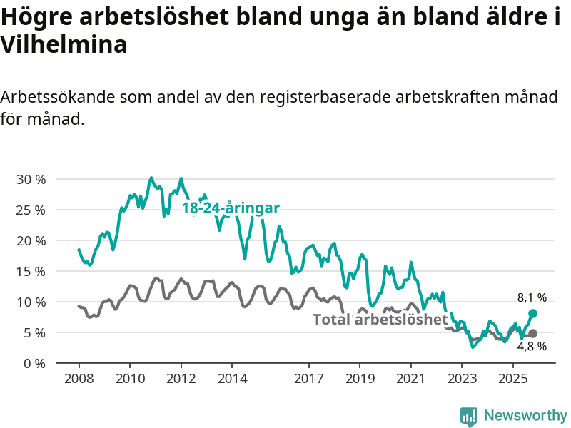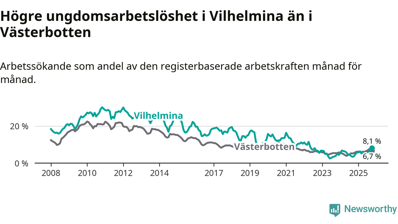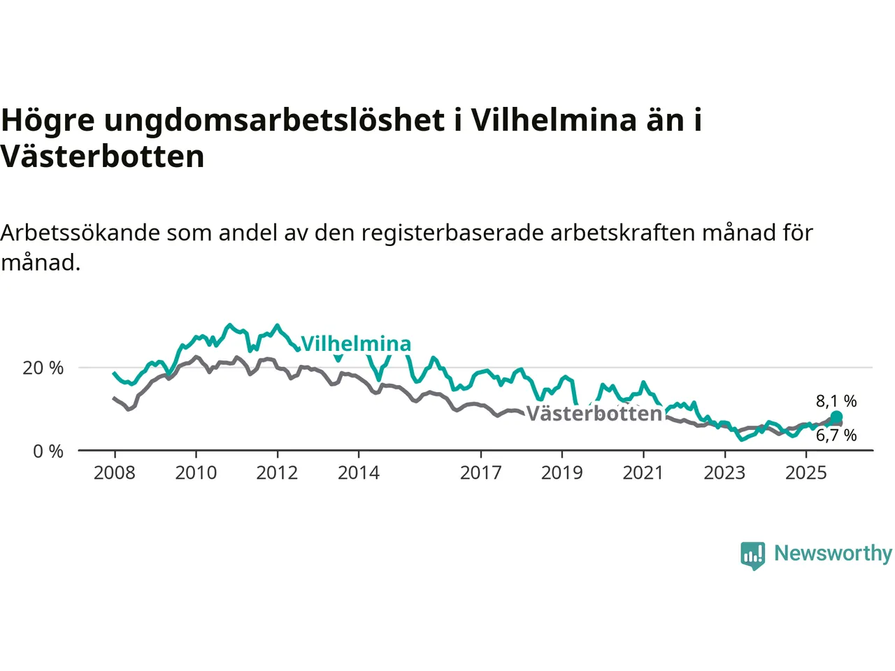 Medan Vilhelmina har ungefär samma total arbetslöshet som Västerbotten, ligger ungdomsarbetslösheten 1,4 procentenheter högre i Vilhelmina.