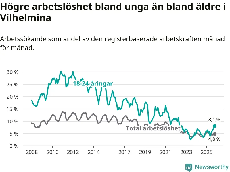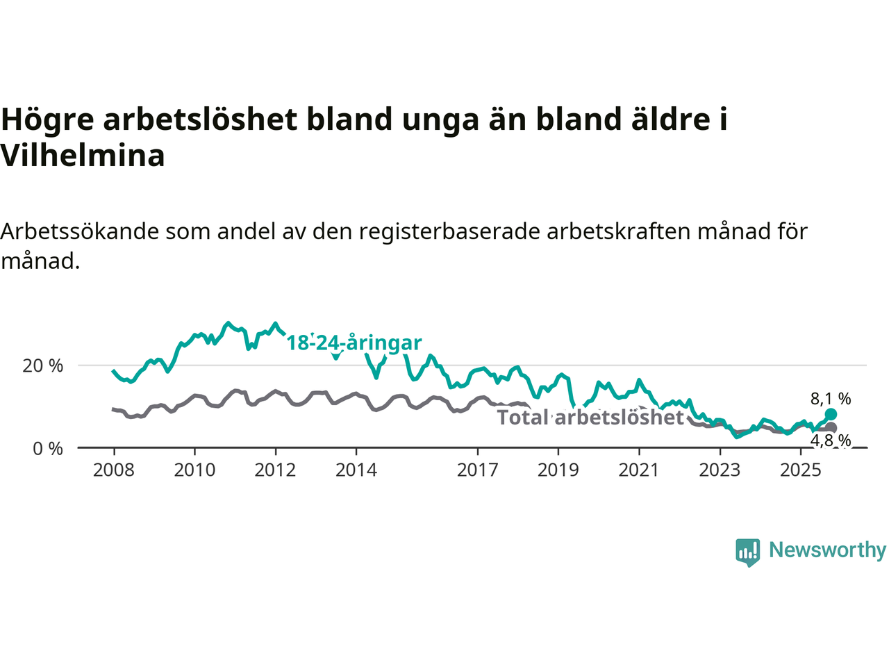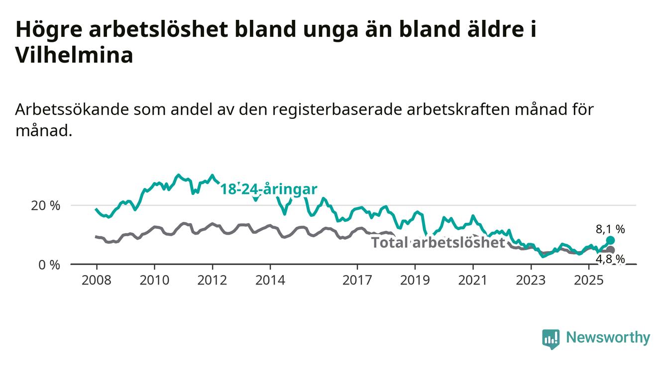 Den senaste månadsstatistiken från Arbetsförmedlingen visar på en uppgång i ungdoms­arbetslöshet i Vilhelmina kommun med 4,4 procentenheter. Arbetslösheten bland personer i åldern 18–24 år låg i oktober på 8,1 procent.