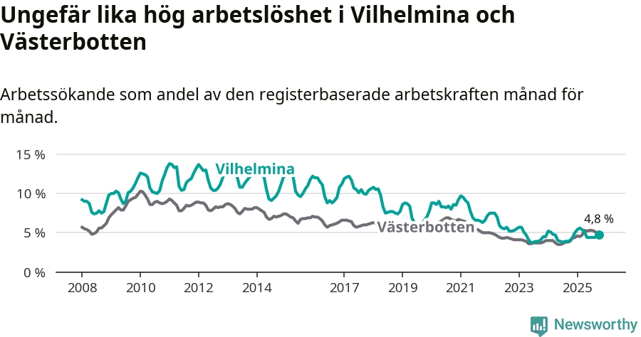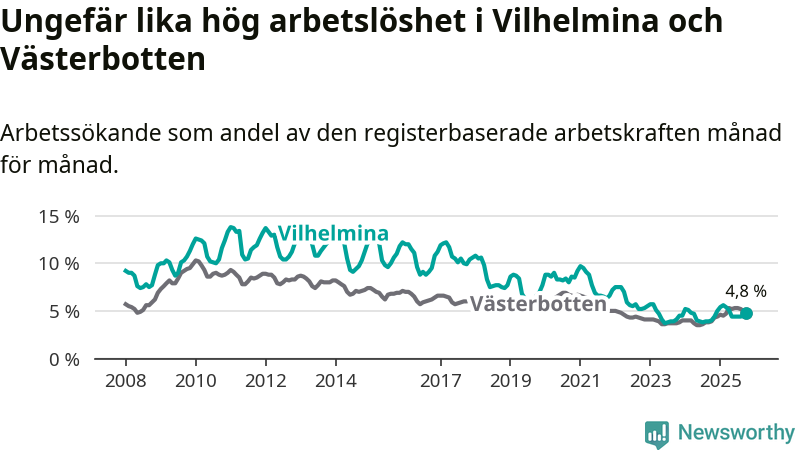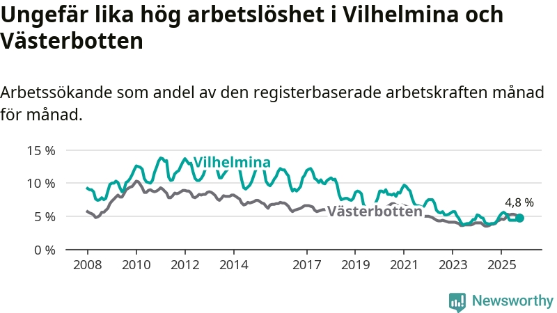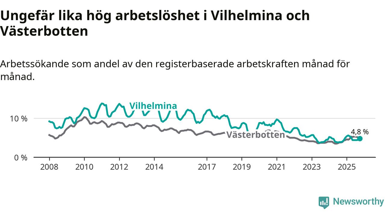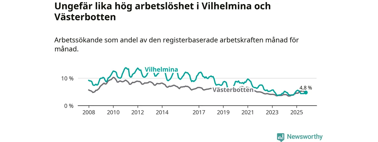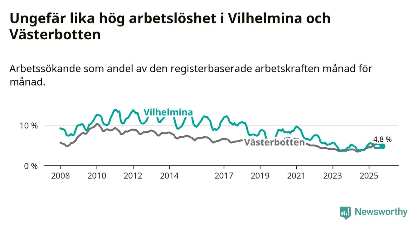 Under oktober månad rapporterade Vilhelmina kommun en total arbetslöshet på 4,8 procent. Det är en ökning jämfört med samma tidpunkt i fjol (+0,8 procentenheter). Även i Västerbottens län stiger arbetslösheten .