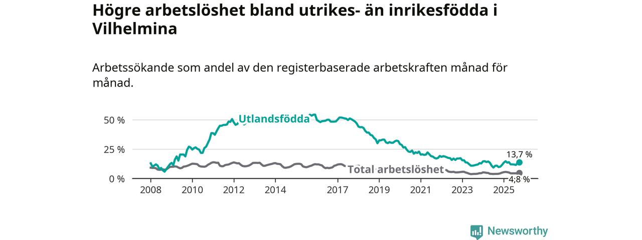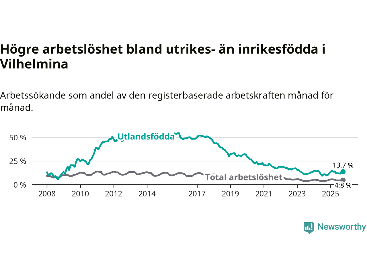Skillnaden i arbetslöshet mellan utrikesfödda och hela befolkningen är 8,9 procentenheter i Vilhelmina. Det är en betydligt större skillnad än för ett år sedan (+3,2 procentenheter).