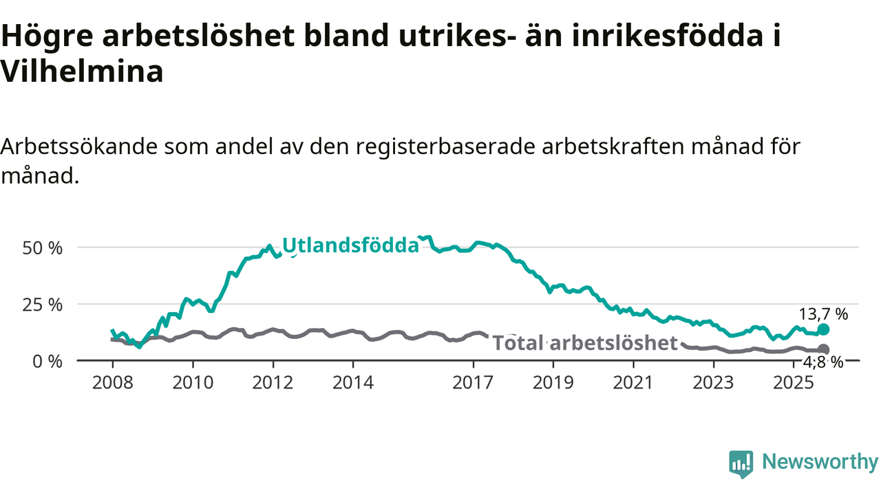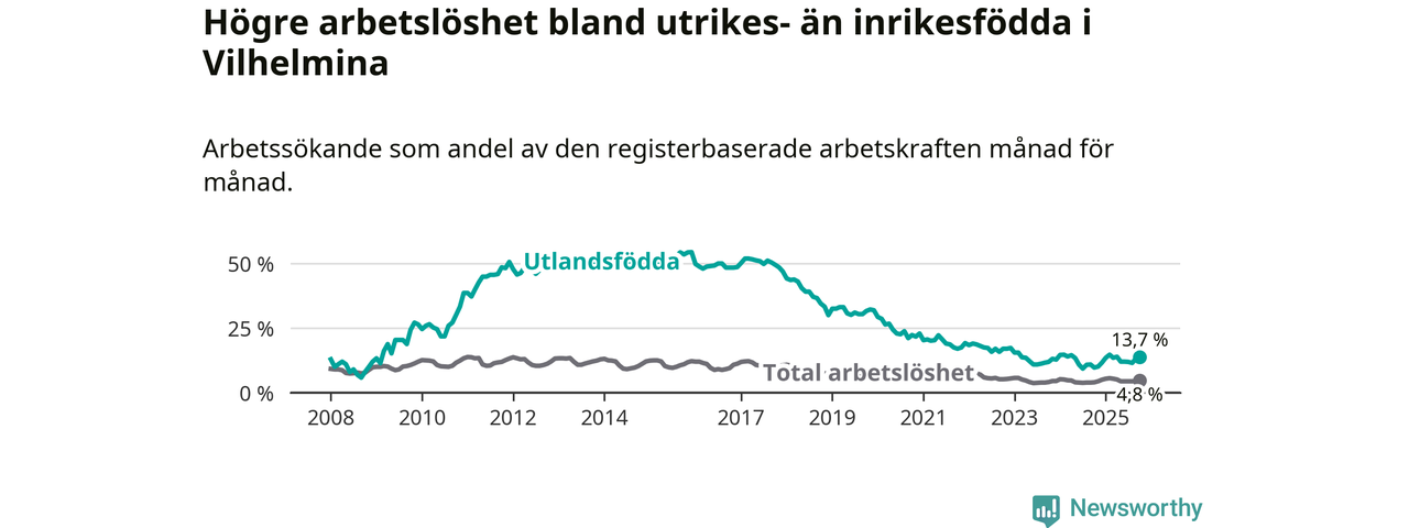 Arbetslösheten bland utlandsfödda var 13,7 procent i Vilhelmina under oktober månad, motsvarande 37 av 270 personer. Det är 4,0 procentenheter fler än vid samma tidpunkt i fjol (+11 om man räknar personer).