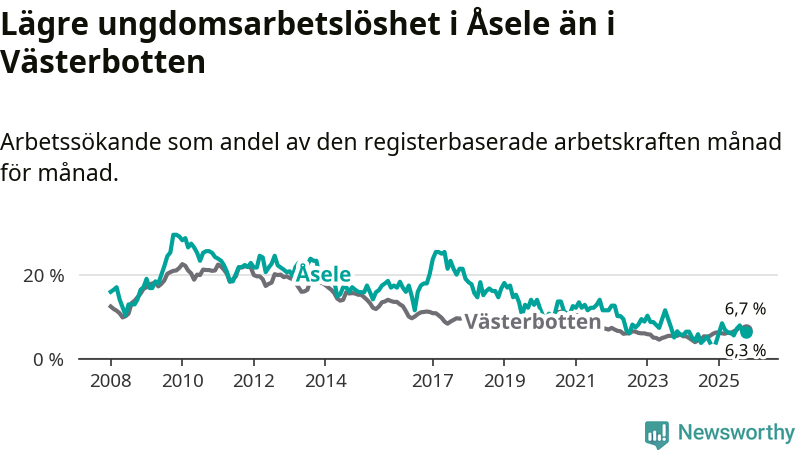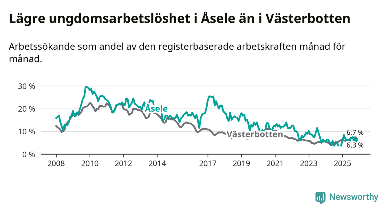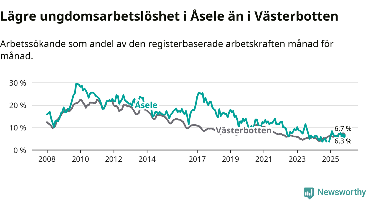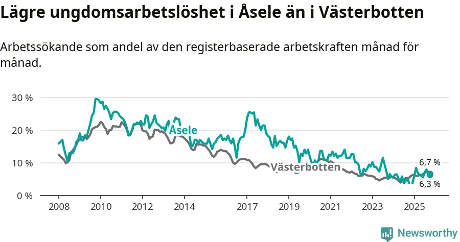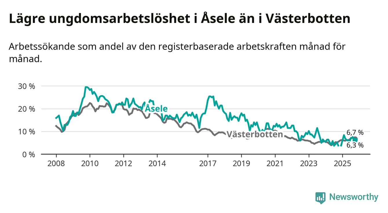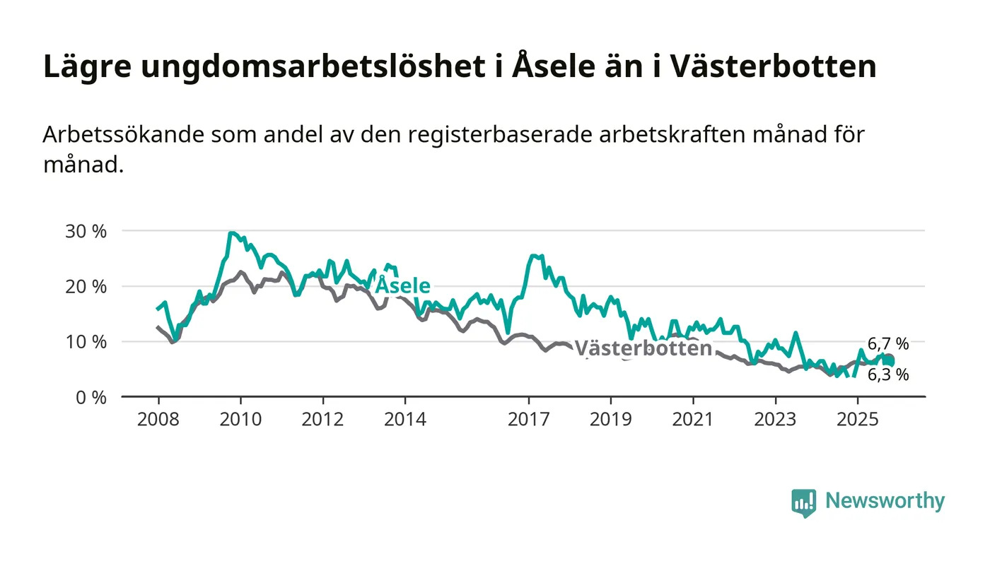 Medan Åsele har ungefär samma total arbetslöshet som Västerbotten, ligger ungdomsarbetslösheten 0,4 procentenheter lägre i Åsele.