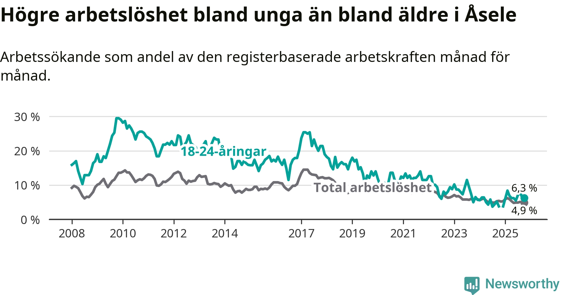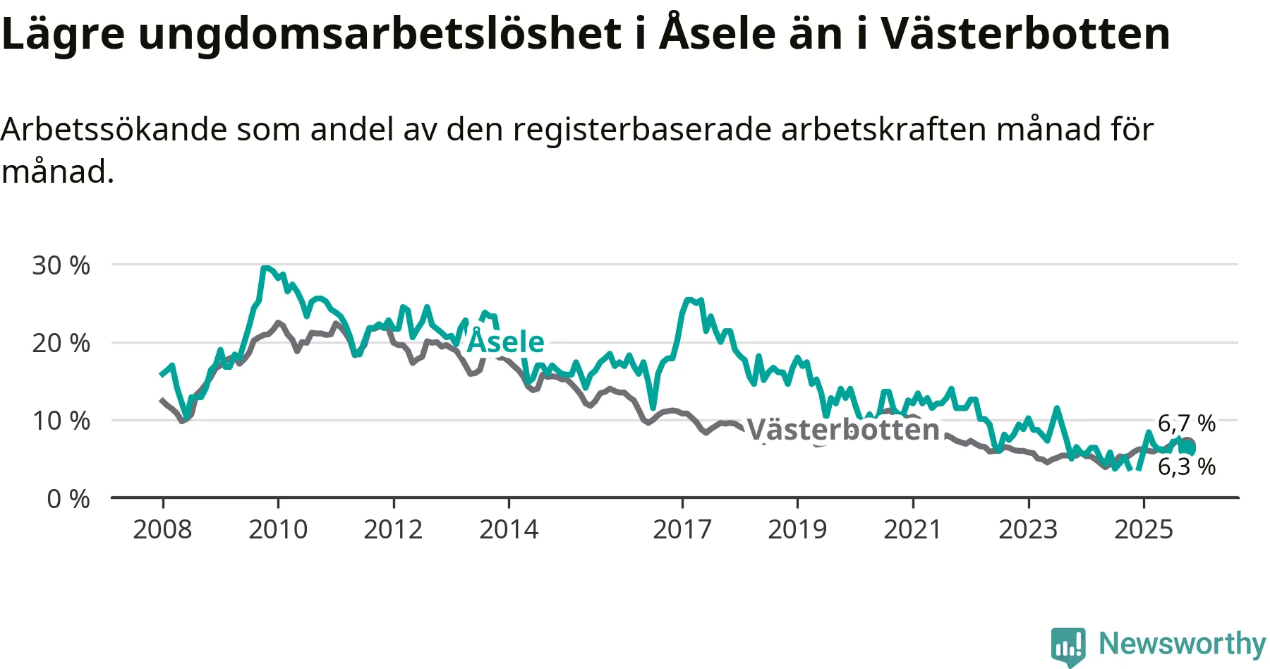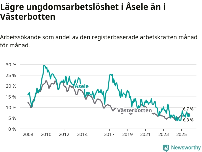 Graf: Arbetslöshet bland unga i Åsele kommun och Västerbottens län