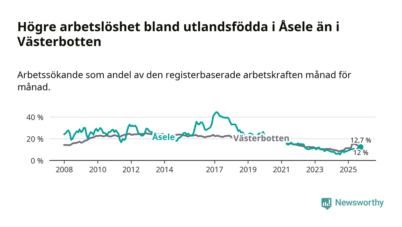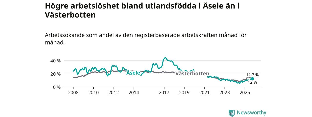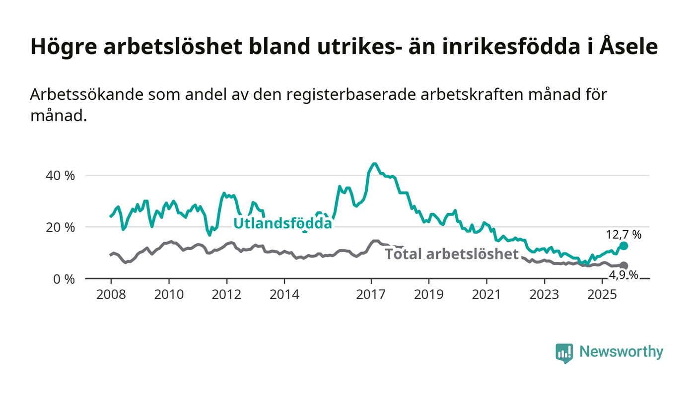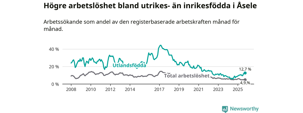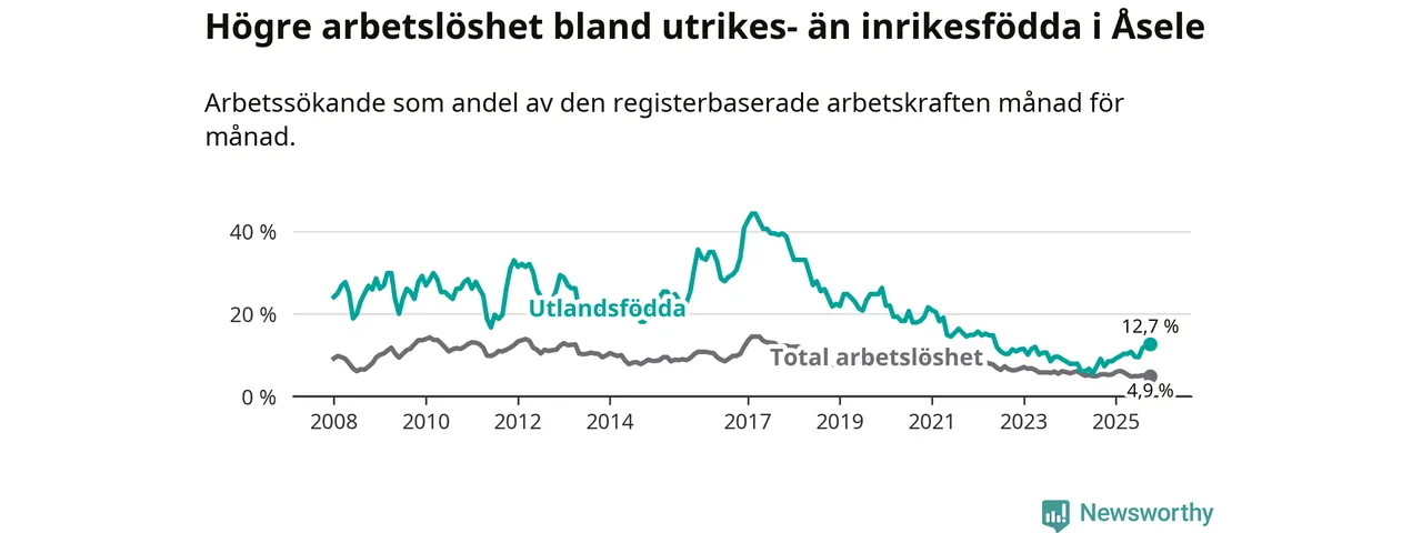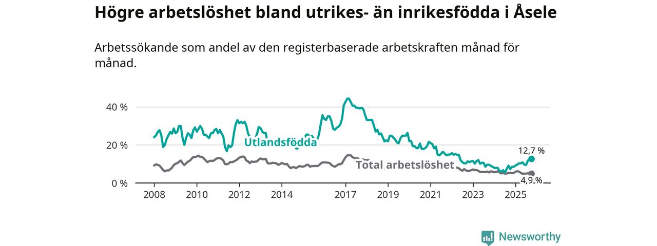 Arbetslösheten bland utlandsfödda var 12,7 procent i Åsele under oktober månad, motsvarande 22 av 173 personer. Det är 5,4 procentenheter fler än vid samma tidpunkt i fjol (+10 om man räknar personer). Därmed är de utlandsföddas arbetslöshet högre än vid samma tidpunkt i fjol för tionde månaden i följd. Sedan december 2024 har arbetslösheten bland utlandsfödda ökat från 8,5 till 12,7 procent. Den nuvarande arbetslöshetsnivån är den högsta sedan maj 2022.