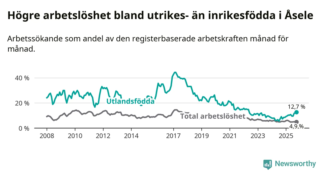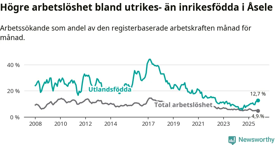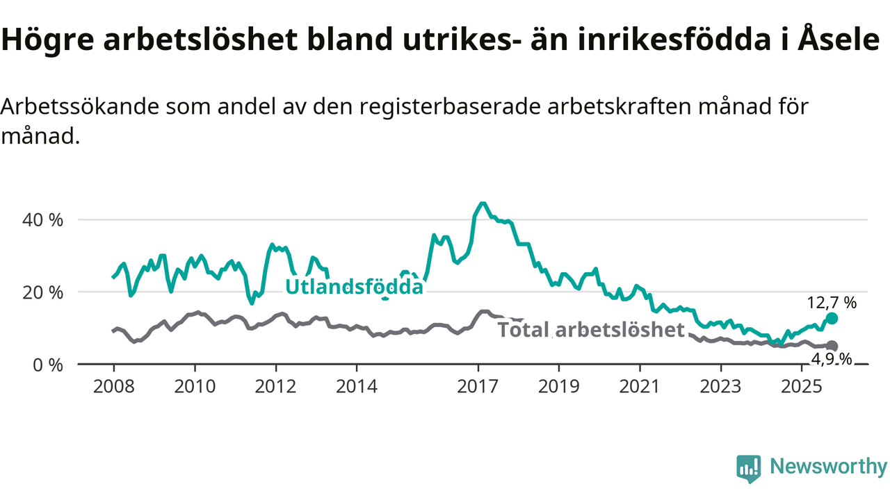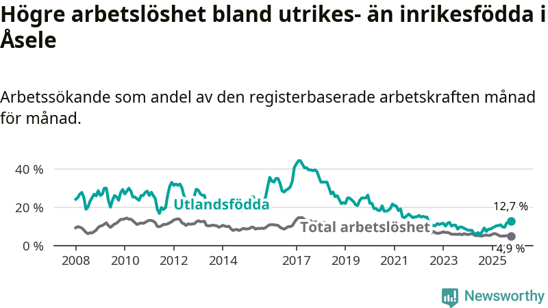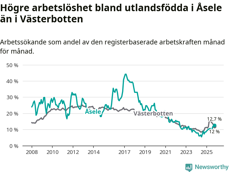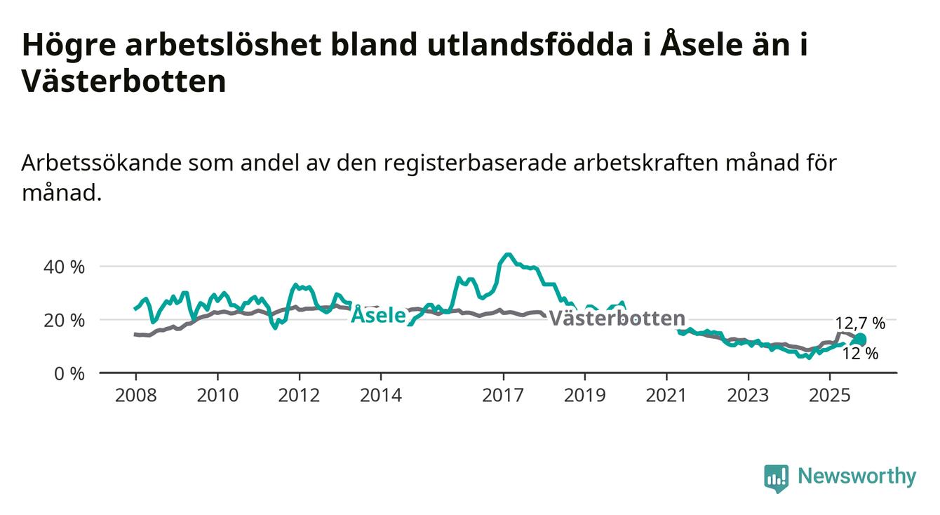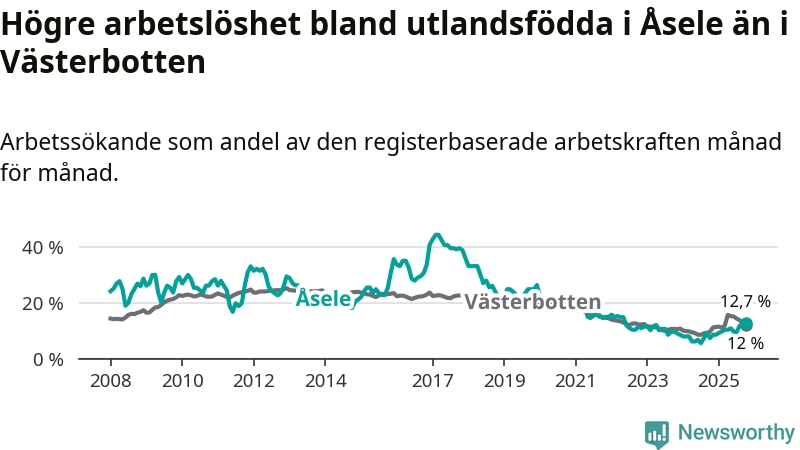 Arbetslösheten bland utlandsfödda var 12,7 procent i Åsele under oktober månad, motsvarande 22 av 173 personer. Det är 5,4 procentenheter fler än vid samma tidpunkt i fjol (+10 om man räknar personer). Därmed är de utlandsföddas arbetslöshet högre än vid samma tidpunkt i fjol för tionde månaden i följd. Sedan december 2024 har arbetslösheten bland utlandsfödda ökat från 8,5 till 12,7 procent. Den nuvarande arbetslöshetsnivån är den högsta sedan maj 2022.