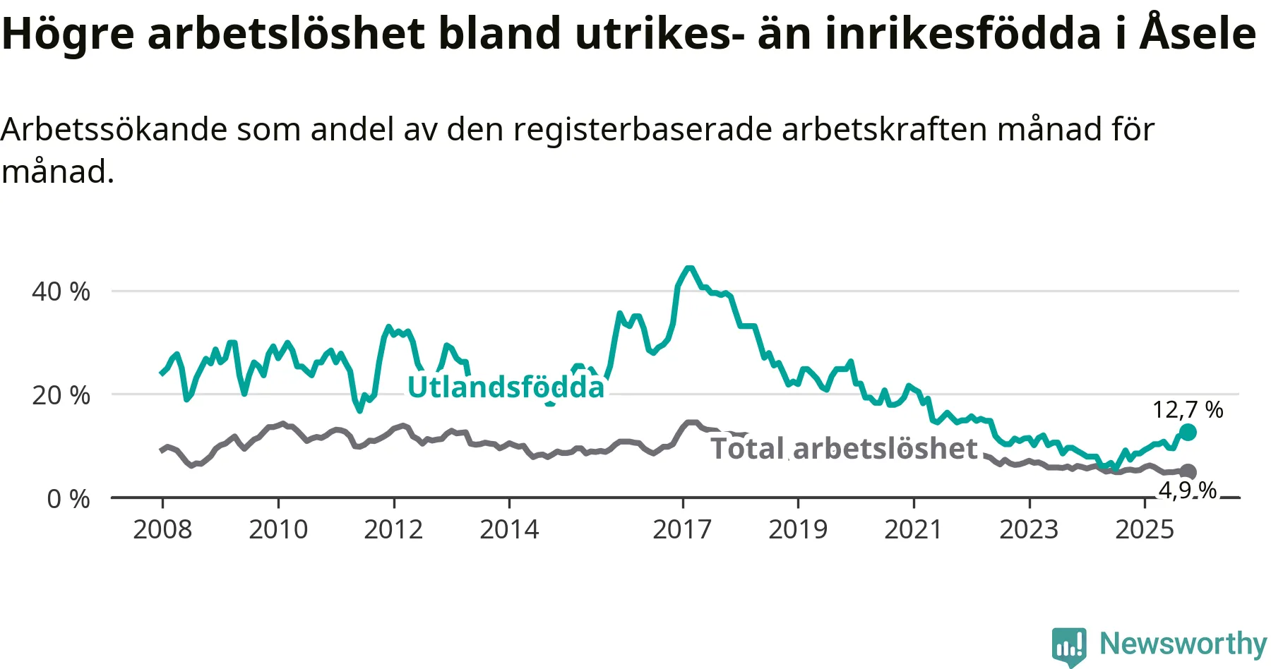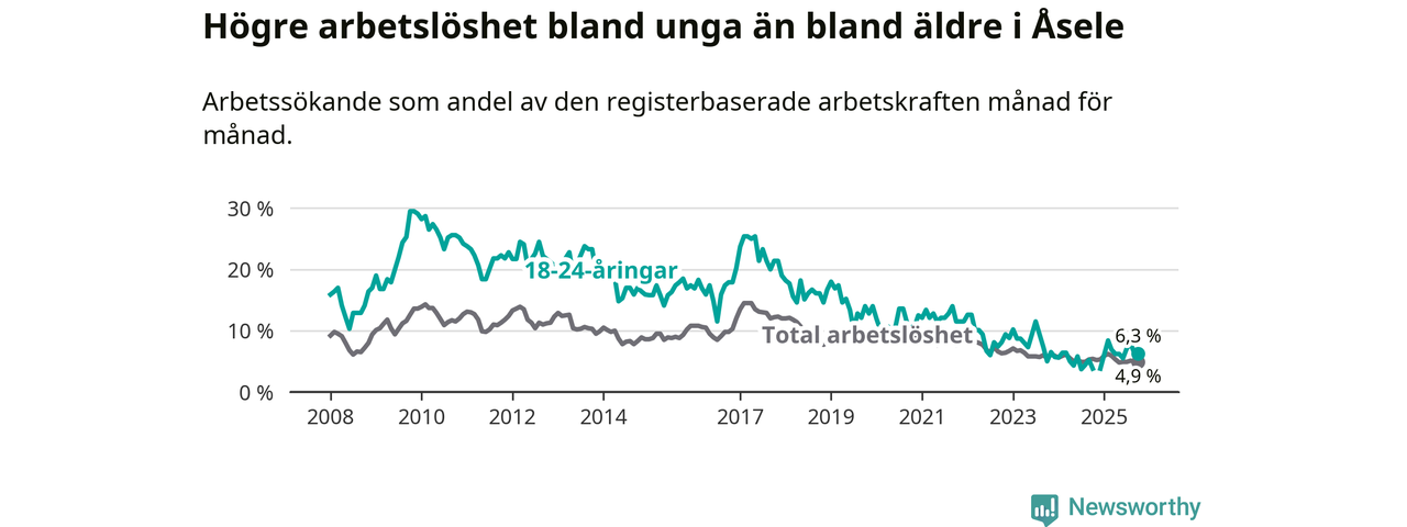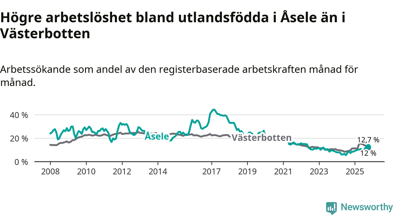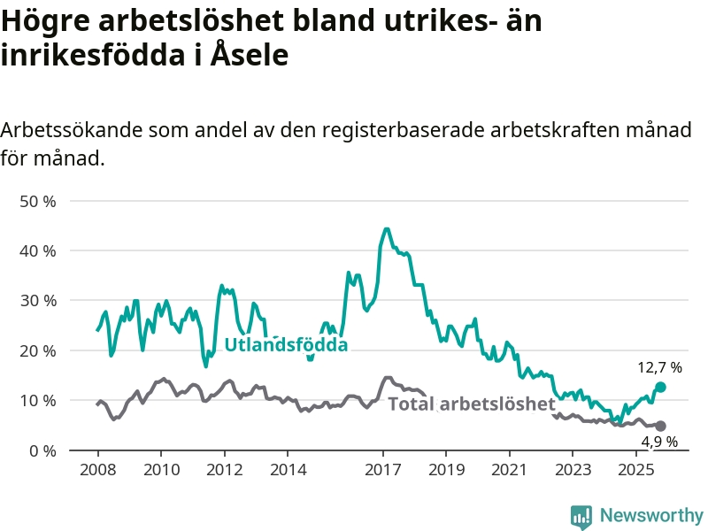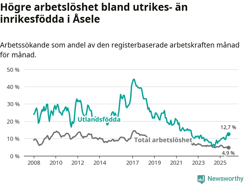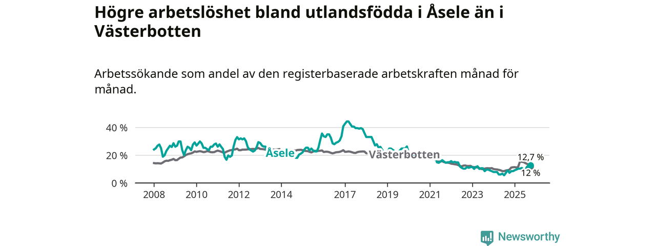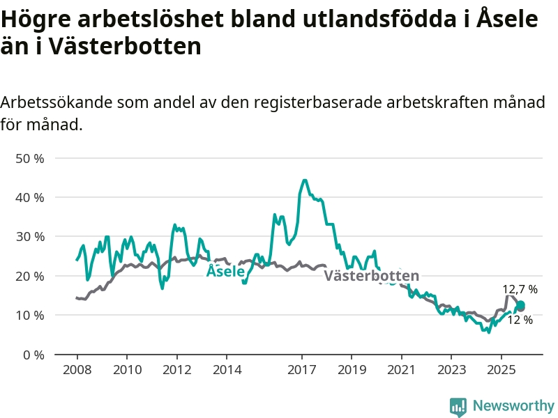 Arbetslösheten bland utlandsfödda var 12,7 procent i Åsele under oktober månad, motsvarande 22 av 173 personer. Det är 5,4 procentenheter fler än vid samma tidpunkt i fjol (+10 om man räknar personer). Därmed är de utlandsföddas arbetslöshet högre än vid samma tidpunkt i fjol för tionde månaden i följd. Sedan december 2024 har arbetslösheten bland utlandsfödda ökat från 8,5 till 12,7 procent. Den nuvarande arbetslöshetsnivån är den högsta sedan maj 2022.