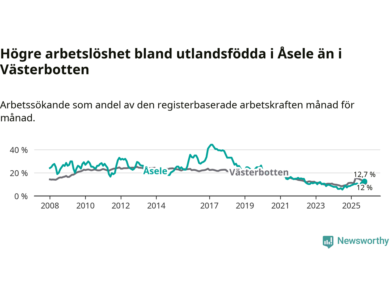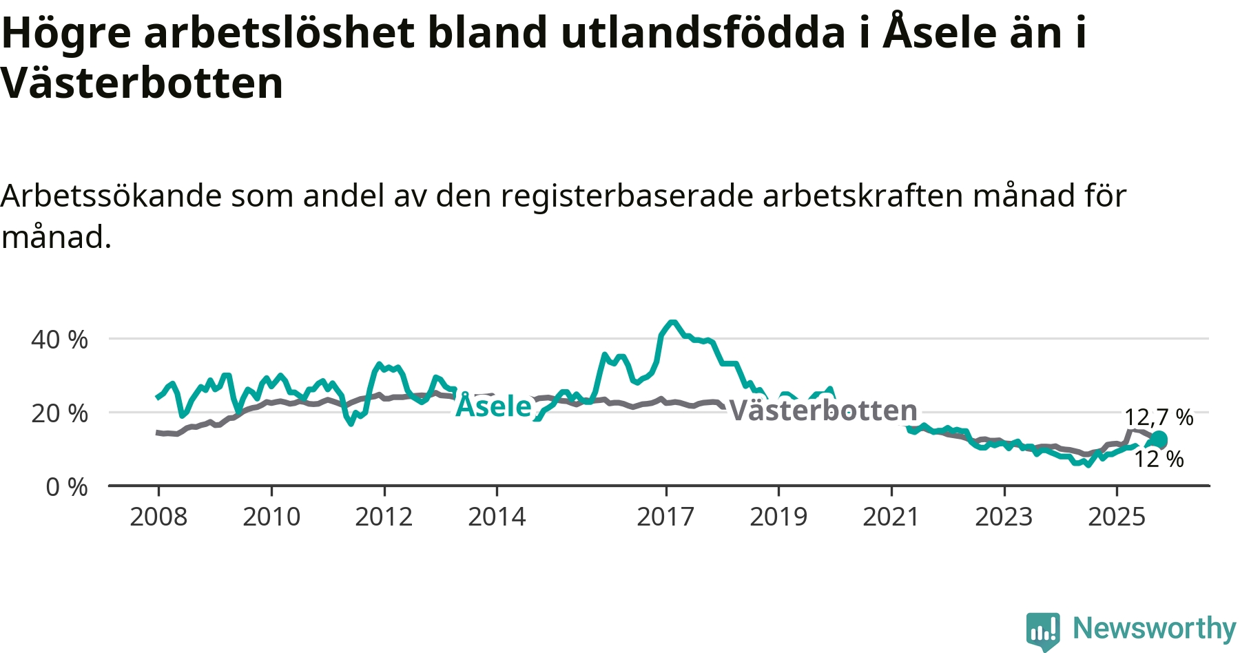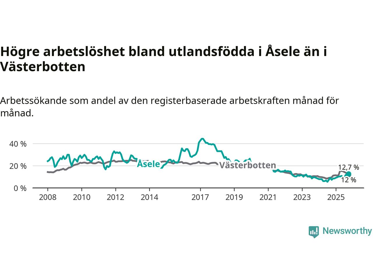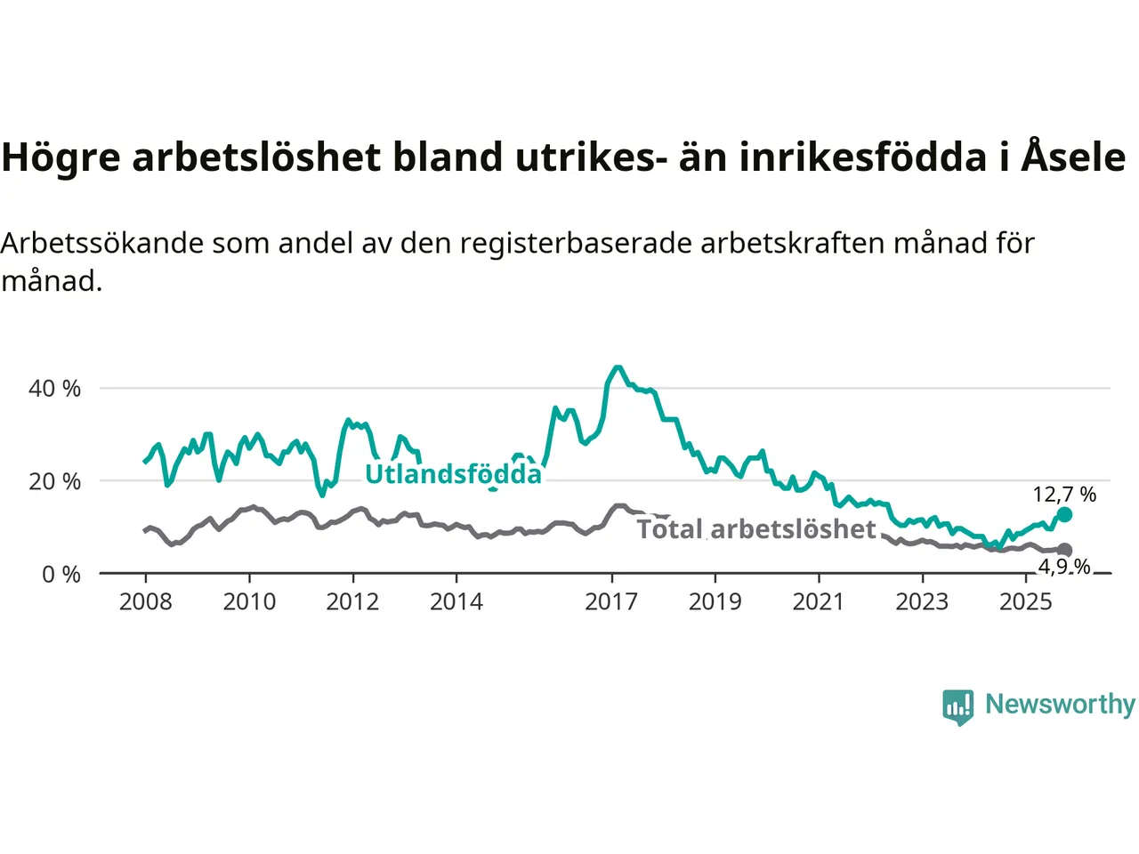 Arbetslösheten bland utlandsfödda var 12,7 procent i Åsele under oktober månad, motsvarande 22 av 173 personer. Det är 5,4 procentenheter fler än vid samma tidpunkt i fjol (+10 om man räknar personer). Därmed är de utlandsföddas arbetslöshet högre än vid samma tidpunkt i fjol för tionde månaden i följd. Sedan december 2024 har arbetslösheten bland utlandsfödda ökat från 8,5 till 12,7 procent. Den nuvarande arbetslöshetsnivån är den högsta sedan maj 2022.