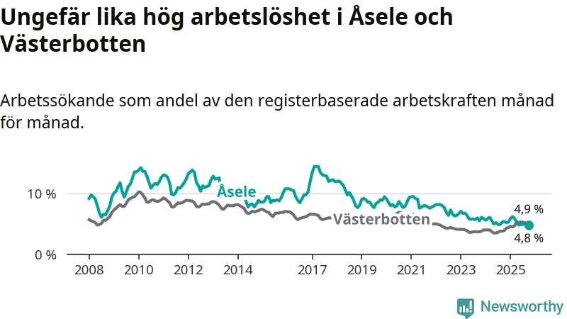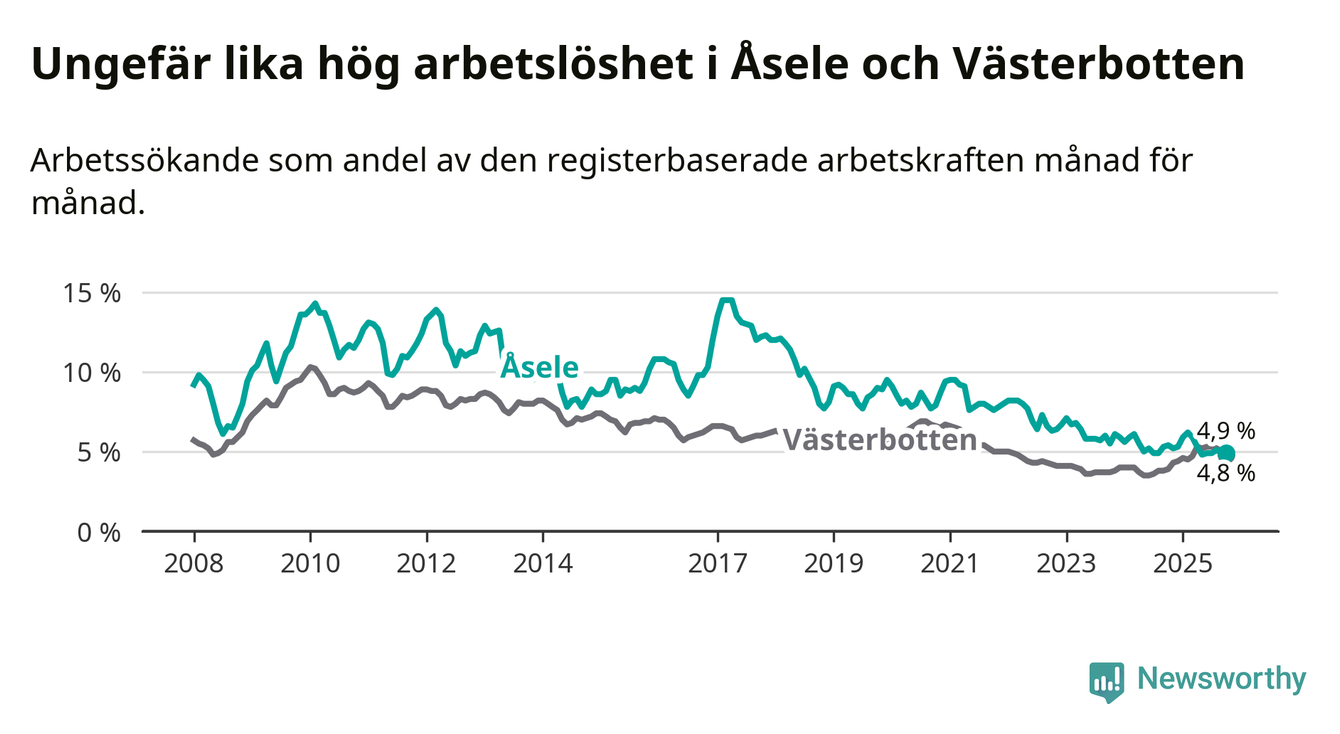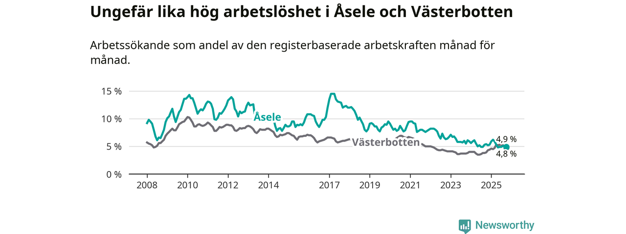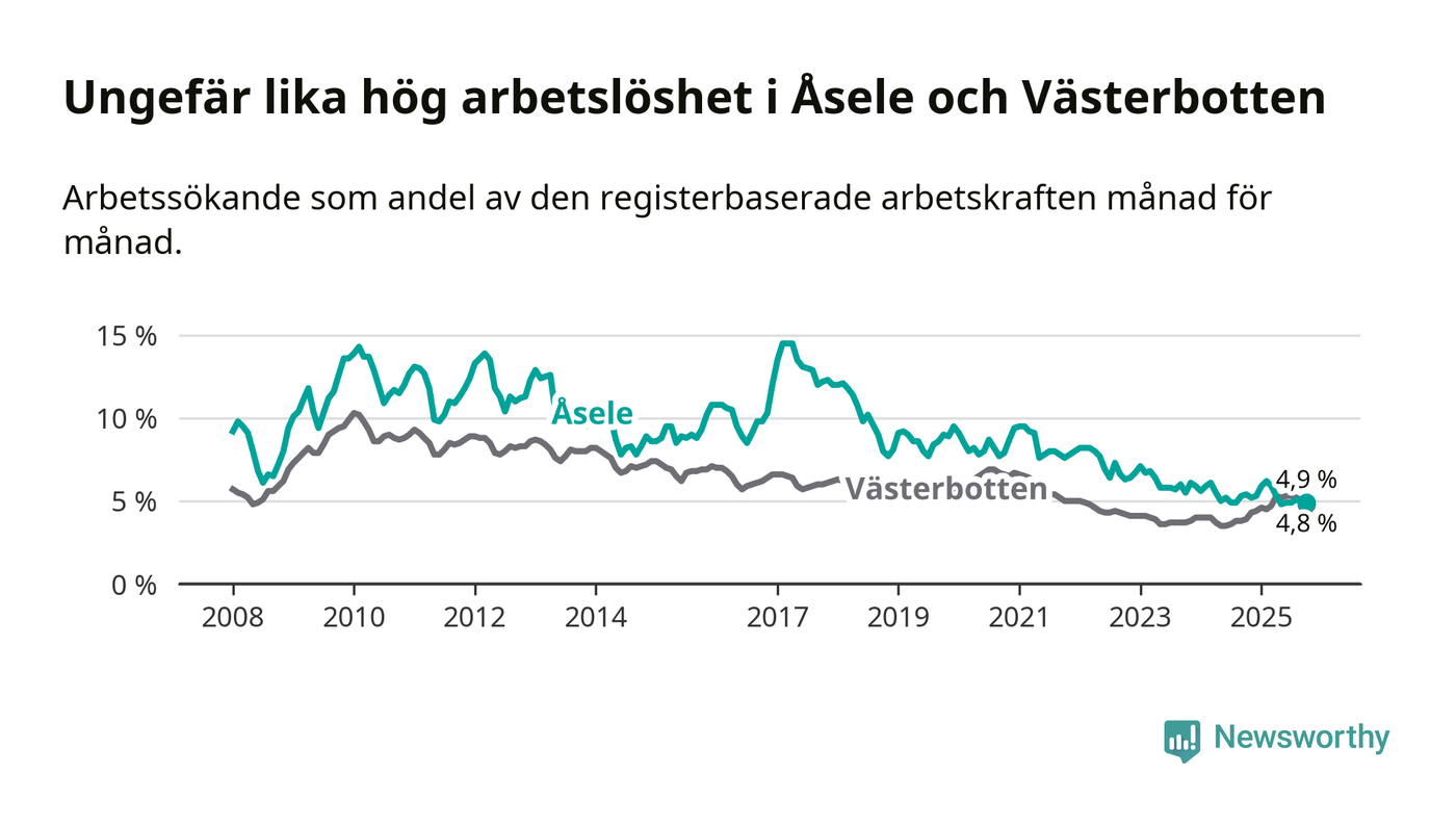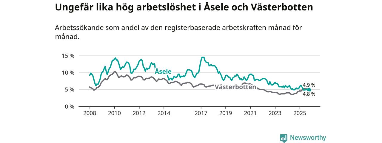 Anmärkningsvärt är att arbetslösheten nu, för första gången sedan juli 2023, är högre i Åsele än snittet i Västerbotten.
